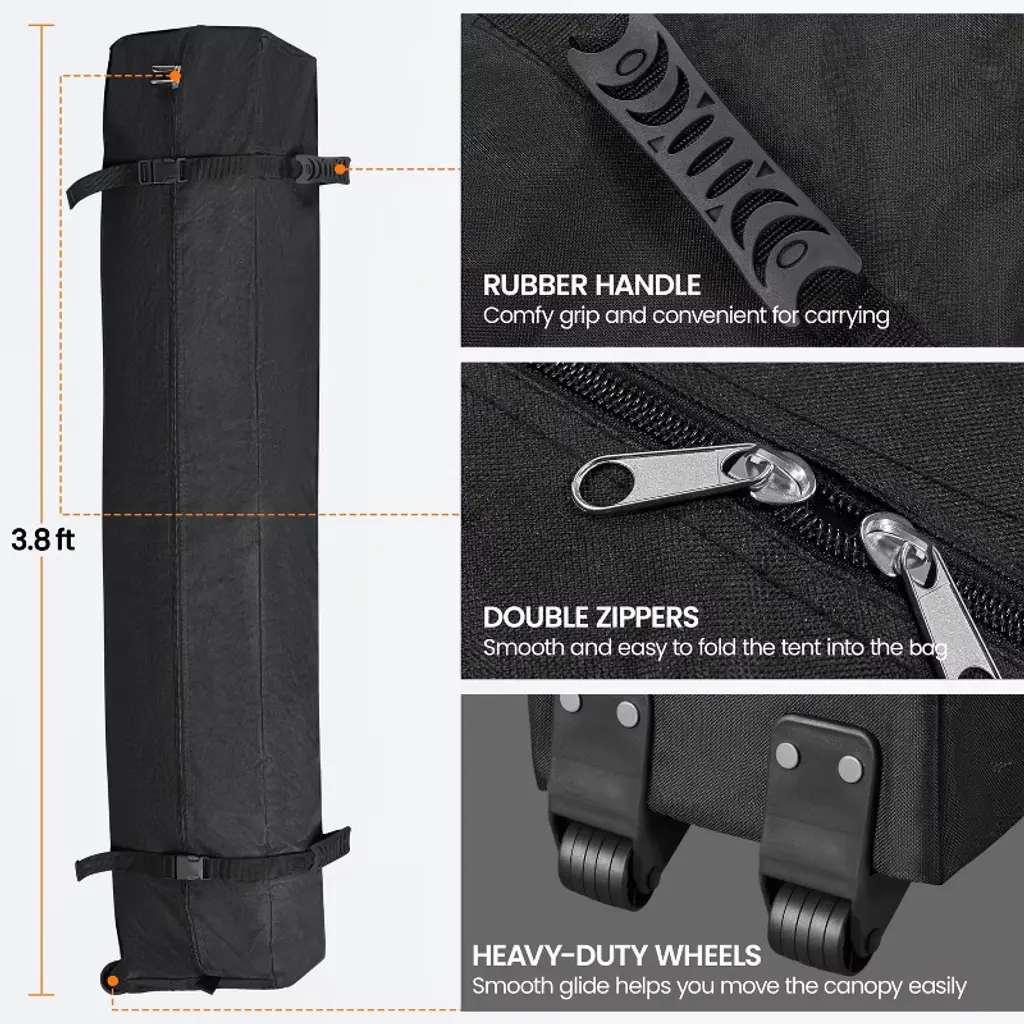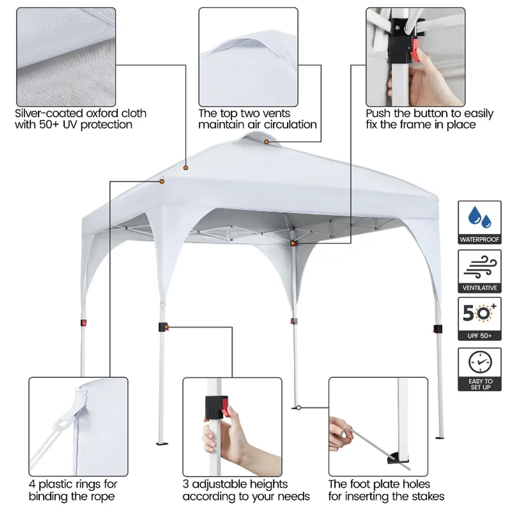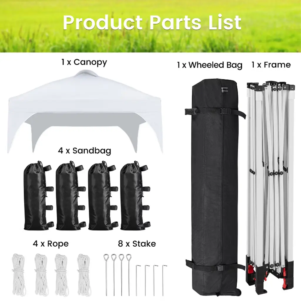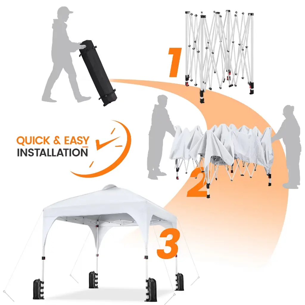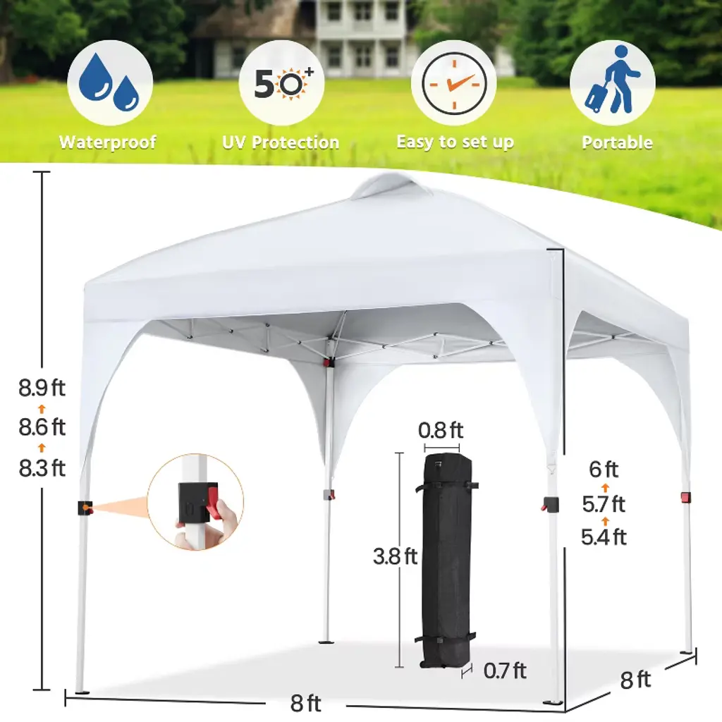 Get ready to elevate your outdoor events with comfort! This 8ft × 8ft Portable Pop-Up Canopy is designed to add a splash of joy to all your gatherings. Crafted from durable polyester canopy fabric with a UPF 50+ UV protective coating, this canopy provides a cozy and shaded haven for outdoor activities. The powder-coated steel frame and truss ensure durability and sturdiness. For added wind resistance, the extra covers on the four legs act as windbreaks to reduce the wind force that hits the legs directly. Compact and convenient, this canopy can be easily folded down to a manageable size when stored in the included roller bag, making it your hassle-free companion for on-the-go adventures. The canopy set includes 4 guy lines, 8 metal ground anchors, and 4 sandbags for convenience and safety. * Specifications: Canopy Color: White, Blue, BlackMaterials: Powder-coated Steel, Polyester FabricAssembled Dimensions: 8' L × 8' W × 8.3-8.9' HAdjustable Canopy Height: 8.3', 8.6', 8.9'Roller Bag: 0.8' L × 0.7' W × 3.8' H Please see the image for exact measurements.Please allow measuring deviation due to manual measurement.For optimal performance and safety, do not use this canopy in conditions of strong breeze, continuous light rain, heavy rain, or any other extreme weather scenarios.Please anchor the canopy to the ground when in use.Two or more adults are needed to set up/take down this canopy tent.