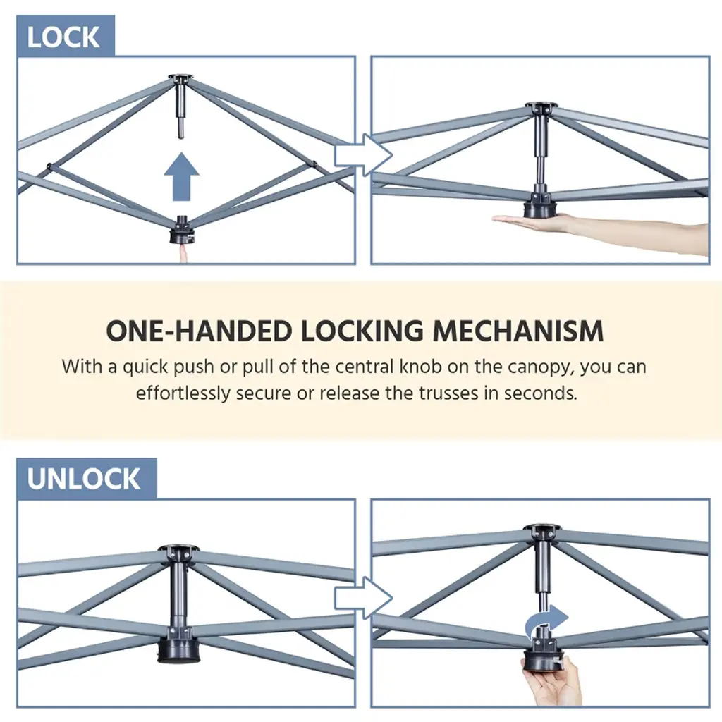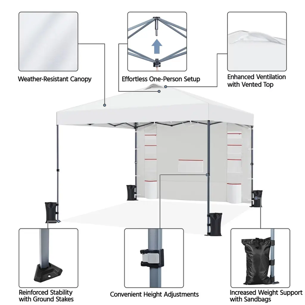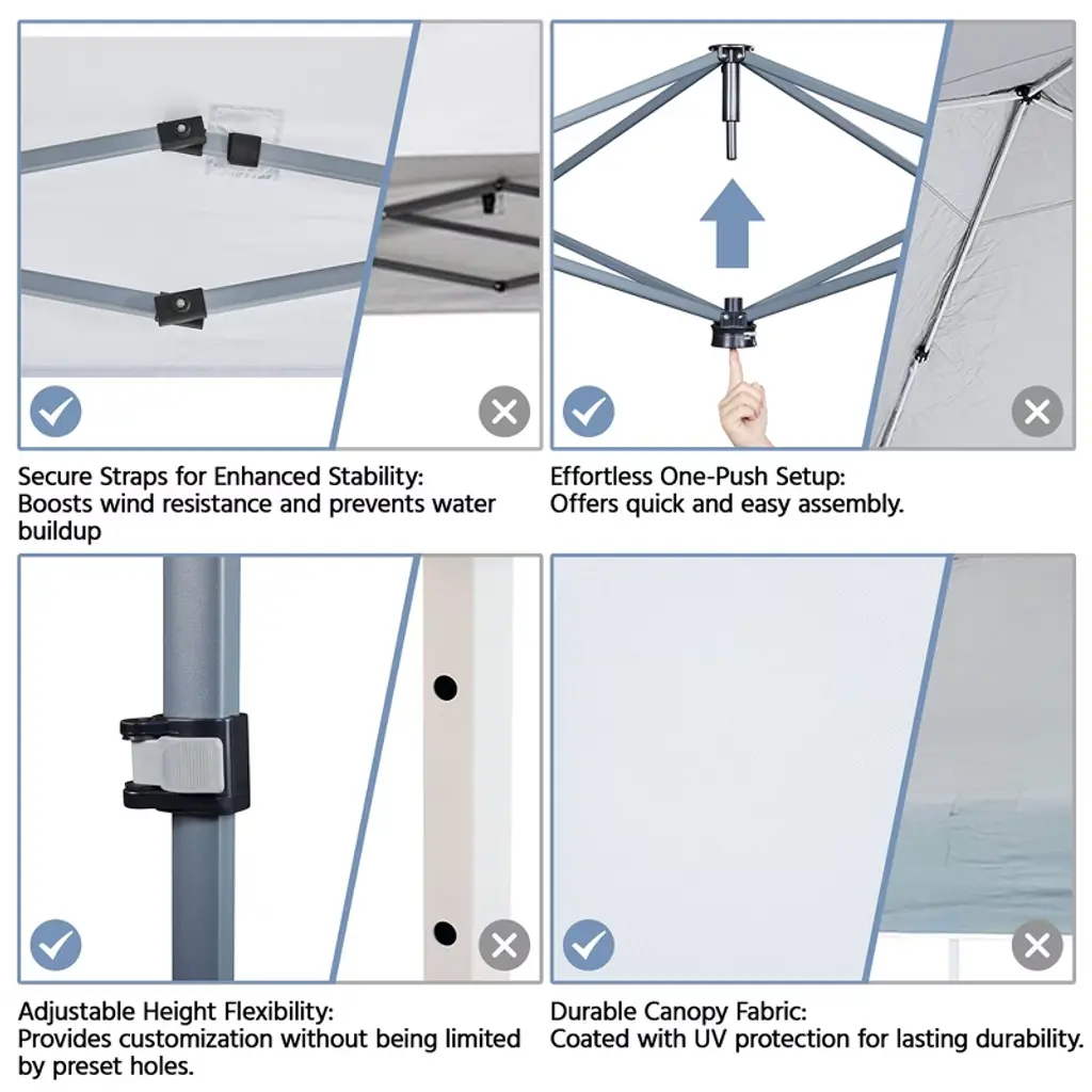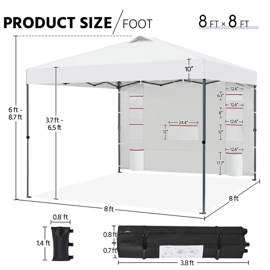 Beat the heat with this 8ft × 8ft Pop-Up Canopy! Built with rugged silver-lined Oxford fabric and a sturdy powder-coated steel frame, this instant canopy tent shields you from the scorching sunlight while ensuring durability. The one-push-to-lock mechanism simplifies the setup for you, and the freely adjustable height (6′ to 8.7′) lets you find your ideal fit. For added functionality, the canopy features a versatile sidewall that not only enhances wind, sun, and privacy protection but also includes nine varied-sized storage pockets and a handy hanging strap—ideal for keeping everything from small essentials to volleyballs or rackets neatly organized and within easy reach. Whether it’s a backyard hangout, beach party, or outdoor event, this canopy comfortably shades four to eight people. Better yet, it comes fully equipped with a roller bag, guy lines, ground anchors, and sandbags to keep things steady and convenient. *Specifications: Canopy Color: White; BlueMaterials: Powder-Coated Steel, Polyester FabricAssembled Dimensions: 8′ L × 8′ W × 6-8.7′ H Roller Bag: 9″ L × 8.3″ W × 45.7″ H Zipper Pocket: 12.6″ L × 6.3″ WSmall Mesh Pocket: 12.6″ L × 8″ WMedium Mesh Pocket: 12.6″ L × 12″ WLarge Mesh Pocket: 24.4″ L × 12″ WLarge Pocket: 17.7″ L × 12.6″ W Please see the image for exact measurement. Please allow measuring deviation due to manual measurement.For optimal performance and safety, do not use this canopy in conditions of strong breeze, continuous light rain, heavy rain, or any other extreme weather scenarios.Please anchor the canopy to the ground when in use.When disassembling the canopy tent, start by separating the hook and loop fasteners that secure the canopy fabric to the frame.