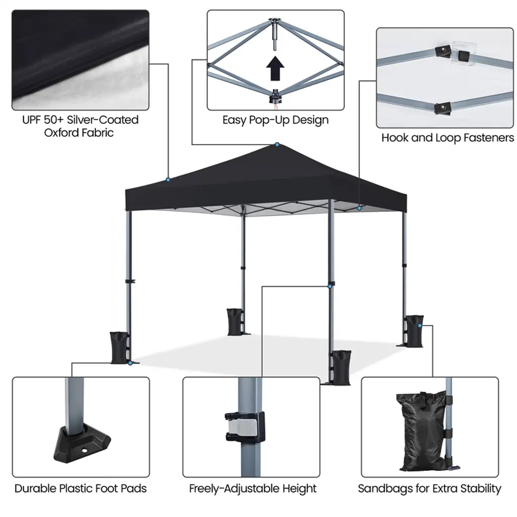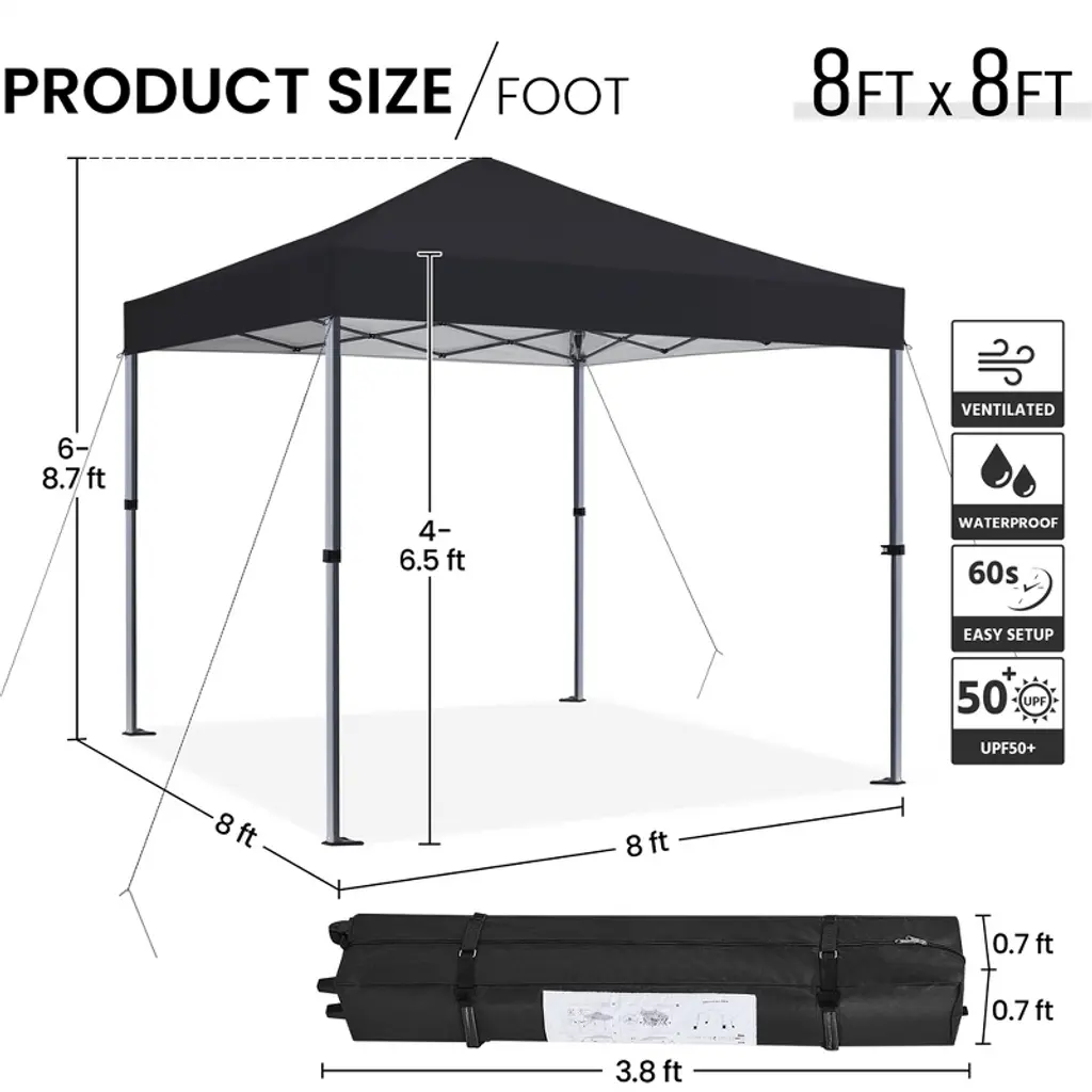 Block the unpleasant heat away with this 8ft × 8ft pop-up canopy! Constructed of UPF 50+ Oxford fabric with silver lining and powder-coated steel frame, this canopy boasts high weather resistance and strength. The one-push-to-lock mechanism allows for a simple setup. The canopy can be fixed at any height from 6' to 8.7' freely. This versatile 8×8ft canopy creates a large, cozy, shady area for 8-10 people in your backyard/driveway, garage sales, or other commercial events. A roller bag, 4 guy lines, 8 metal ground anchors, and 4 sandbags are included for your convenience. * Specifications: Canopy Color: White, Blue, BlackMaterials: Powder-coated Steel, Polyester FabricAssembled Dimensions: 8' L × 8' W × 6-8.7' H Roller Bag: 0.7' L × 0.7' W × 3.8' H 1. Please allow measuring deviation due to manual measurement.2. For optimal performance and safety, do not use this canopy in conditions of strong breeze, continuous light rain, heavy rain, or any other extreme weather scenarios.3. Please anchor the canopy to the ground when in use.4. Two or more adults are needed to set up/take down this canopy tent.5. When disassembling the canopy tent, start by separating the hook and loop fasteners that secure the canopy fabric to the frame.6. Please see the image for exact measurements.