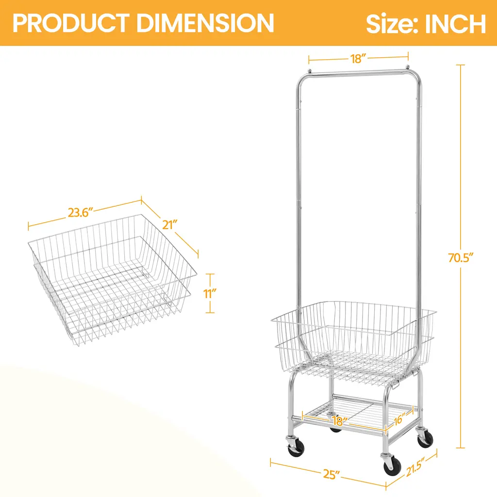 Tired of traditional laundry bags/baskets/hampers? Upgrade your laundry experience today! Crafted from durable metal construction, this elevated laundry cart with basket ensures a long-lasting use. Three separate layers cater to your diverse laundry needs: wet and dry hanging, primary sorting, and racking. At a comfortable height of 179 cm (70.5 inches), it minimizes bending and discomfort. Ideal for various settings—home bathrooms, laundry rooms, hotels, restaurants, and laundry stores. Features:Specifications:Note: Please allow a 1/2″ measurement tolerance.