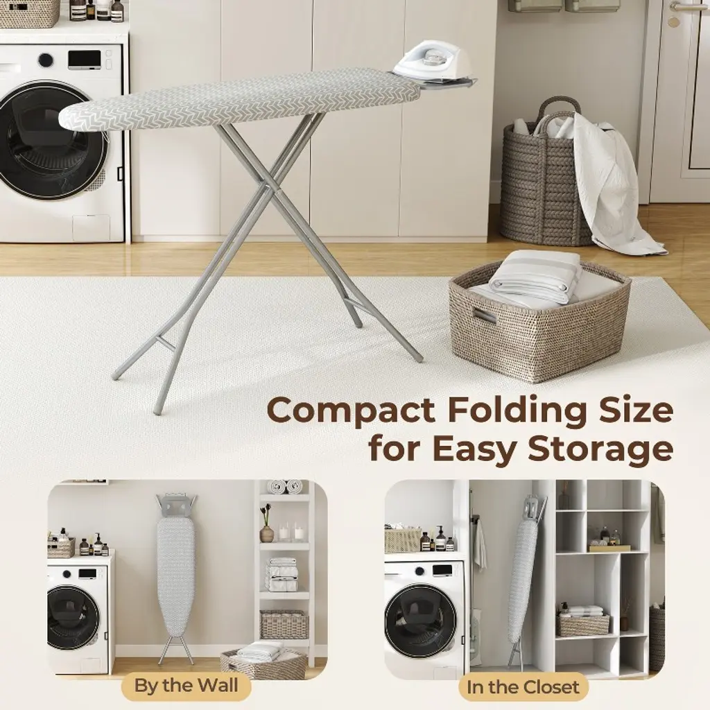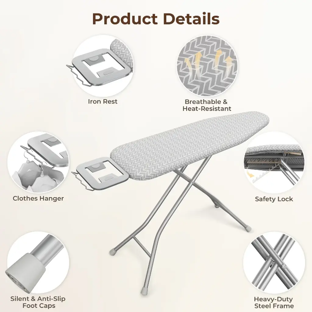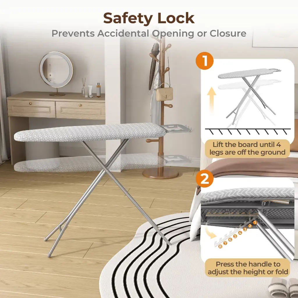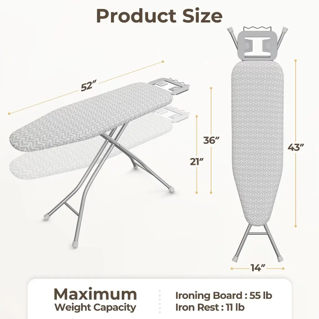 This full-size ironing board offers a spacious surface for effortless ironing, ideal for handling larger garments. Its flared durable steel legs provide enhanced stability, while protective foot pads prevent floor scratches. With nine adjustable height levels, you can customize the board for your comfort. The multi-layer padding and a heat-resistant mesh ensure a smooth ironing experience. The board’s foldable, lightweight design makes it easy to store, while an added iron rest improves functionality. Plus, a safety lock provides extra safety when operating its height, making this board ideal for use in various rooms like bedrooms and laundry areas. *Specifications: Color: Gray; Beige; Gray&White, Blue Materials: Powder-coated Steel, Foam, FabricAssembled Dimensions: 52" L × 14" W × 36" HFolded Dimensions: 61.5" L × 14" W × 2.5" HAdjustable Height: 21-36“Ironing Board: 43” L × 14“ WIron Rest: 10.3“ L × 7.5“ WMaximum Weight Capacity:Ironing Board: 55 lbIron Rest: 11 lb Note: Installation is necessary for product functionality.Please see the image for exact measurements.Please allow a 1/2" measurement tolerance.