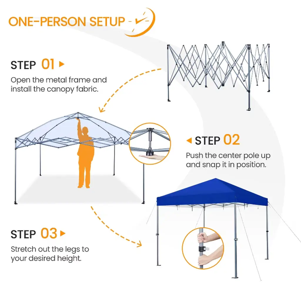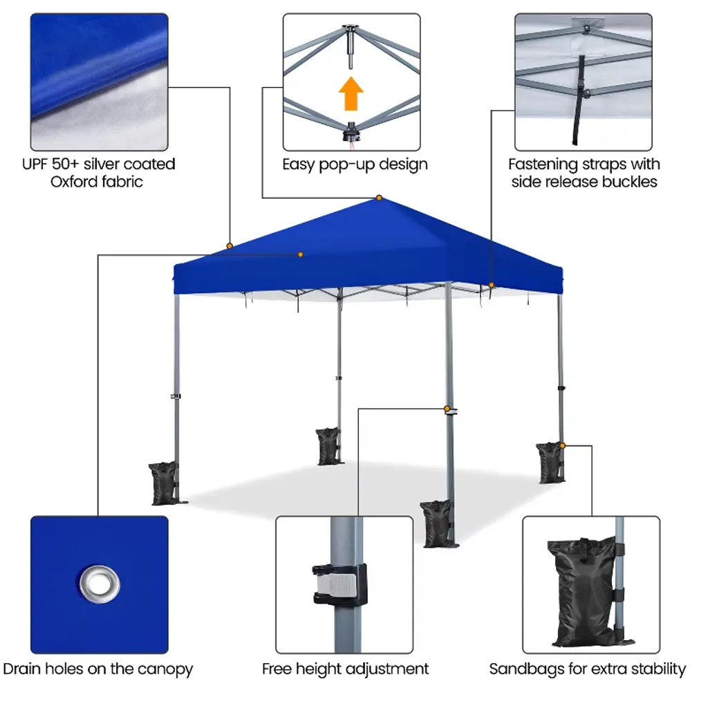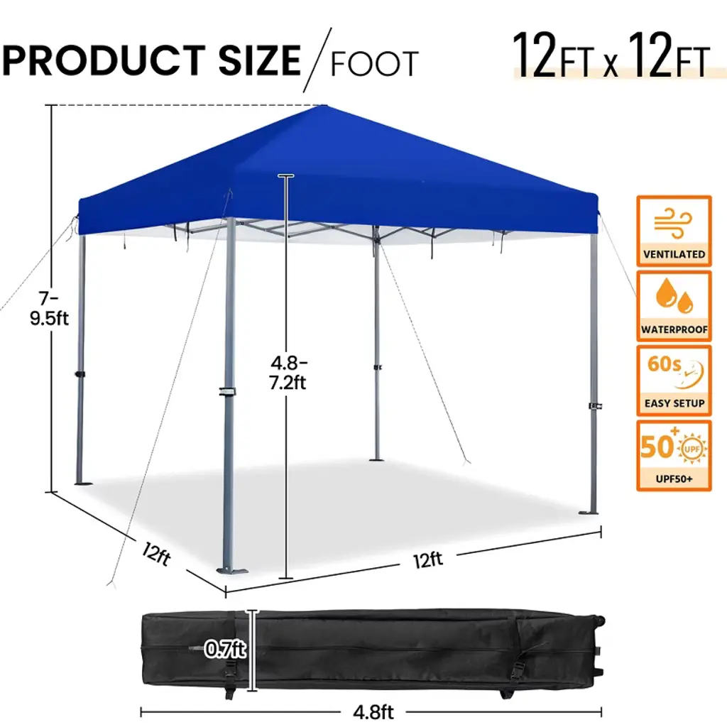 Constructed of UPF 50+ Oxford fabric with silver lining and powder-coated steel bracket, this canopy boasts high weather resistance and strength. The one-handed locking mechanism allows for a simple setup that can be completed by one adult. The canopy can be fixed at any height from 84inch to 114inch freely. This versatile 12x12' canopy can create a large cozy shady area for 12 to 18 people in your backyard/driveway or garage sales or other commercial events. Specifications: Color: White, Blue, Black, Dark GrayMaterial: oxford fabric, powder-coated metalOverall dimensions: 144 x 144 x 114inch (L x W x H)Wheeled bag: 8.4 x 8.4 x 57.6 (L x W x H)1. Please see the image for exact measurements.2. Please don’t use this canopy in a strong breeze, continuous light rain, heavy rain or other extreme weather conditions.3. Sandbags are suggested to incorporate.
