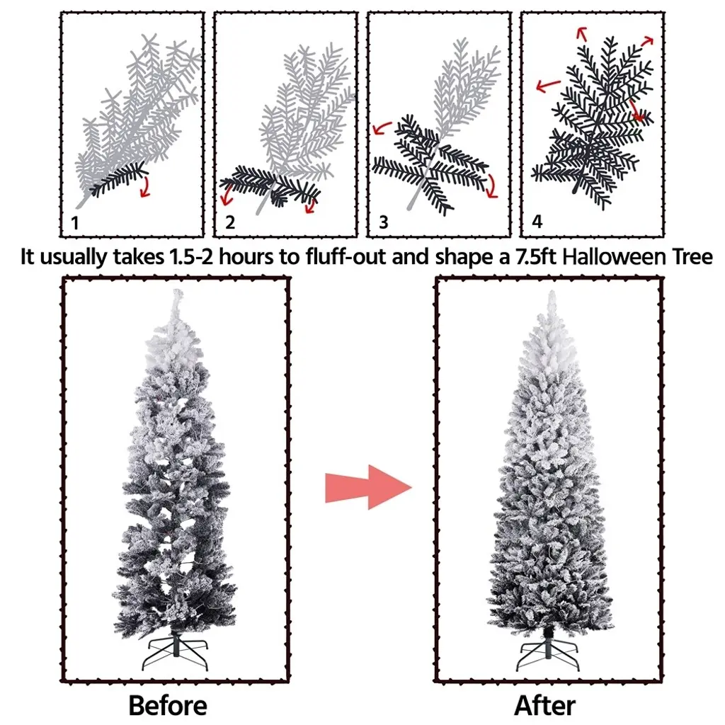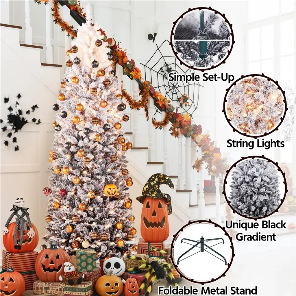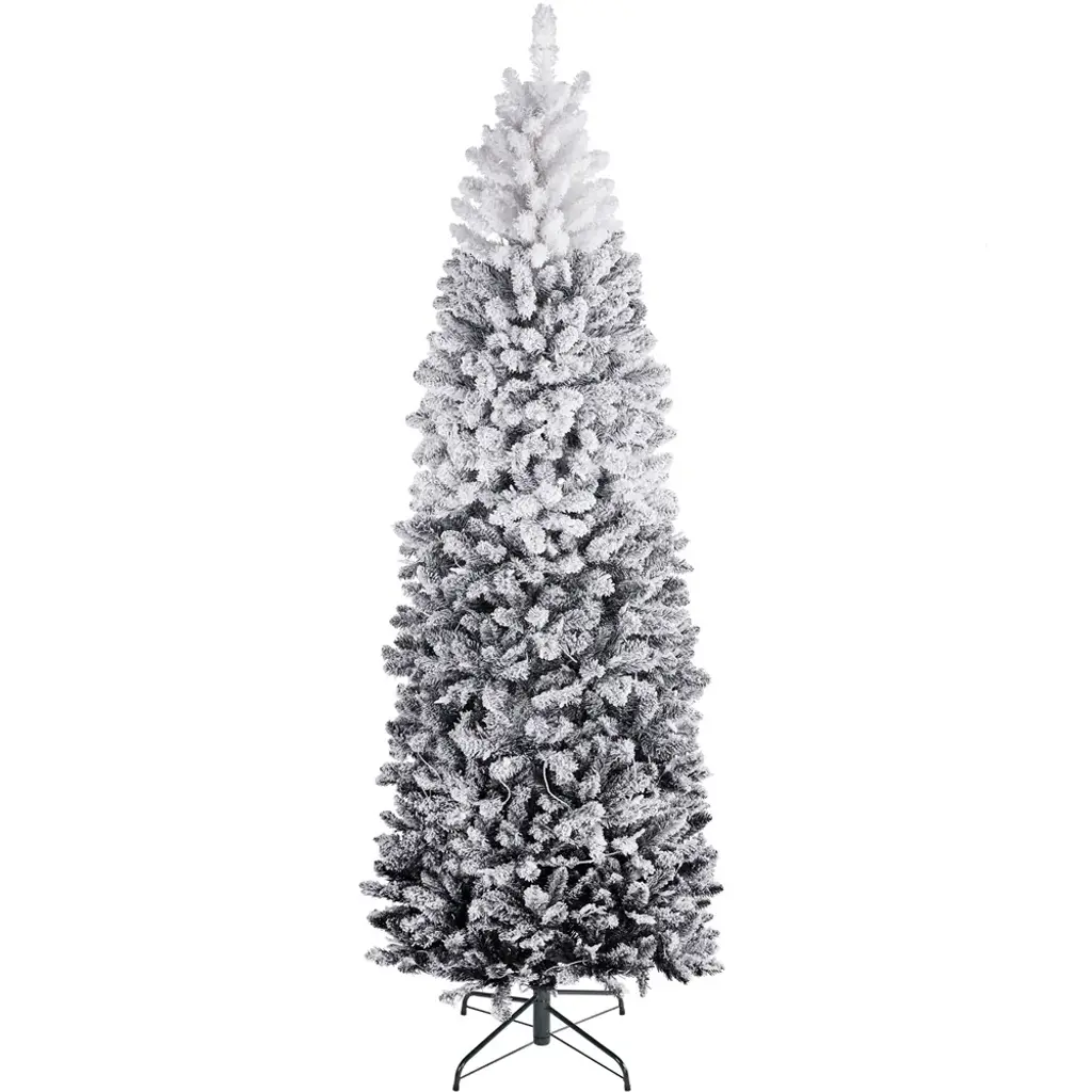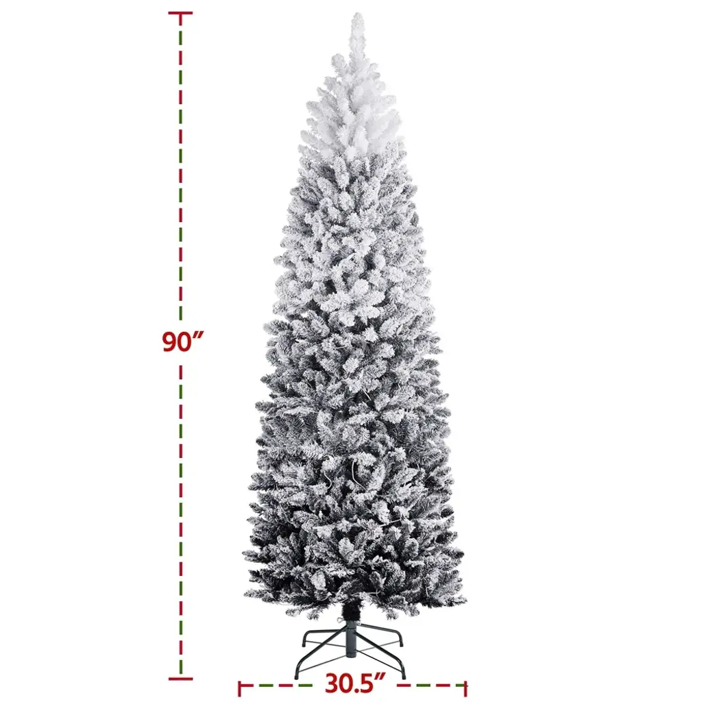 This pencil artificial Christmas tree with lights is a timeless and space-saving option for your home. The snow-dusted branch tips are made of high-quality PVC, which makes them durable and flexible. The lush man-made leaves give the tree a full and realistic appearance, adding a touch of winter holiday charm to your place. The clear warm lights on the tree create a festive and peaceful atmosphere. The tree comes with a foldable metal stand that is easy to carry and store. It is sturdy enough to hold extra ornaments; you can customize it according to your preferences.Features:*Full-body Look: This artificial Christmas tree has plentiful branches and tips that make itself full and fluffy. Lush branch tips present a thick and realistic overall look, which also brings the holiday vibe to your designated place.*Snowy Winter Charm: Snow-flocked Christmas tree refers to a white Christmas and creates a classic and traditional atmosphere. Snow-dusted branch tips give a thicker and heavier image that indicates a festive and fulfilling holiday is on its way.*Long-lasting Lights: There are lights scattered inside the branches and tips to create a warm tone for your dinner. These lights are battery-operated and durable enough to use all day and night.*Space-saving Solution: Our slim artificial Christmas tree is an ideal choice for limited living space. Most people choose a pencil-shaped artificial Christmas tree, one of the classic types.*DIY-free: Each branch tip can be bent and set at will. These branch tips are strong enough to hold plenty of extra ornaments. We hope you can enjoy a sweet fun time decorating this pencil-flocked Christmas tree with your family and loved ones.*Durable Materials: This pre-lit pencil Christmas tree is crafted from high-quality PVC and has a sturdy metal support frame. The long-lasting lights and wide metal stand to make it fire-resistant and less likely to collapse. The flexible and durable branches and tips also prevent them from falling on the floor like a real tree.*Foldable Stand: The stand can be folded for convenient carriage and storage when it is not in use. It is also wide and sturdy enough to make this prelit pencil Christmas tree stands still instead of tipping over.*Easy Assembly: This prelit flocked artificial Christmas tree is built based on a hinged system. The least assembling skills are required to set up this pencil Christmas tree. The package provides all the necessary hardware and handy tools, including well-illustrated instructions.