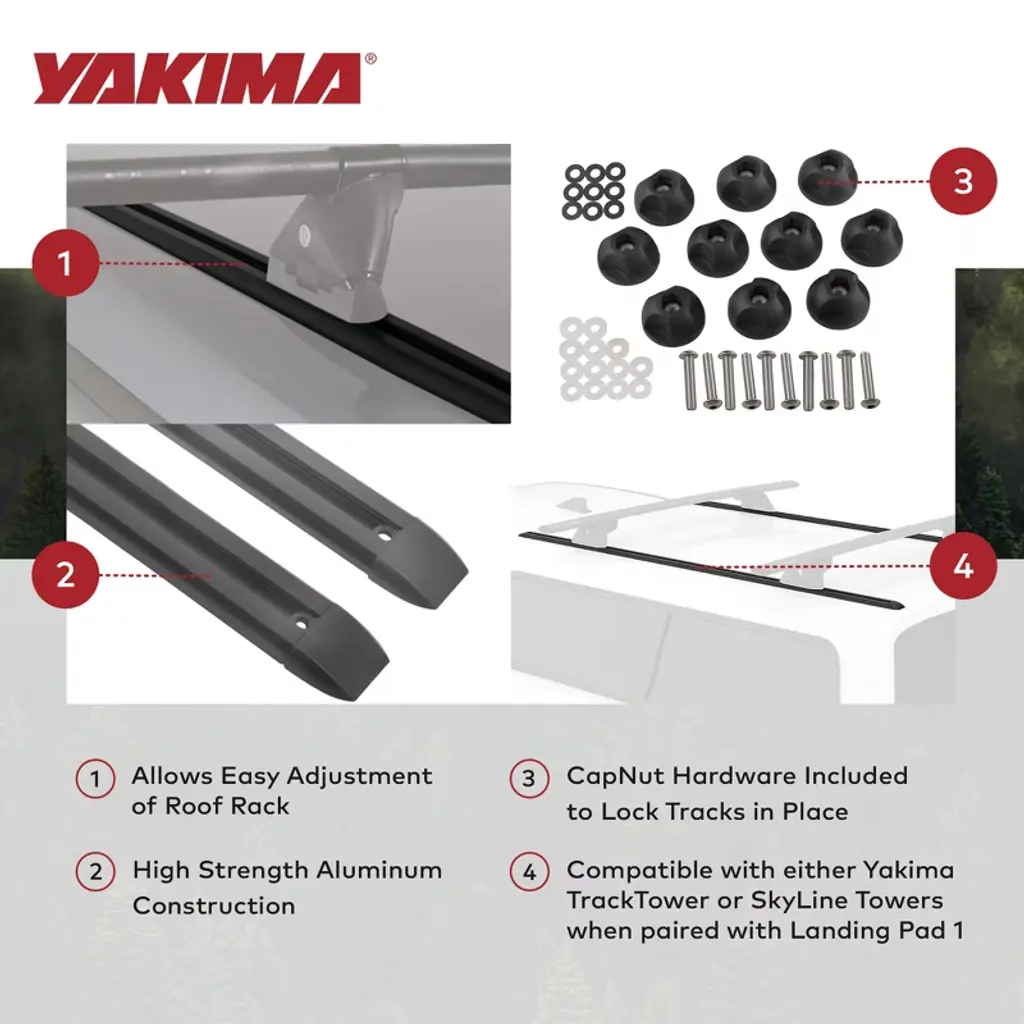 Enhance your adventures with the Yakima 60-Inch Tracks with CapNuts for Custom Install Roof Rack Systems, the pinnacle of versatility and seamless integration for your rooftop rack system. With their easy connectivity and sleek, low-profile design, these tracks redefine convenience. Crafted for adaptability, the Yakima tracks effortlessly merge with either the Yakima TrackTower or SkyLine towers (sold separately), creating an adjustable base when paired with landing pad 1 while providing the foundation for a customized roof rack system. These tracks offer a comprehensive solution, enabling you to tailor your rooftop rack setup precisely to your needs. At a generous 60 inches in length, these tracks come complete with CapNut hardware, ensuring a direct, secure installation onto fiberglass surfaces. Their design isn't just functional but also a statement. The subtle, streamlined profile maintains a sleek aesthetic even when towers are removed, blending seamlessly with your vehicle's roofline. Installation is a breeze, taking only 60 minutes with some assembly required. Elevate your journeys, personalize your gear, and embark on your next escapade with confidence, courtesy of Yakima's innovative track system. Designed for the modern explorer seeking a seamless blend of functionality and style, the 60-Inch Tracks with CapNuts for Custom Install Roof Rack Systems from Yakima are the answer to a tailored rooftop adventure.