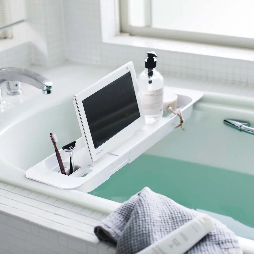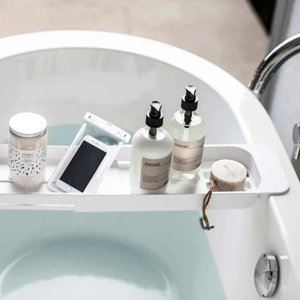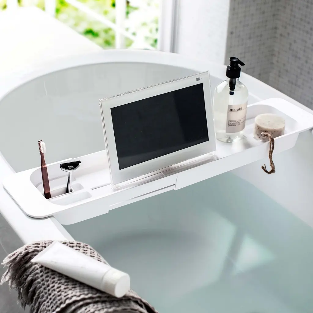 This collection features clean-lined essentials that are as good looking as they are functional. This bath caddy expands to fit most tubs, letting you keep soap, razors and even books or a glass of wine, within easy reach during bath time.