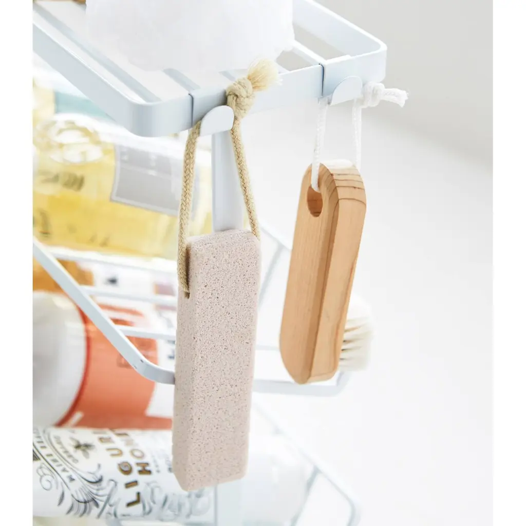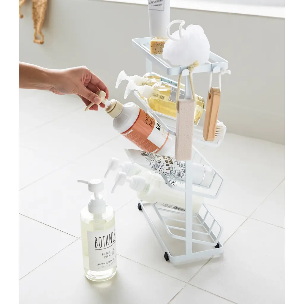 Make a splash with shower organization.Skip the wall holder and opt for a free-standing caddy with plenty of room for shampoo bottles, soaps, and other shower essentials. If you have lotions galore spilling over your bathtub, try a freestanding caddy like this one to declutter your bath area, because you deserve as many shampoos, soaps, and rubber duckies as you want! Hooks to hold loofahs, brushes, and other scrubbing devices.Three versions offer just what you're looking for. A short, standard version. A medium version with angled shelves to properly line up bottles. And a tall version for those light on floorspace but in need of maximum storage.