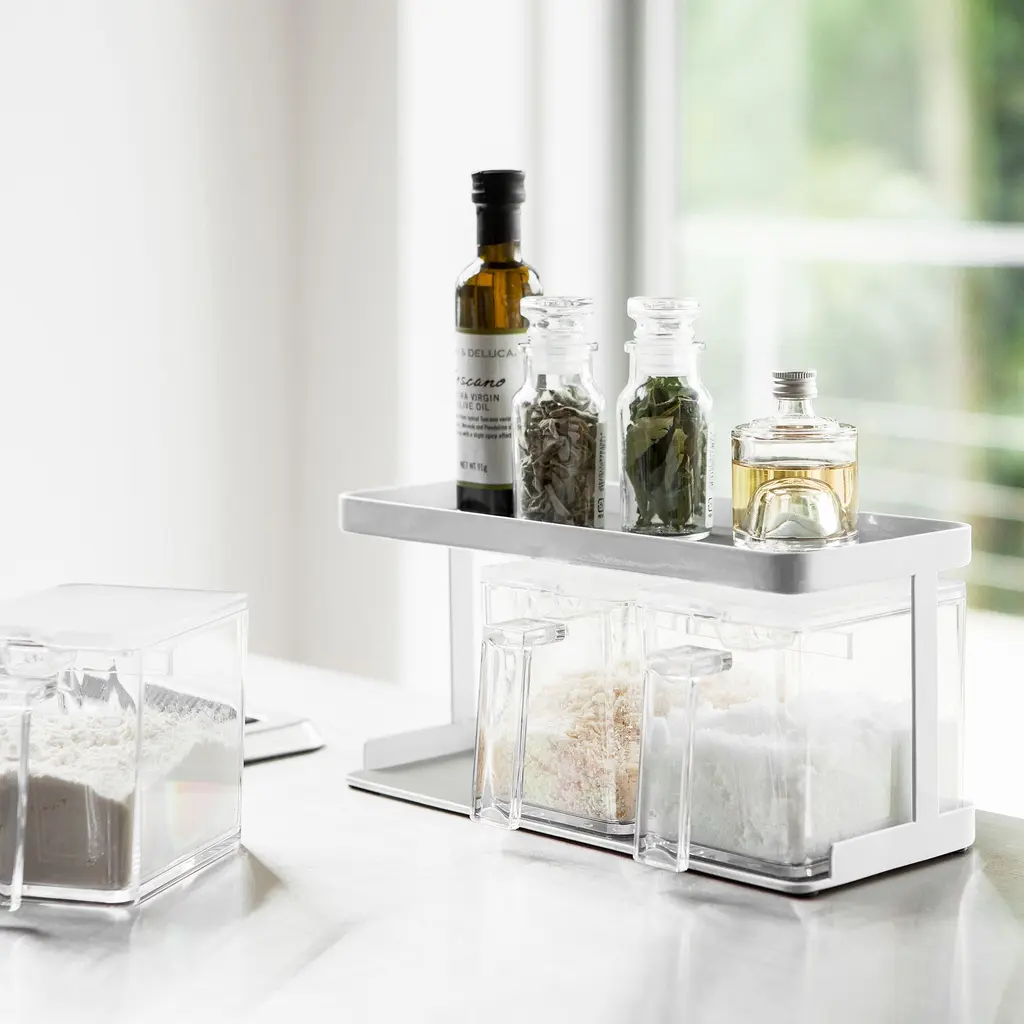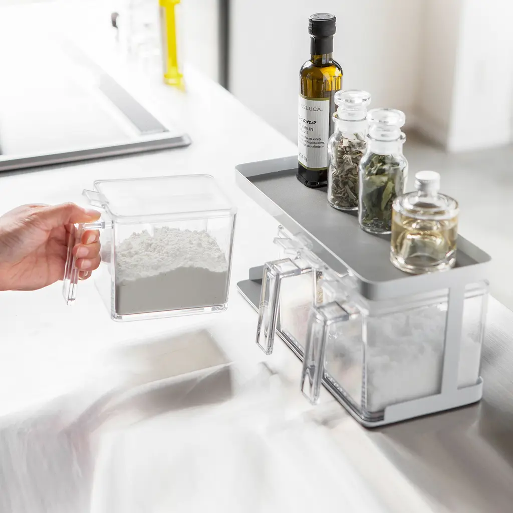 This collection features clean-lined essentials that are as good looking as they are functional. Keep baking essentials within reach and any other needed ingredients on hand and organized with a convenient steel rack on top.