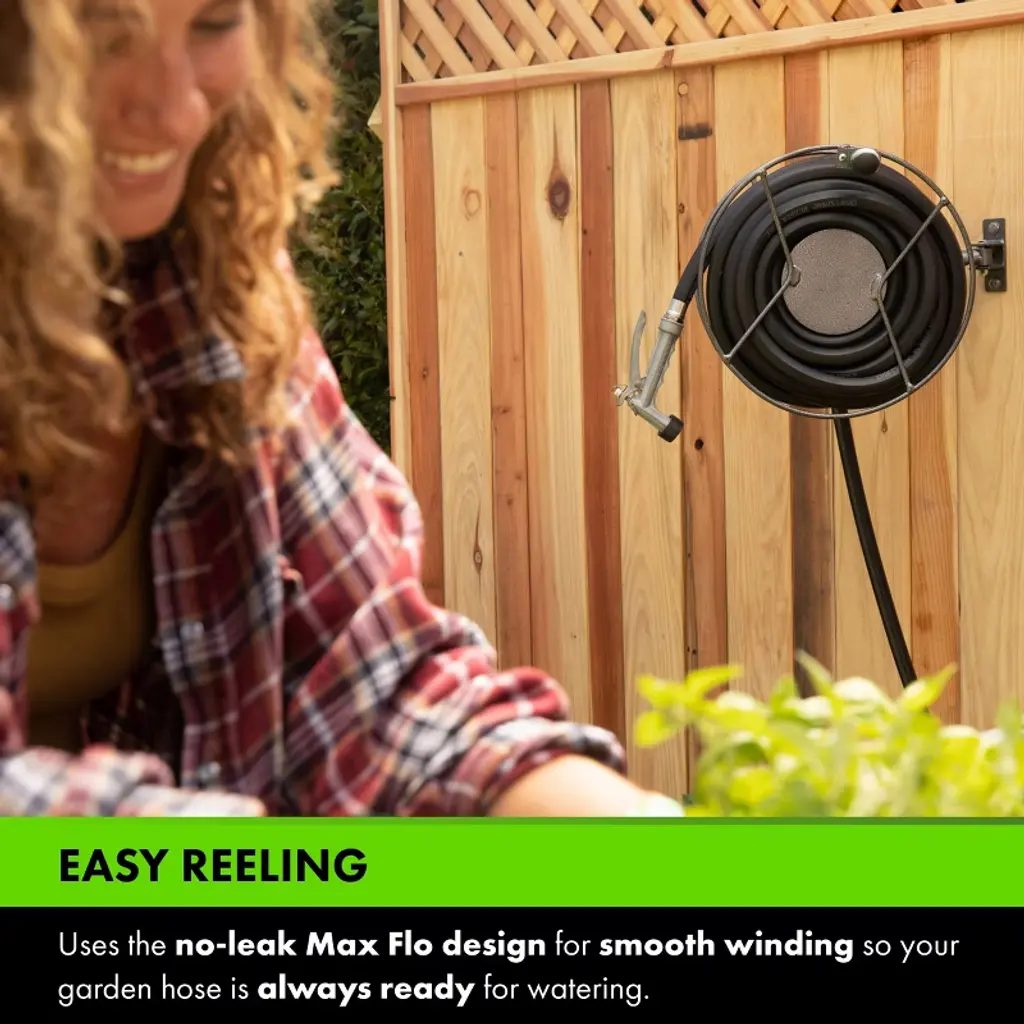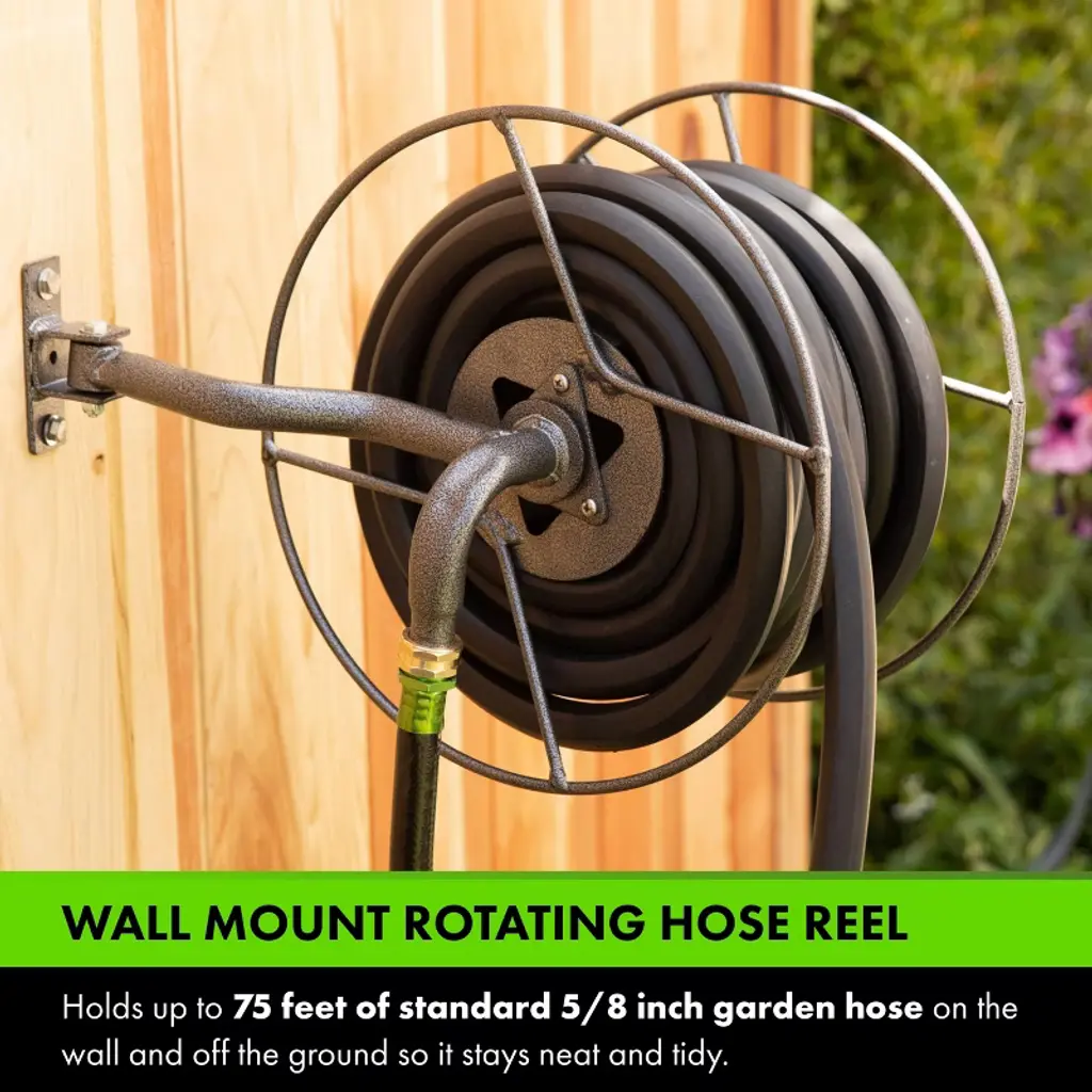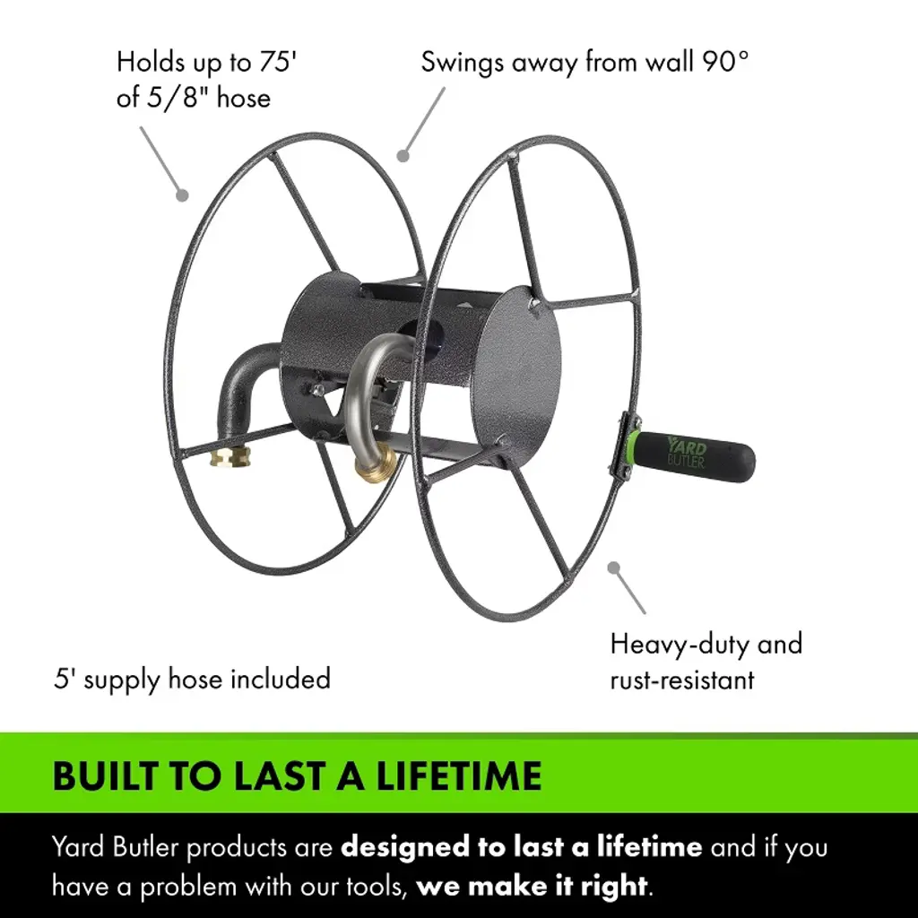Lightweight and compact, the Mighty Reel mounted swivel water hose holder is sturdy enough for any gardening zone. We designed our outside storage to fold up against the wall and swing out so you can unreel your hose and water more places. This metal hose caddy holds up to 75 feet, making it the best low-profile hose holders for outside option. Rust resistant powder coated steel is built for longevity. Make your garden hose last longer for worry-free watering.