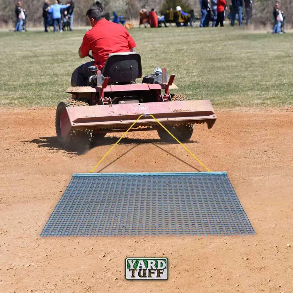Smooth out the rough patches in your life with this Yard Tuff 5' x 3' Surface Leveling Drag Mat. This bad boy levels out driveways, yards, parking lots, baseball diamonds, foot plots, and anywhere else you need an even surface. It shows off a 5 x 3 foot leveling surface to efficiently and effectively cover all sorts of ground. The drag mat makes your life easy by attaching to ATVs, UTVs, and utility tractors. Its heavy duty steel mesh and zinc plated finish will never poop out on you so you can have level surfaces for the rest of your life. Toss your rake and grab an ice cold beverage while you hop on your equipment to use this Yard Tuff 5' x 3' Surface Leveling Drag Mat.