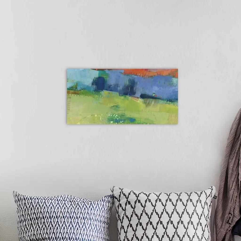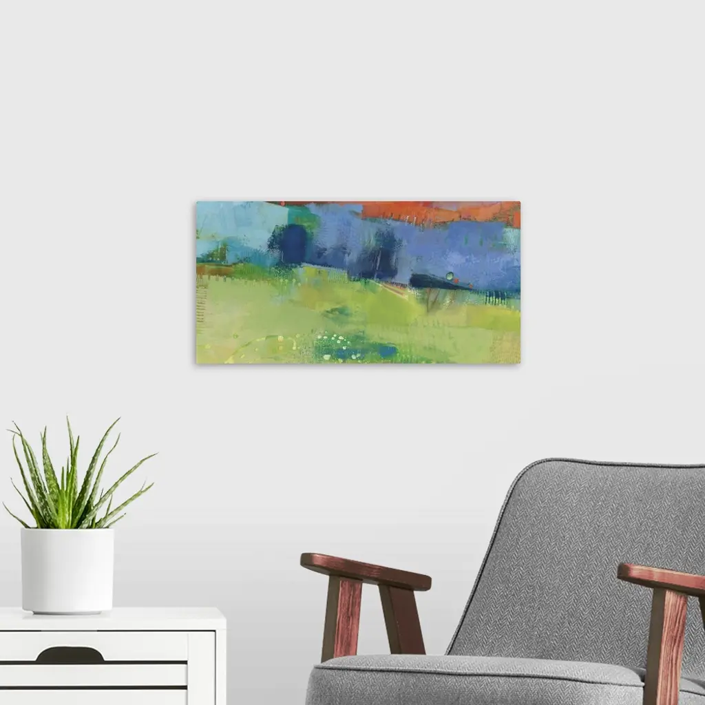 Abstract modern art print in cheerful shades of blue, orange, and green.