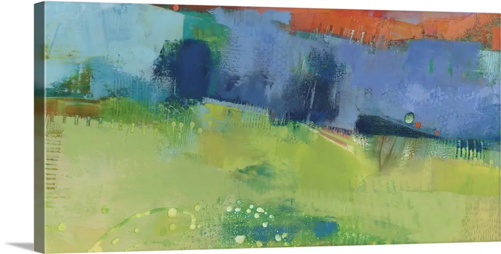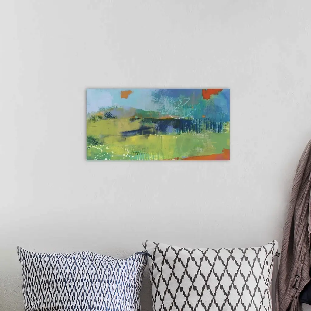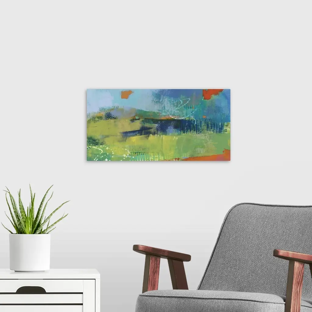 Abstract modern art print in cheerful shades of blue, orange, and green.