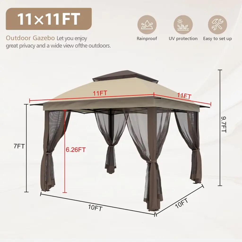 The YARDSIGHT 11x11 Pop-Up Gazebo Tent is a versatile and convenient outdoor canopy designed for quick setup and easy use. Made with water-resistant materials, this gazebo provides reliable protection from the elements while also offering mosquito netting to keep insects at bay. Its compact design makes it perfect for patios, gardens, backyards, and other outdoor spaces. Whether you're hosting a backyard party or simply enjoying a relaxing day outdoors, this pop-up gazebo is an ideal solution for creating a comfortable and protected area.