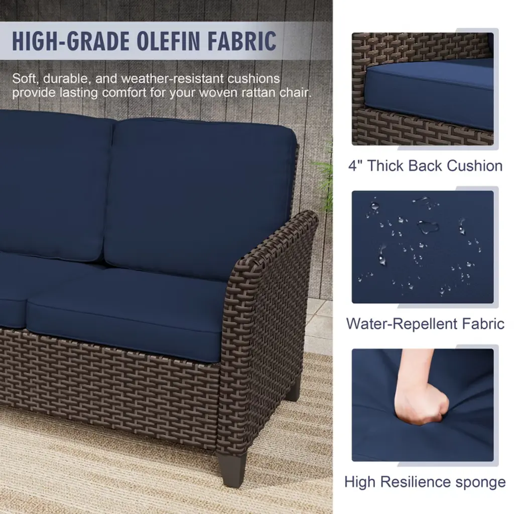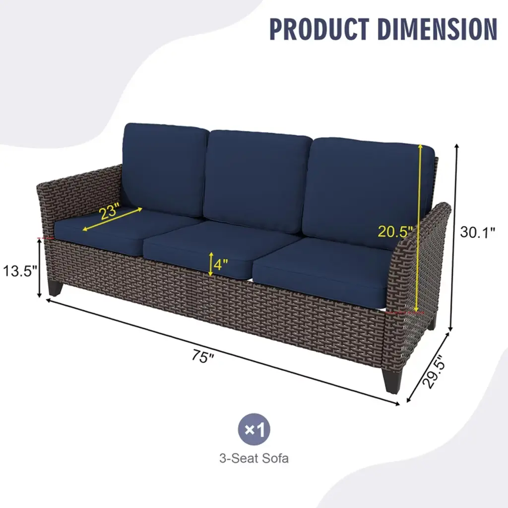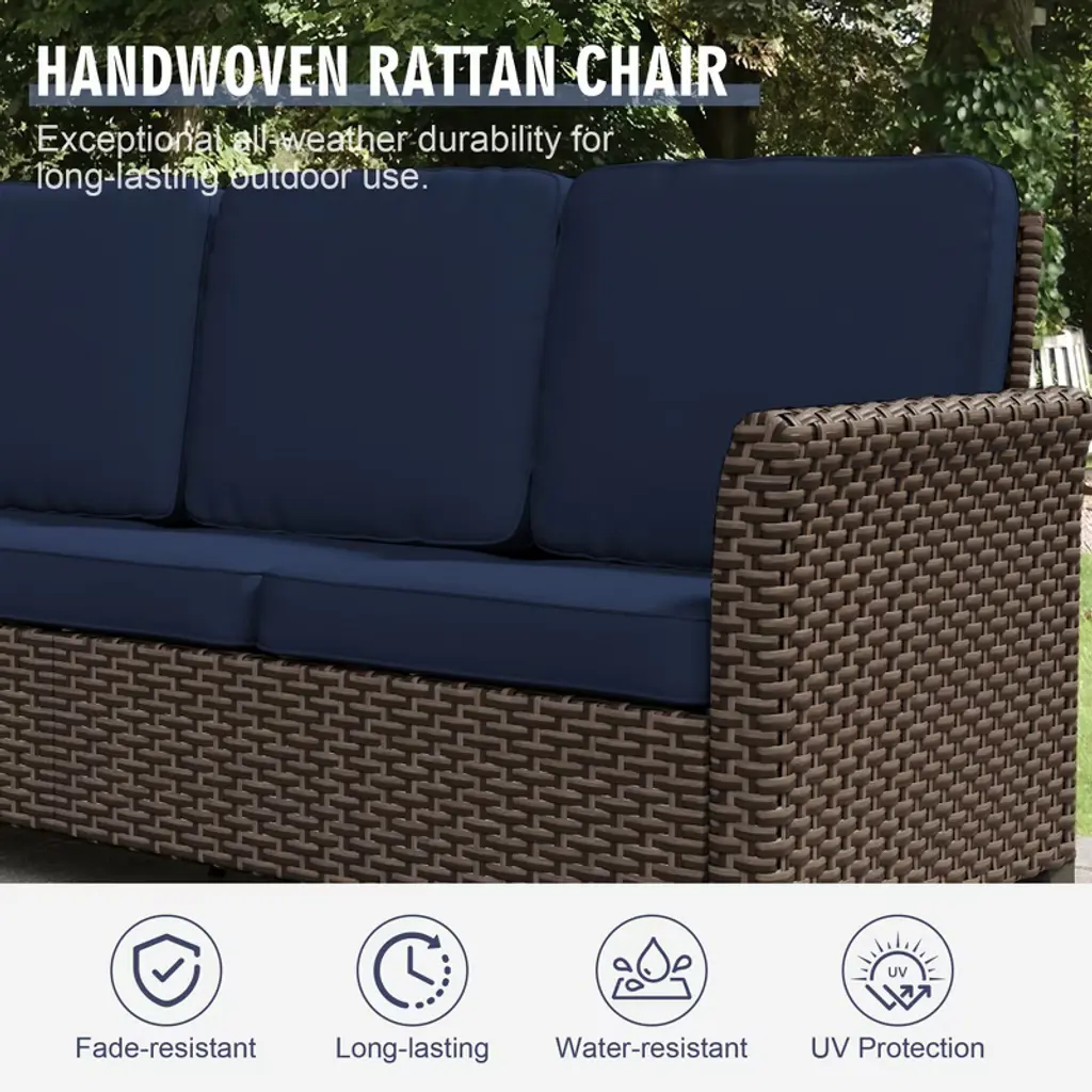 Discover our robust outdoor three-seat sofa, designed for both style and comfort. It features a rust-resistant steel frame and all-weather wicker, making it perfect for any outdoor setting. The thick cushions and oversized armrests offer unparalleled relaxation, while silicone anti-slip dots ensure stability. The ventilated cushion covers are easy to clean, enhancing the sofa¡¯s practicality. This sofa is the ultimate addition to elevate your outdoor space.