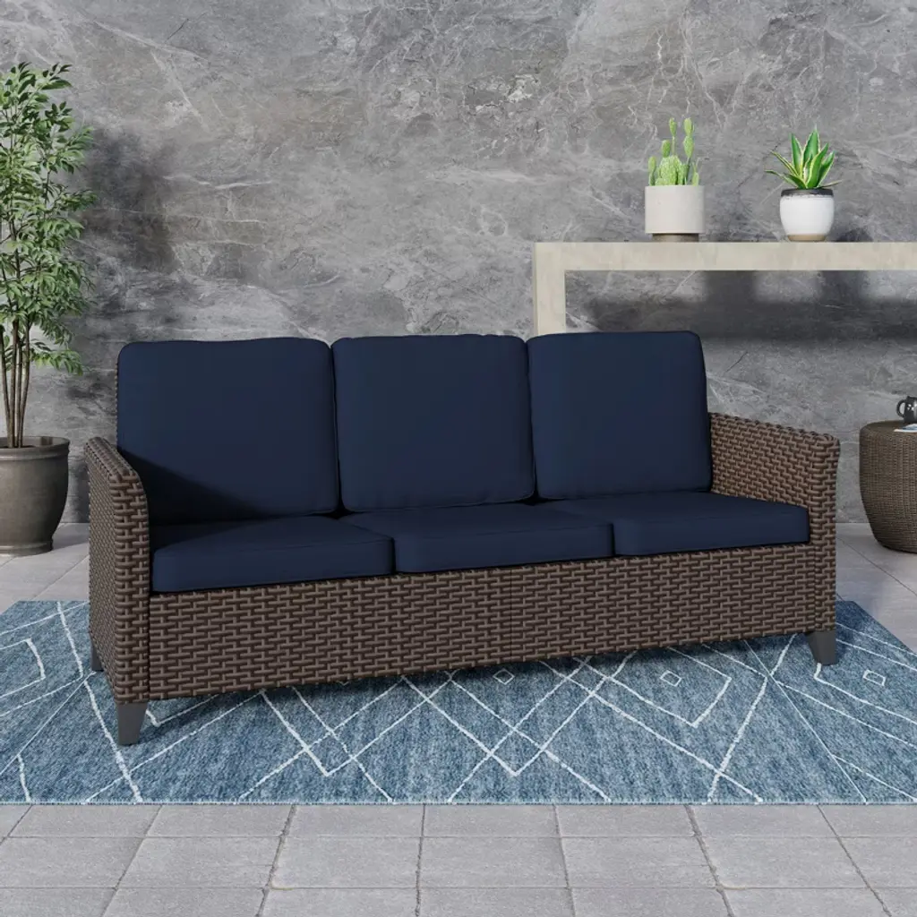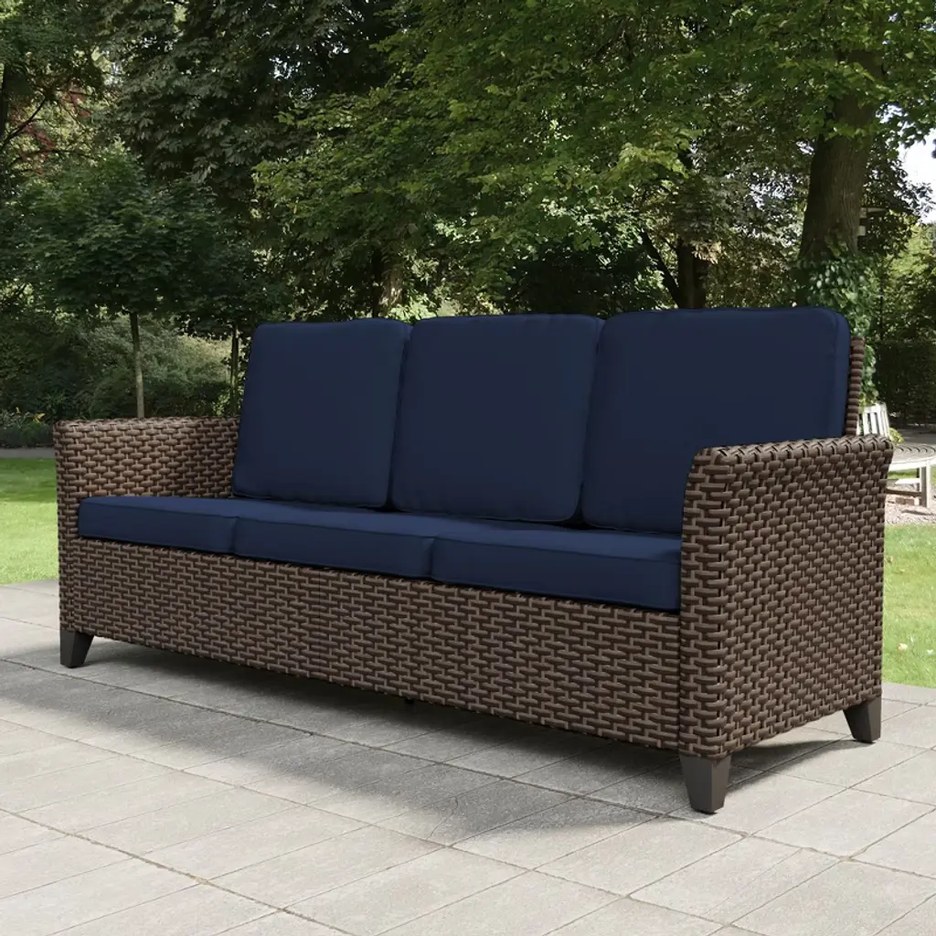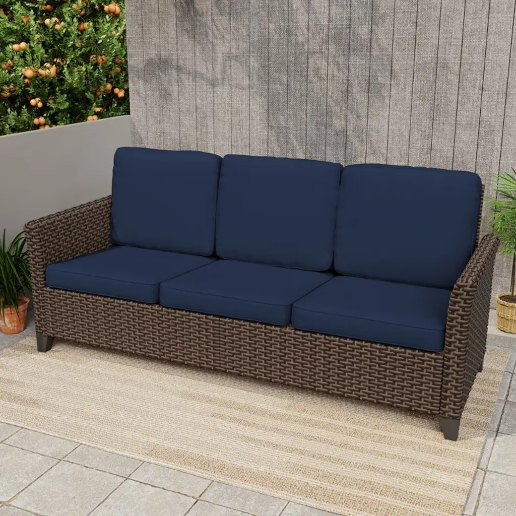 Discover our robust outdoor three-seat sofa, designed for both style and comfort. It features a rust-resistant steel frame and all-weather wicker, making it perfect for any outdoor setting. The thick cushions and oversized armrests offer unparalleled relaxation, while silicone anti-slip dots ensure stability. The ventilated cushion covers are easy to clean, enhancing the sofa¡¯s practicality. This sofa is the ultimate addition to elevate your outdoor space.