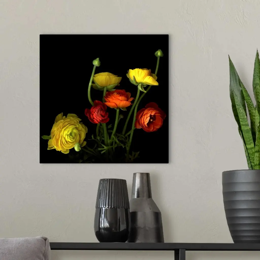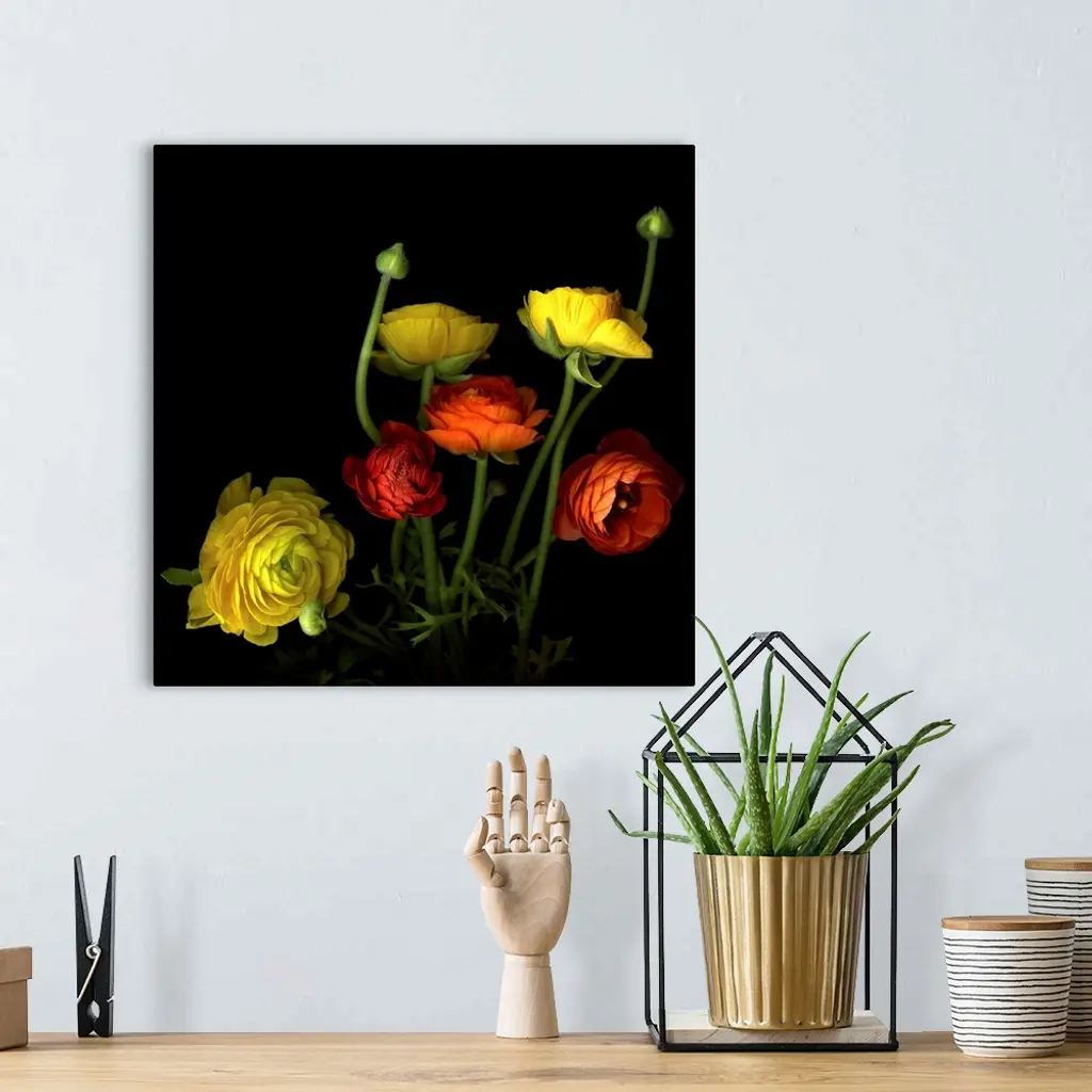 Wall art of a colorful bouquet of beautiful yellow and red flowers and buds.