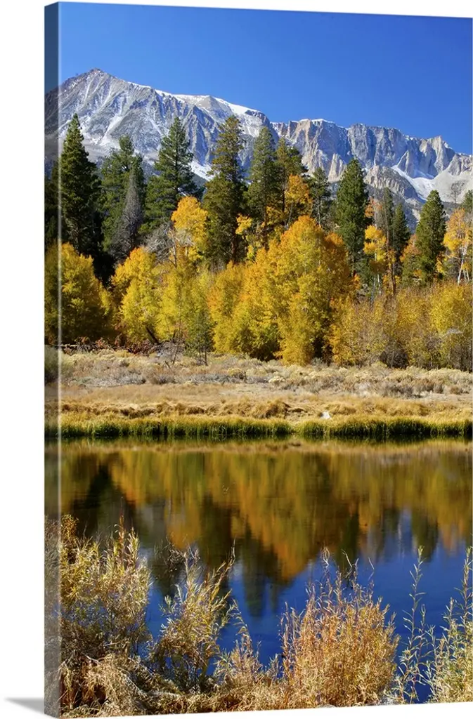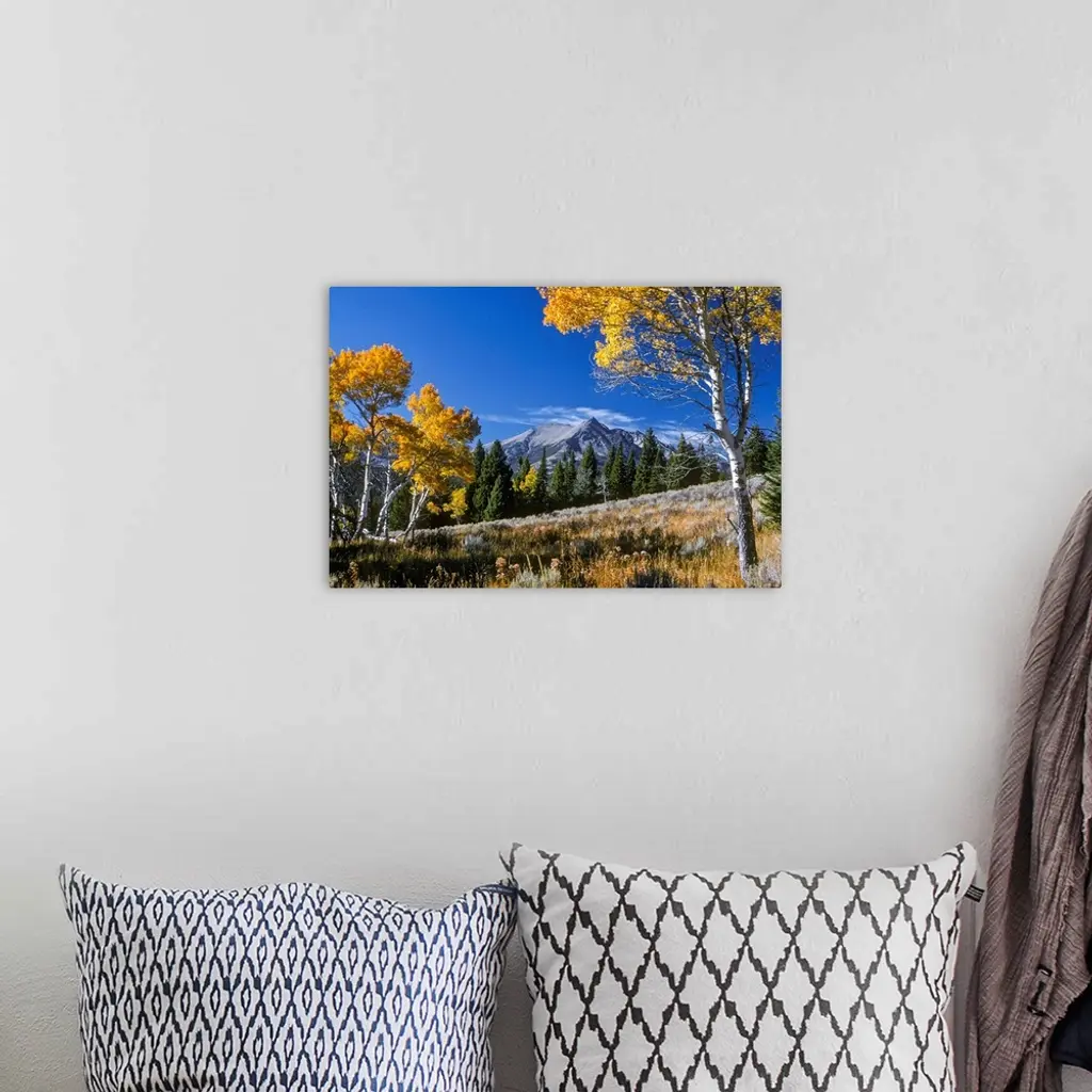 Vibrant yellow foliage on aspen trees and Electric Peak in the background, Gallatin Range in Yellowstone National Park, Montana, United States of America