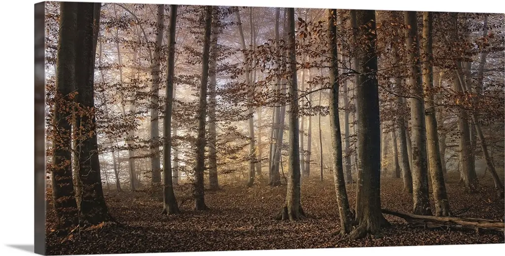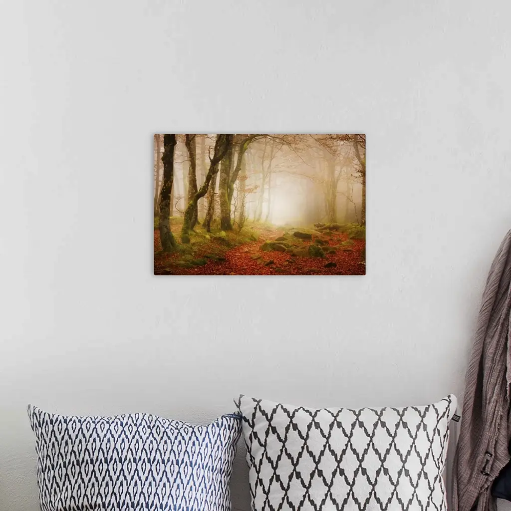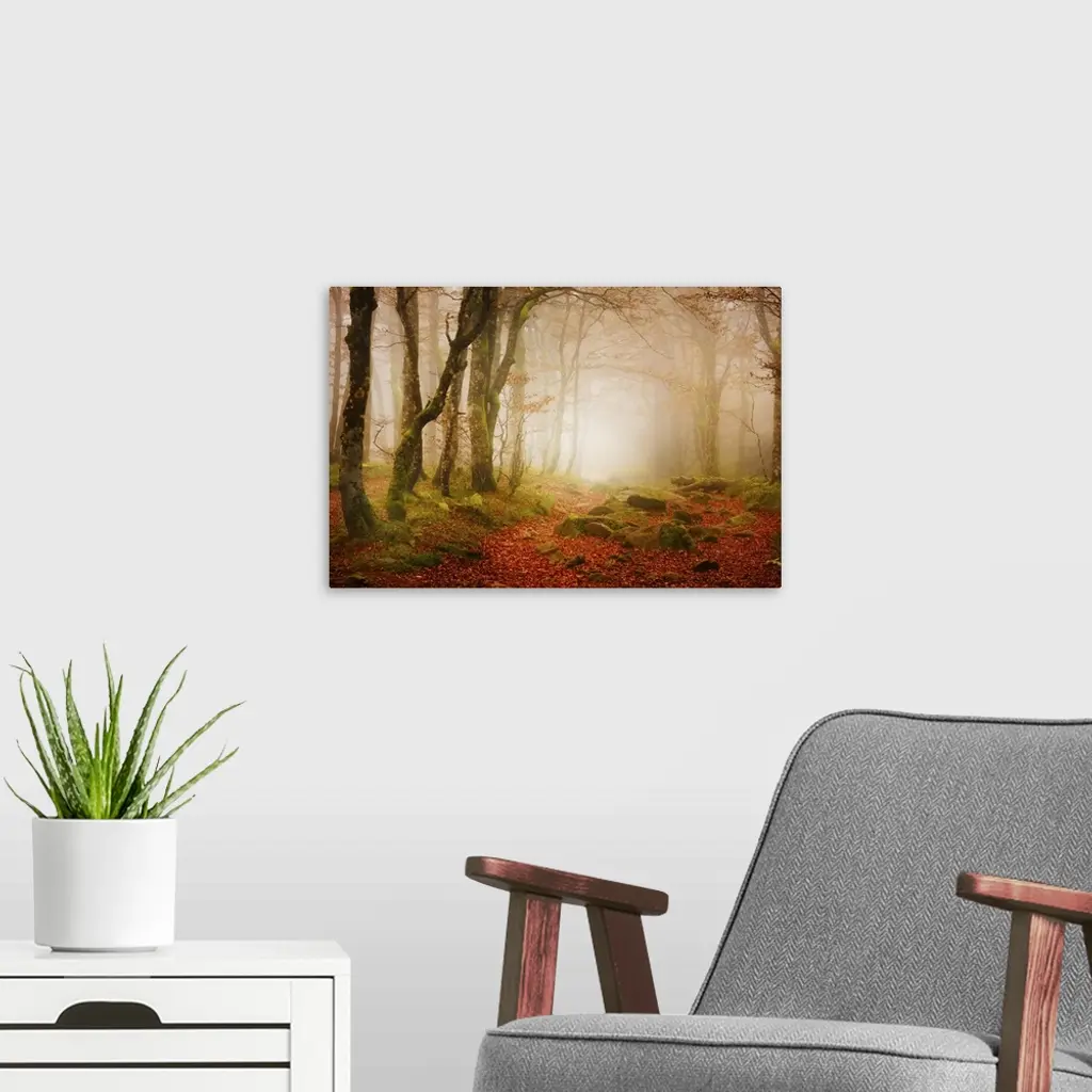A foggy forest covered in red fallen leaves and mossy green rocks.