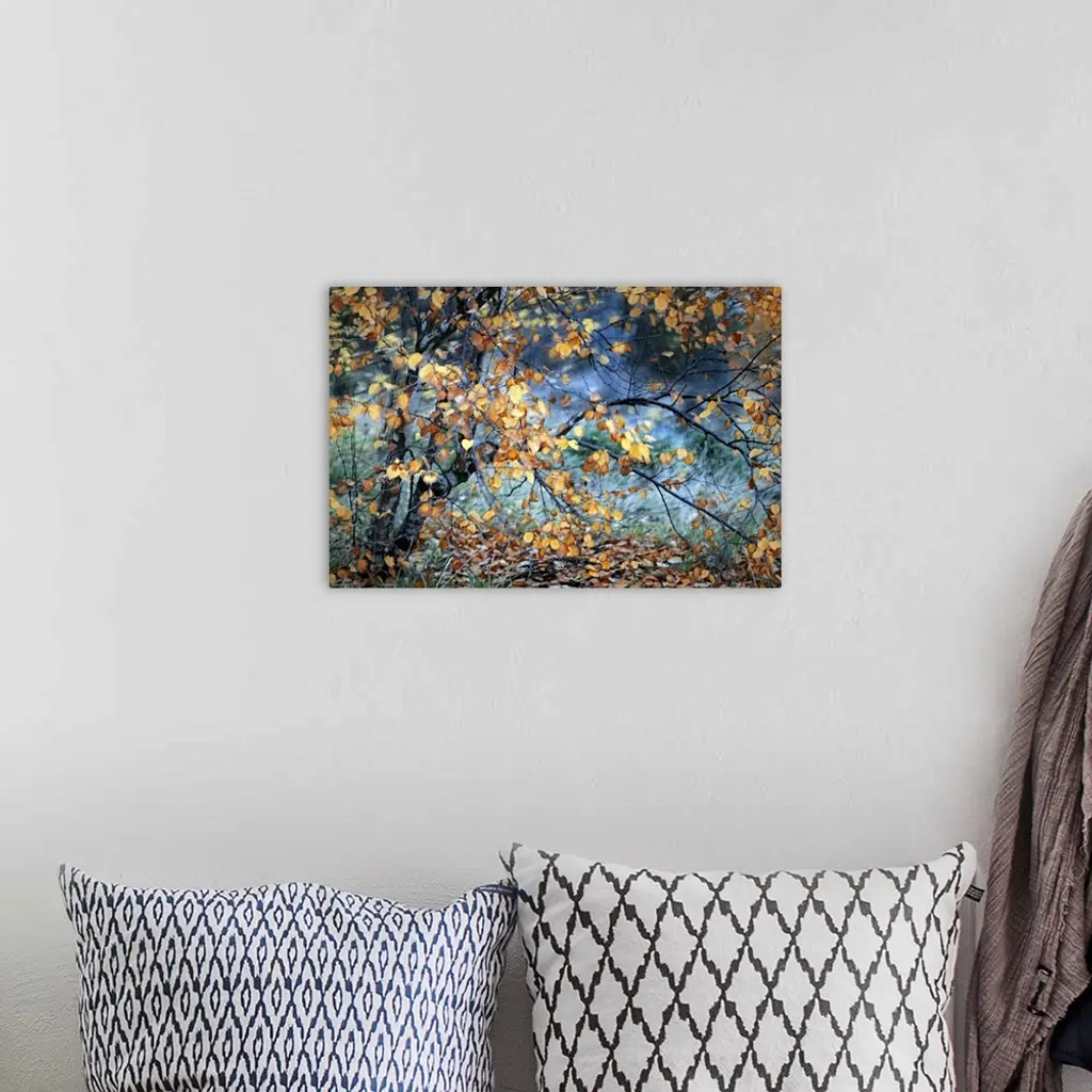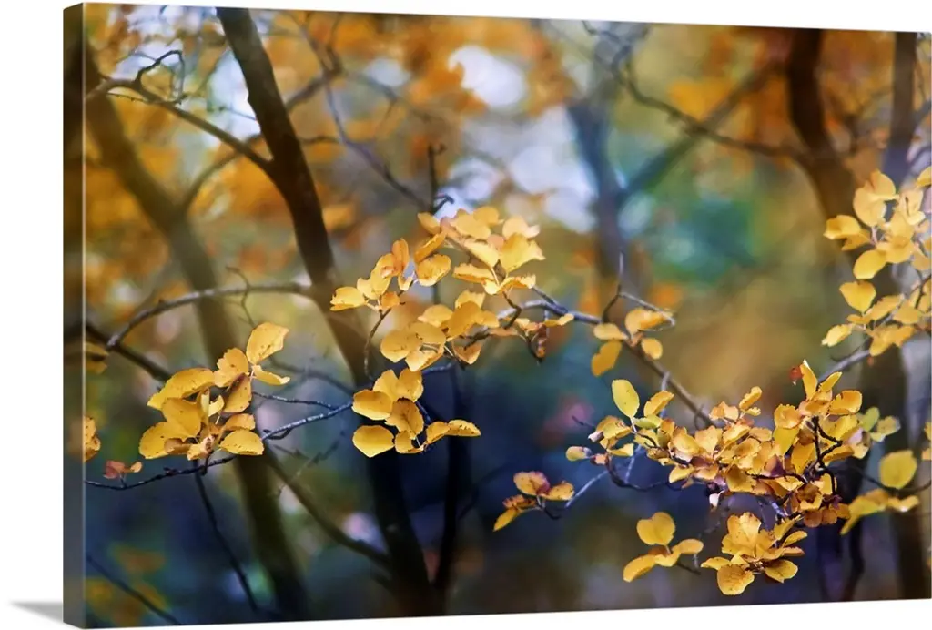 A blurred motion image of a tree with bright yellow leaves in the fall.