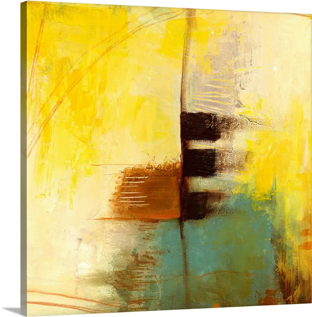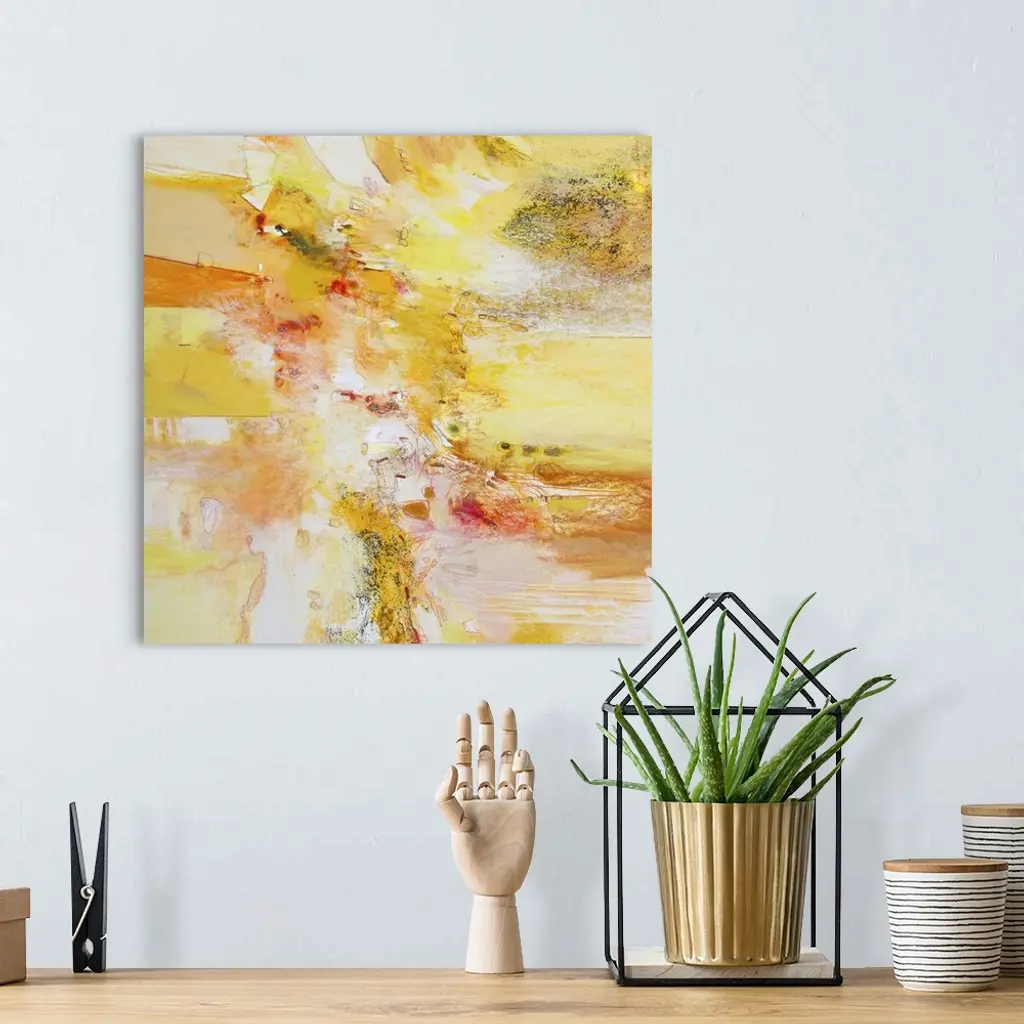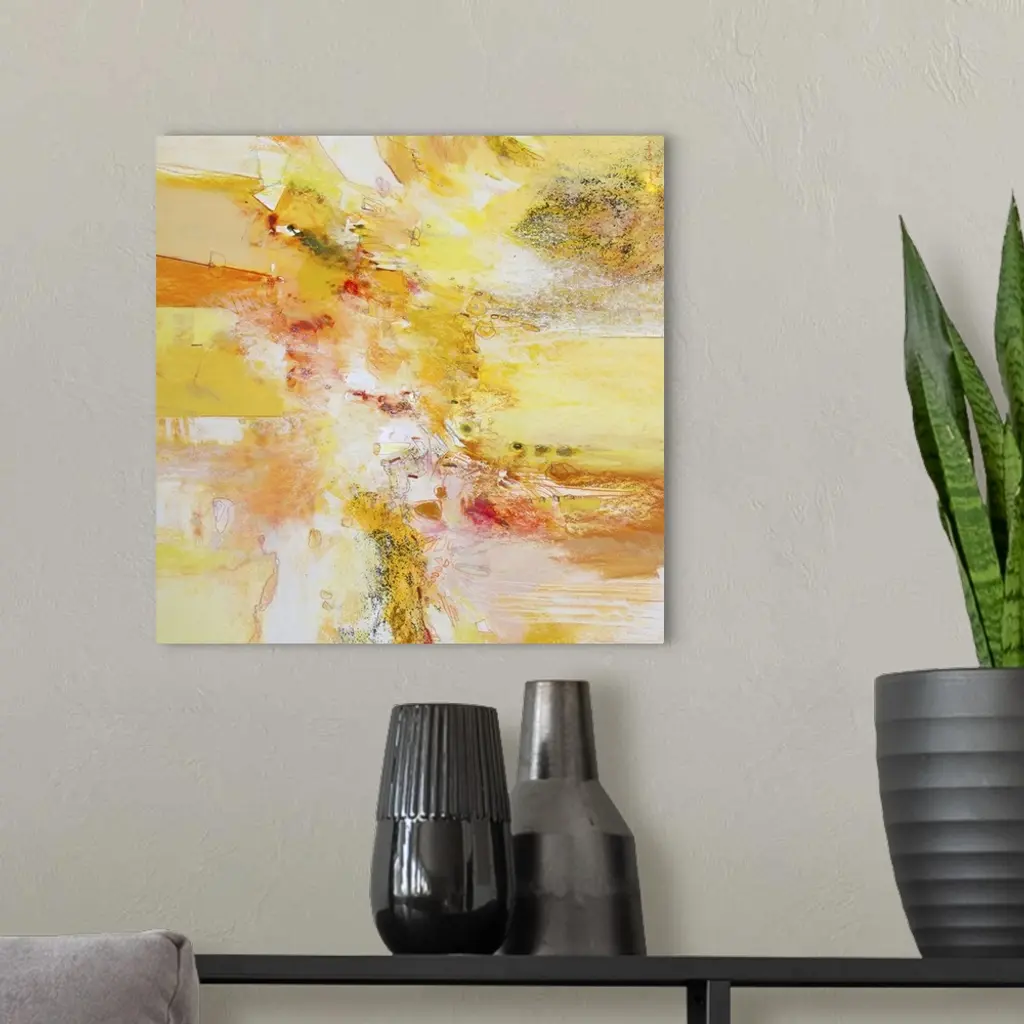Contemporary abstract art, originally in acrylic, ink, and watercolor, in bright shades of orange and yellow.