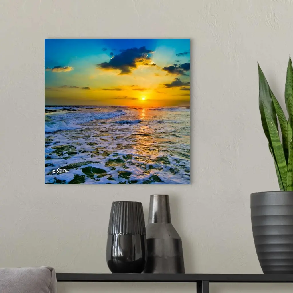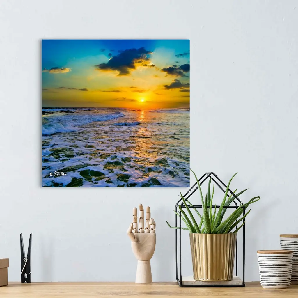 Yellow Sunset Checkered Sea-Square Frame-Sun Rays