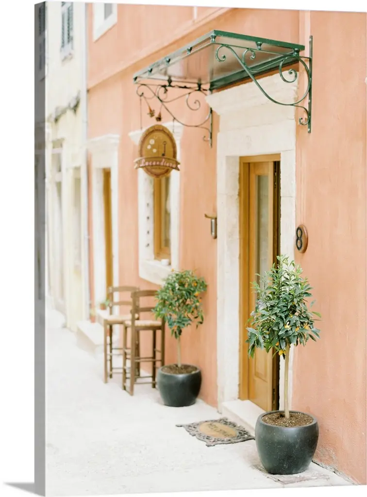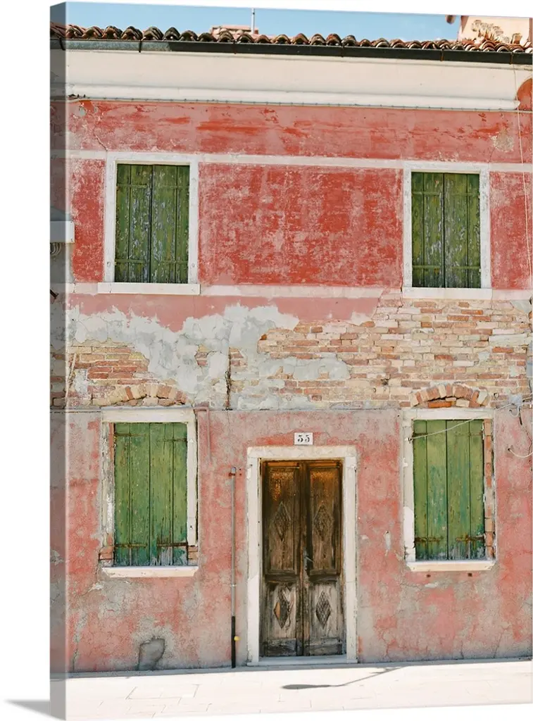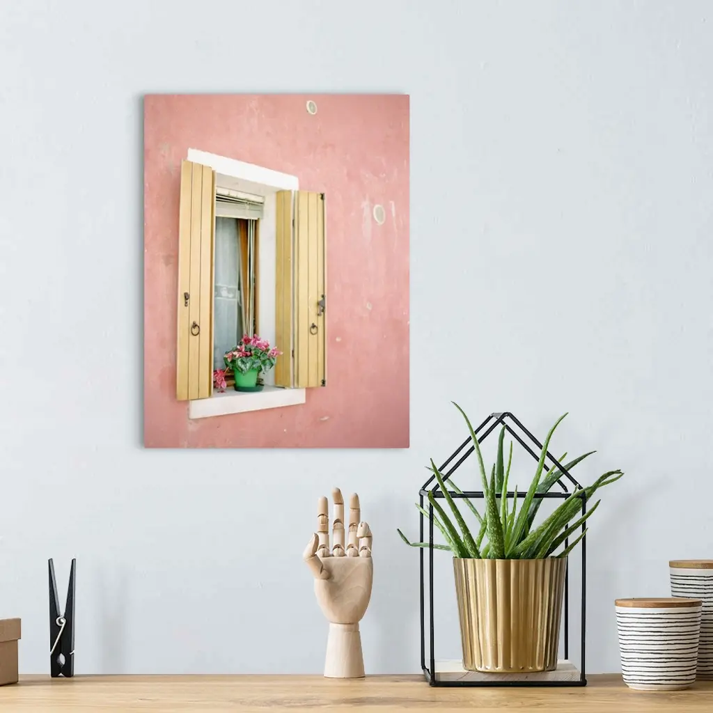 Photograph of a small flowering plant on a windowsill, flanked by yellow shutters, Burano, Italy.