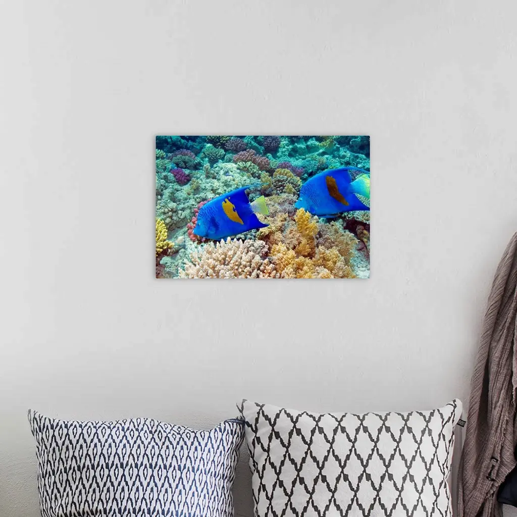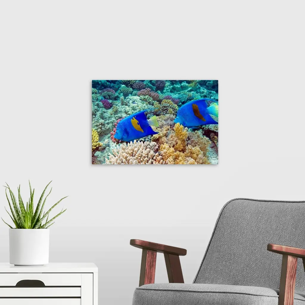 Yellowbar angelfish (Pomacanthus maculosus) swimming over coral on a reef. This fish can reach up to 50 centimetres in length. It is found in the seas surrounding the Arabian Peninsula. Photographed in the Red Sea, Egypt.