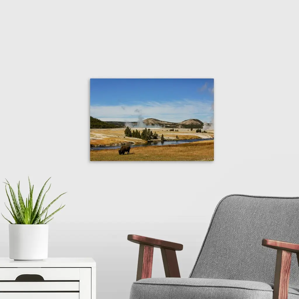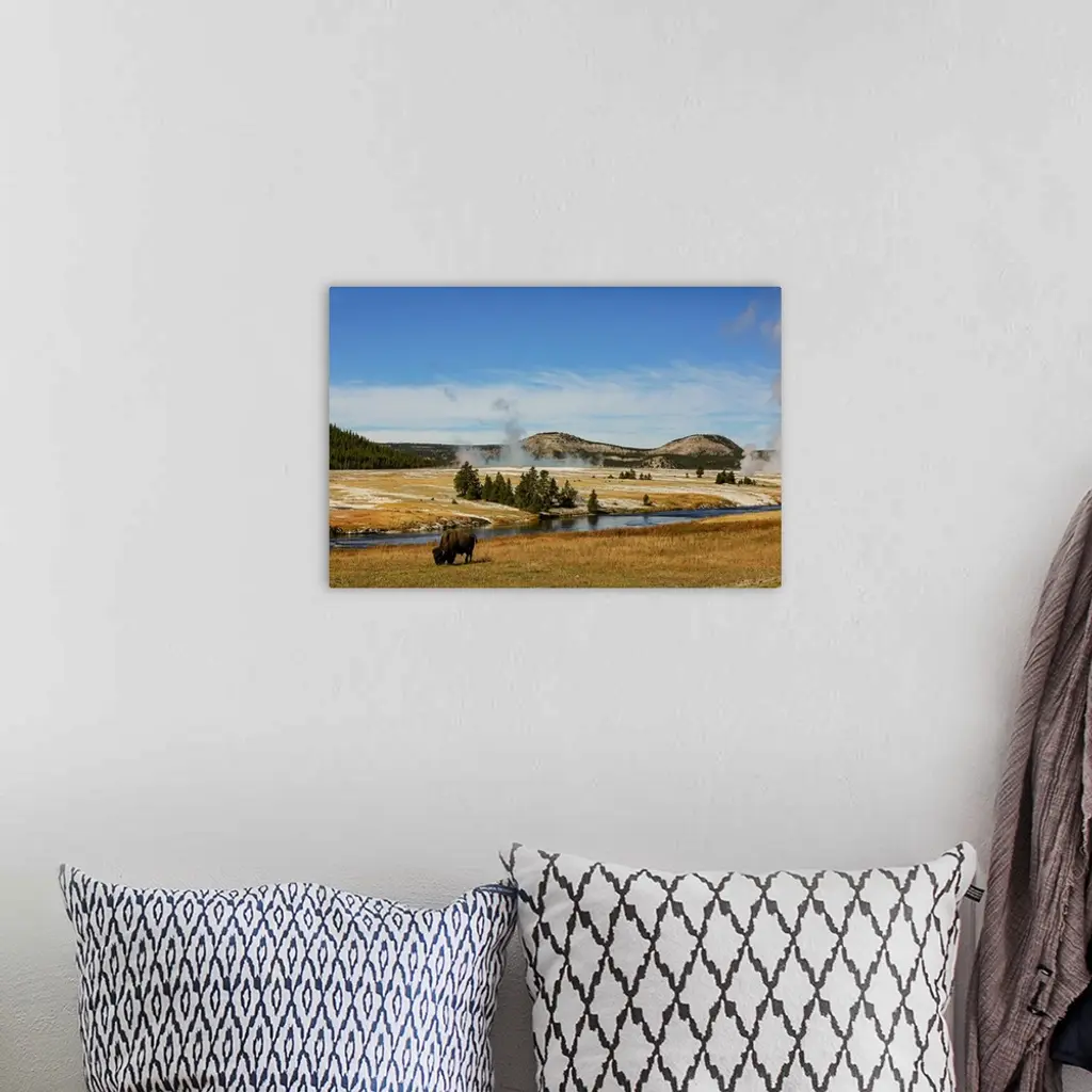 Yellowstone National Park, USA, Bison, buffalo, Steam, Old Faithful, Yellowstone River. United States, Wyoming.