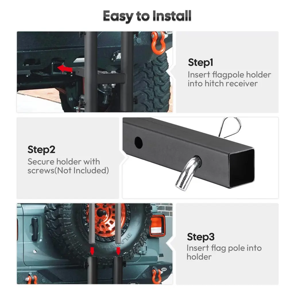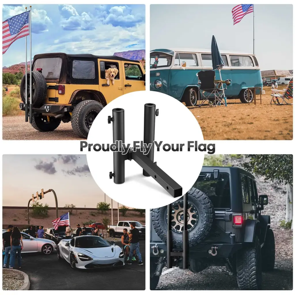 Features:- Universal Compatibility - This Hitch-Mounted Car Flagpole Holder with 2 angled holders is designed to connect to the rear suspension, and is suitable for flagpoles with a diameter of 1" to 2", highly applicable on jeeps, RVs, SUVs, pickups, trucks, campers, and trailers with 1 9/16" receivers, allowing you to fix 2 flags at the same time while traveling- Easy Installation - Enables easy and quick installation without external tools or drilling, simply insert the flagpole base into the rear receiver and fix it with screws, then insert the flagpole into the base- Stable Locking - Comes with thumb screws on 2 sides for tightening and firmly locking the flagpoles of different sizes, which helps to improve stability and safety, providing peace of mind and safe driving- Solid Metal Construction - Made of sturdy and rigid metal for great strength and durability, it is made to withstand daily wear and tear, while providing resistance against rust and corrosion thanks to its outer coat of spray paint; Includes holes at the bottom to drain rainwater or melted snow for easy cleaning and maintenance- Proudly Fly Your Flags - Enables you to fly your national flags to showcase your pride anytime and anywhere, also great for sports fans to fly the flag of their favorite club or team, or to show enthusiasm when participating in auto shows, sporting events, road trips, family vacations, competitions, carnivals, etc. A fit for our flag pole model YES0503, any inquiry is welcomeSpecifications:- Overall Dimension(LxWxH): 14 15/16" x 8 1/4" x 15 3/4" (38 x 21 x 40 cm)- Fit Flag Pole Diameter: 1" to 2" (2.5 to 5 cm)- Material: Metal- Flagpole Holder Opening Size(LxW): 1 9/16" x 1 9/16" (4 x 4 cm)- Net Weight: 7.9 Lbs (3.6 kg)Package Contents:- 1x Flagpole Holder- 1x Supporting Pole- 2x Plastic Covers- 4x Thumb Screws- 2x Bolts- 1x Manual
