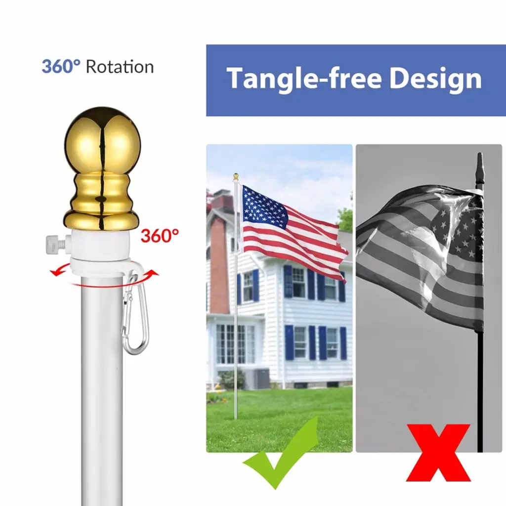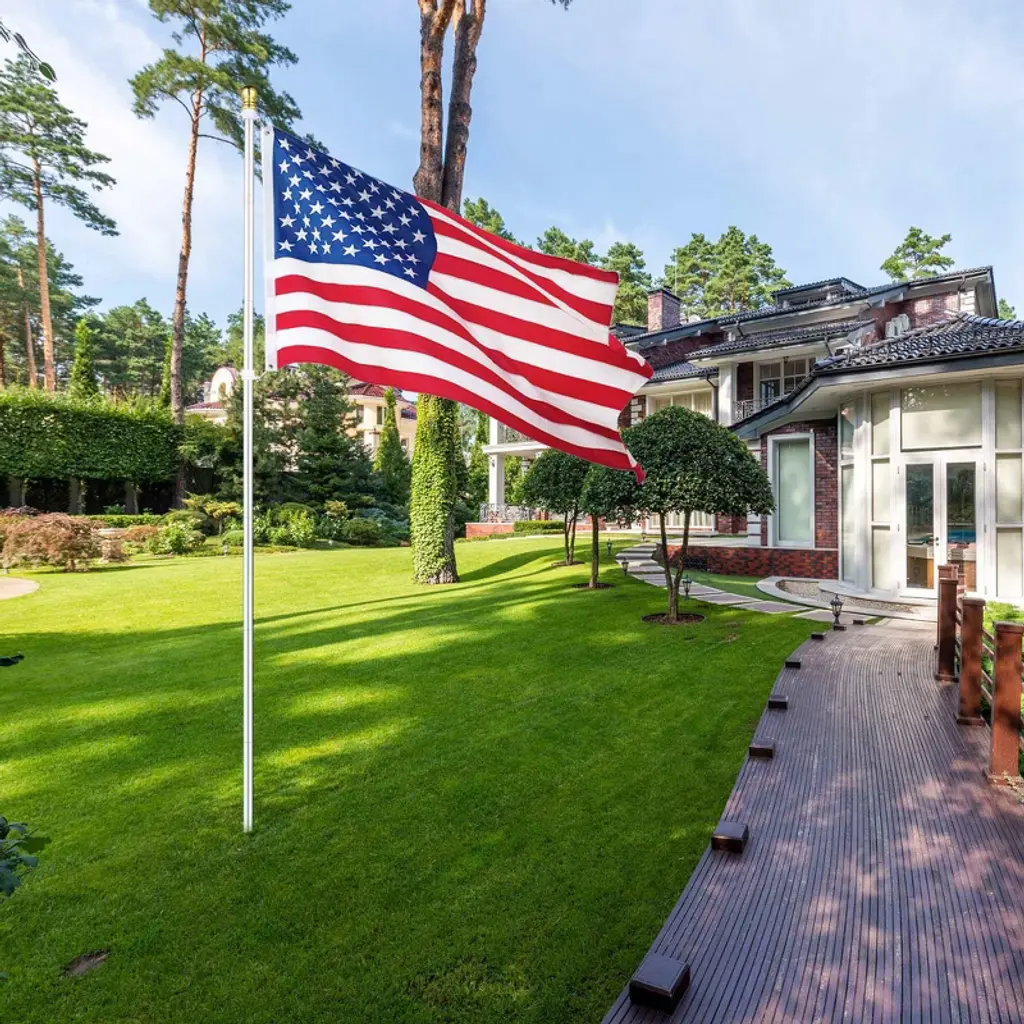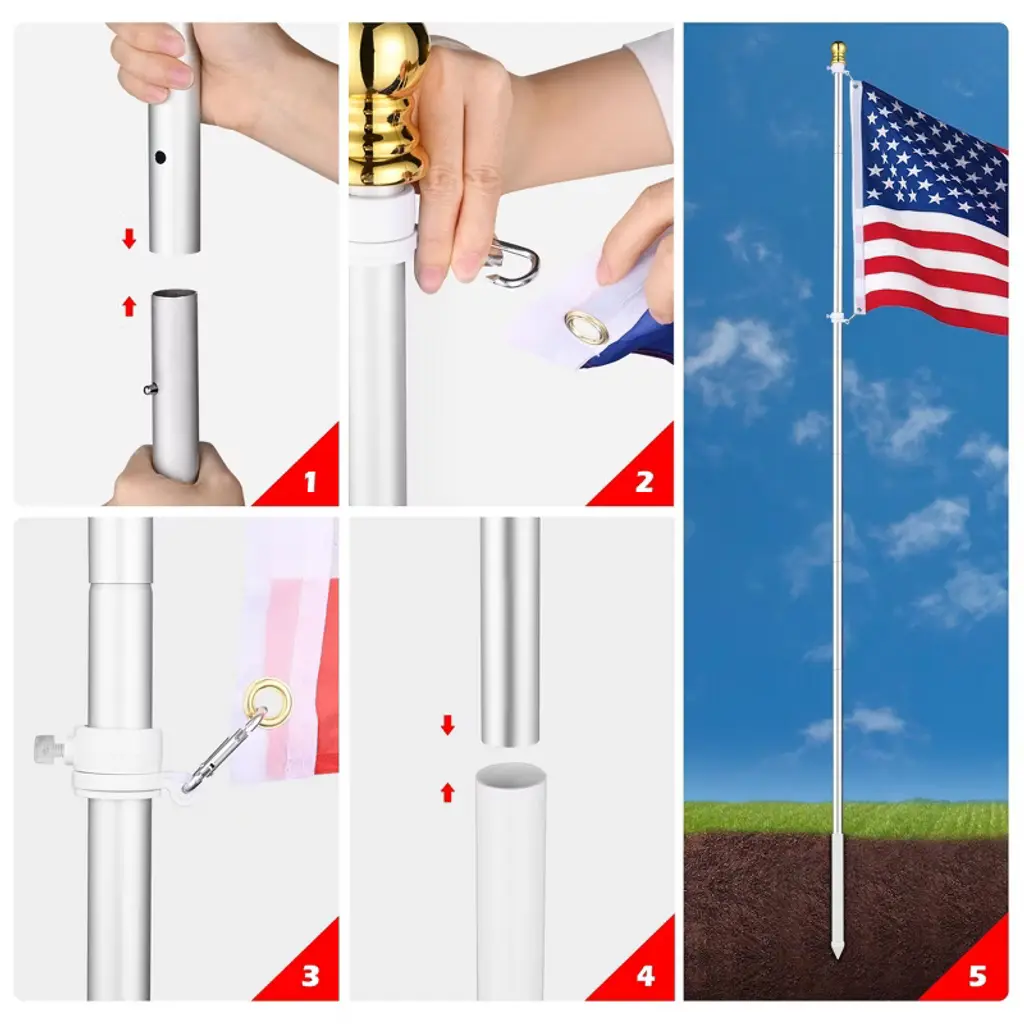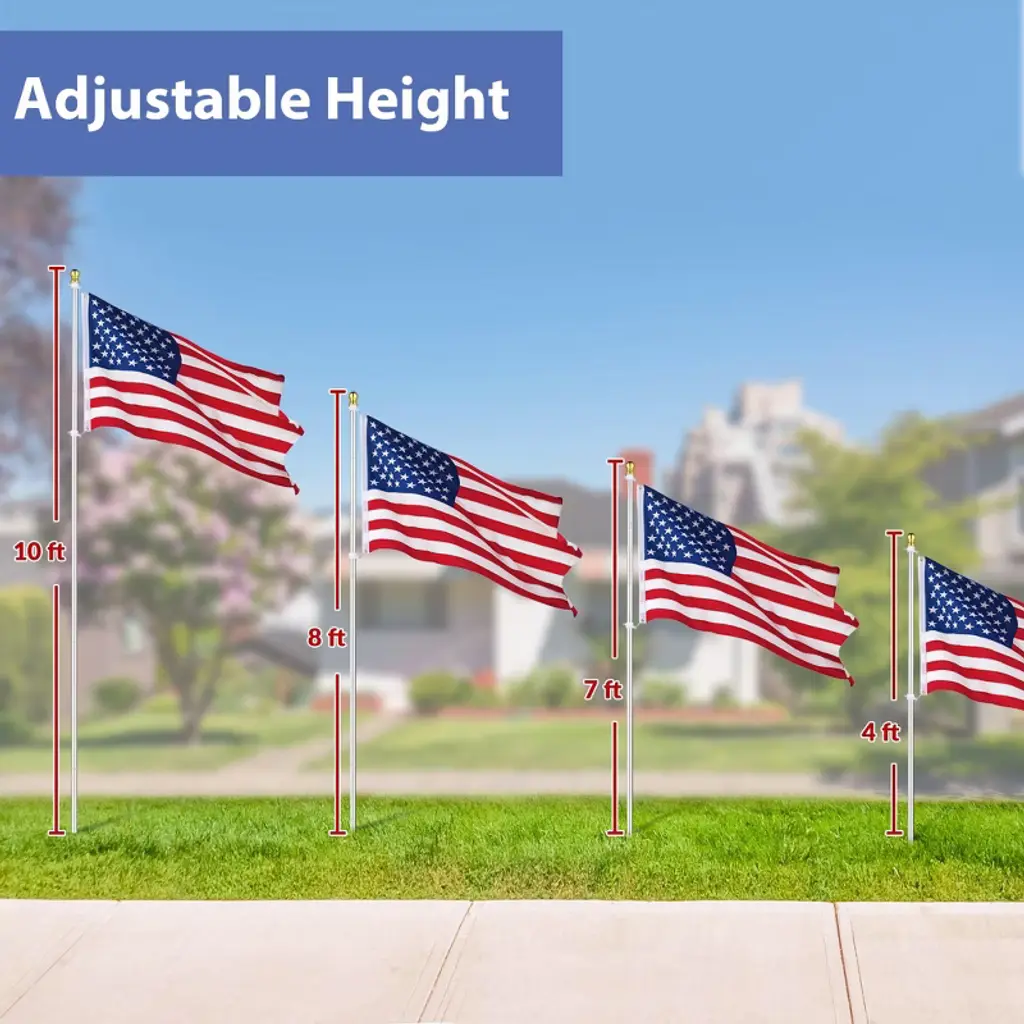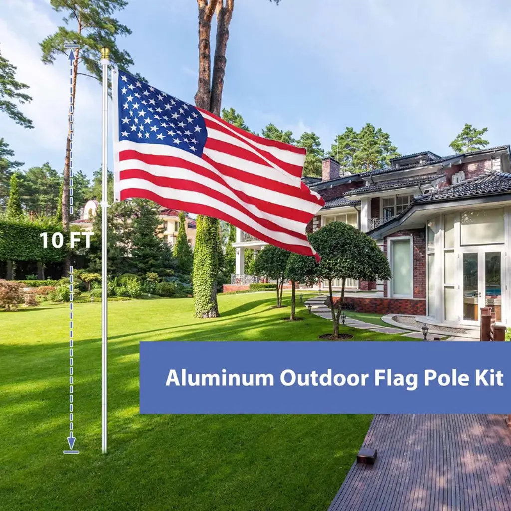 Features:- Fly Your American Pride - 10 ft Aluminum Outdoor Flag Pole Kit includes an aluminum flag pole, 3x5 ft American national flag, and PVC sleeve, one complete set to celebrate the festival and show your respect for independence, freedom, and democracy; Can be mounted in your backyard, garden, lawn, camping ground and more- Sturdy Aluminum Construction - Rustproof aluminum construction makes this flagpole more sturdy and able to withstand all-weather outdoor environment for long-lasting use, with silver finish for presenting a classic yet elegant look to your place- Adjustable Height - Features sectional pole design which allows you to customize the height by adjusting the quantities of poles connected according to your need- Easy Assembly - Easy to assemble in minutes by connecting the sectional poles, sliding the rotating rings into the top pole, and hanging the national flag; Comes with a PVC sleeve to give the flagpole a firm foundation for better stability- Tangle-free Design - Comes with 2 pcs 360-degree rotating rings at the top pole to allow the flag to spin independently from the pole, preventing the flag from tangling on windy daysSpecifications:- Overall Dimension(Dia.xH): 1" x 9 1/2 ft (2.5 x 290 cm)- American National Flag Size(LxW): 5 ft x 3 ft (153 x 90.7 cm)- Sectional Pole Size(Dia.xL): 1" x 15 13/16" (2.5 x 40.2 cm)- PVC Sleeve Length: 15 5/16" (38.9 cm)- PVC Sleeve Inner Diameter: 1 1/8" (2.9 cm)- Net Weight: 1.65 Lbs (0.75 kg)Package Contents:- 7x Sectional Poles- 1x Top Pole- 1x PVC Sleeve- 1x Poles with Hooks- 1x US Flag- 1x ManualNotice: - Please note that at least 3 sectional poles [ are required when installing the flag pole kit.