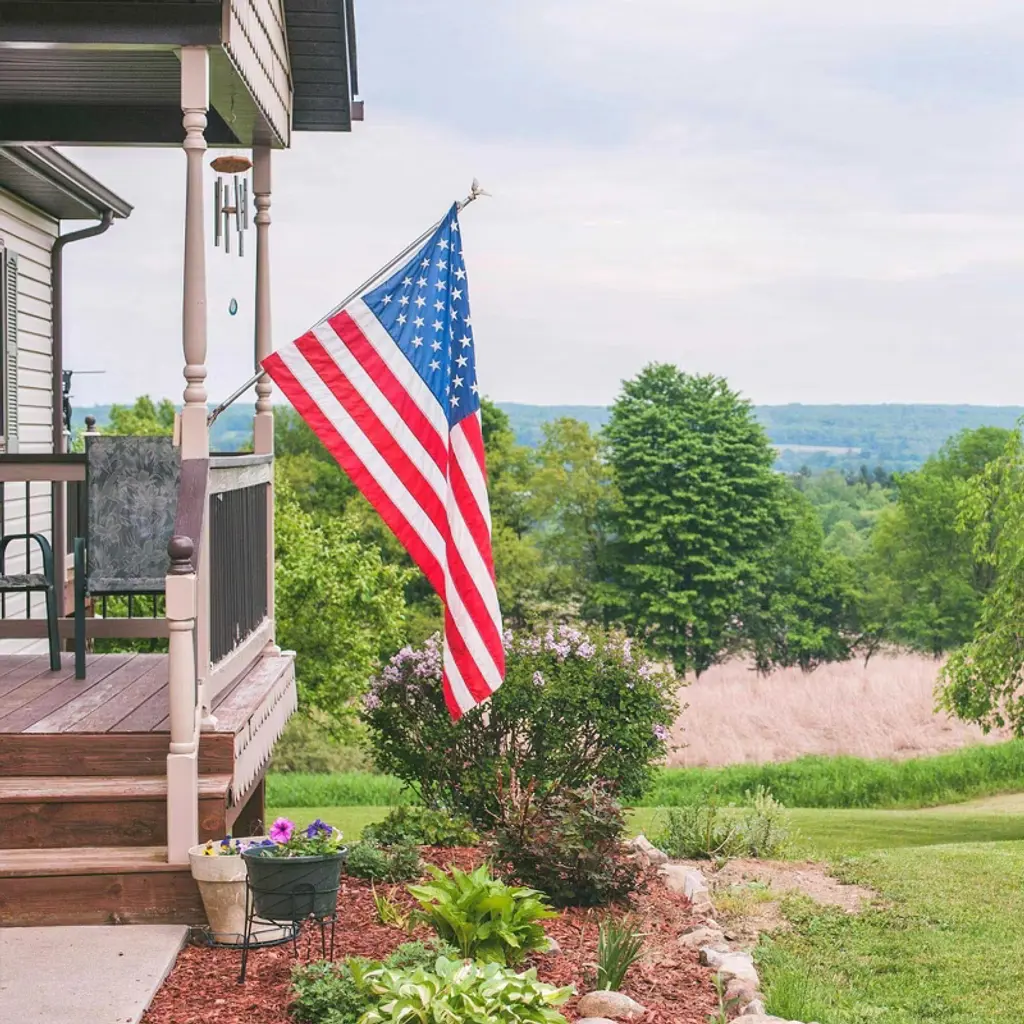 Features:- Proudly Fly Your American Pride - This 3x5 ft American Flag comes in vivid color, a national emblem of the United States for displaying patriotism and showing your pride- Double Stitched Edges - The flag is constructed of polyester fabric with reinforced double-stitched hem to prevent fraying or ripping, which is durable and tough enough to fly high in your backyard or any outdoor place- Two-Sided Pattern - Boasts screen-printed stars and stripes in vivid color on 2 sides to showcase the beauty from any angle, unfurling proudly in the breeze to catch the eye of neighbors or passers-by- Easy Attachment - Made of brass-plated metal for corrosion resistance, the grommets allow more space for carabiner or rope to go through, ideal for attaching the flag to a flagpole or hanging on the wall with straps- Ideal for Multiple Occasions - Celebrate the occasion or pay tribute to your loved one, and also suitable for everyday display in your backyard, front porch, garden or on your RV, camper, or truckSpecifications:- Overall Size(LxW): 59 1/16" x 35 7/16" (150 x 90 cm)- Grommet Inner Diameter: 7/16" (10.5 mm)- Grommet Outer Diameter: 13/16" (20 mm)- Material: 100% Polyester- Net Weight: 0.15 Lb (0.07 kg)Package Contents:- 1x American FlagNotice: - Please note that the flagpole is Not included.