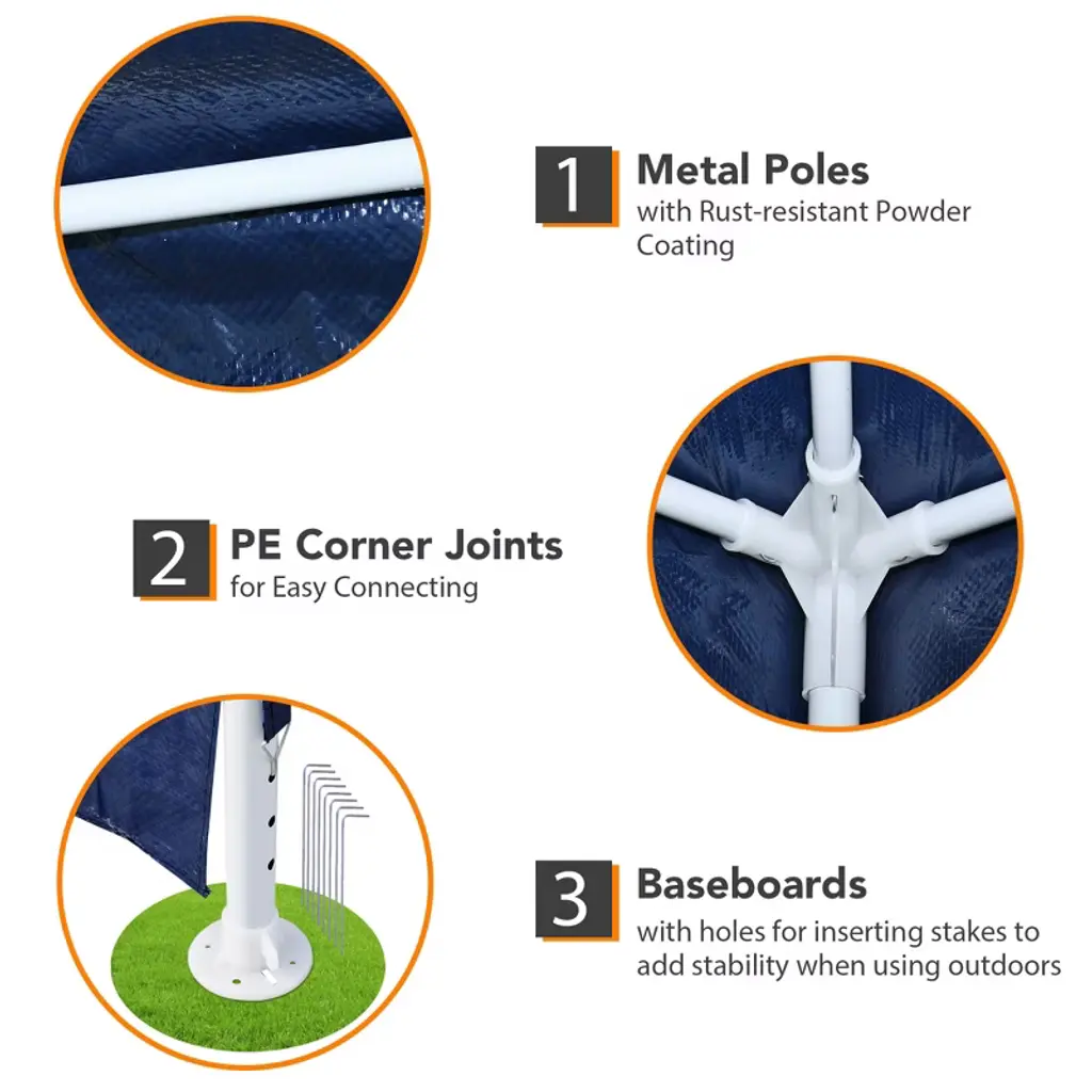 Features: - Outdoor Wedding Tent - 10x10 ft Wedding Tent offers 100 sq. ft. coverage, can accommodate approx. 10 people for dining or party, providing cool shade for relaxing outdoor gathering, ideal for wedding, outdoor events, house warming party, baby shower, barbeque, camping and more - Detachable Sidewalls - 4 sidewalls with hook & loop fastener for easy attaching and removal according to your need, 3 sidewalls with transparent church window to let in plenty of natural light & provide clear landscape views, zipper door for easy access & good ventilation on hot days - Easy to Assemble & Store - No tools required for easy assembly and disassembly; Lightweight tubes can be completely detached and conveniently stored into your car truck - Durable Material - Tent roof & sidewalls are made of water-resistant & UV-resistant PE, ideal for outdoor use; Metal frame with rust-resistant powder coating for durability; Corner joints and baseboards made of brand-new PE won’t get brittle easily for long lifespan - Ground Stakes for Stability - Extra straight fittings for stably securing the connection between tubes; Baseboard with holes for inserting stakes to ensure stability when using on the lawn, can use with sand bags (not included) to add extra stability; To prolong the service life, we do not recommend to use the tent when there is a strong wind or under bad weatherSpecifications:- Model: 10 x 10 ft - Overall Dimension(LxWxH): 10 x 10 x 8 1/6 ft (3 x 3 x 2.5 m) - Sidewall Size(LxH): 10 x 6 7/12 ft (3 x 2 m) - Frame Material: White Powder Coated Steel /w PE Joint Fittings - Net Weight: 17.6 Lbs (8 kg)Package Contents:- 1x Top Cover- 3x Sidewalls with Windows- 1x Sidewall with Zipper- 1x Tube Set - 1 Set of Accessory- 1x ManualNotices: - 1. It requires 2 people to set up the tent for fast erection. - 2. Polyethylene is not fireproof, please keep away from fire sources. - 3. Please don't leave canopy up overnight or under bad weather conditions. Tents are temporary structures designed to handle most normal weather conditions. Evacuation of tents is recommended under bad weather or other unsafe conditions. We will not be liable for poor weather conditions or natural disasters.