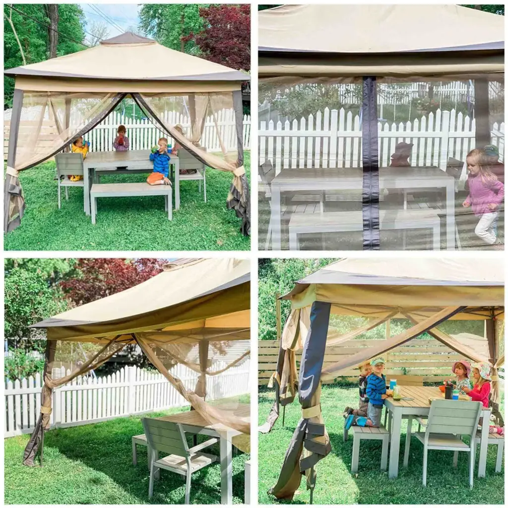 Features:- All-in-1 Vintage Pavilion Appearance - 11x11ft Pop-Up Gazebo Tent with Netting Sidewalls provides room for approx. 6 people to sit under; Canopy with cornice brings classic beauty, mesh sidewalls with zippers can be collected while not using, gazebo shape likes a well-built cabin, perfectly compatible with your patio, backyard, courtyard- Durable Canopy Top - 160g polyester fabric ensures durability and keeps original color for a long time; PA coating for UV30+ protection to protect you from harmful UV ray; 2 tiers connected by hook and loop fasteners, netting between tiers for air flowing, offers a comfortable airy space under the cover- Breathable Mesh Sidewall - Netting with high density, not only for you to enjoy the breeze in summer days, also for blocking annoying flies and gnats out, protects you from being bitten outside; Feeling the cool wind and enjoying the outside view with not disturbance- Easy to Set up & Carry - Tool-free assembly with 4 steps: Extend the frame, fixate the canopy, adjust the height and then attach sidewalls; 600D Oxford fabric portable bag included, store the frame for carrying around, a portable shelter for picnic, barbecue, trip and other outdoor activities- Sturdy & Solid Construction - Sprayed metal frame features rust-resistance and guarantees a strong support for tent; L-shape ground stake for stably fixating the tent on the ground, and ground anchors with ropes enhance the sturdiness for outdoor usingSpecifications:- Overall Dimension(Assembled)(LxWxH): 129 15/16" x 129 15/16" x 76" to 109 7/16" (330 x 330 x 193 to 278 cm)- Folded Overall Dimension(LxWxH): 8 7/8" x 8 1/16" x 45 1/4" (22.5 x 20.5 x 115 cm)- Upper Tier Size:- Hemline(LxW): 39 3/8" x 39 3/8" (100 x 100 cm)- Hypotenuse: 28 3/8" (72 cm)- Middle Height: 19 1/8" (48.5 cm)- Bottom Tier Size:- Hemline(LxW): 129 15/16" x 129 15/16" (330 x 330 cm)- Hemline without Cornice(LxW): 116 9/16" x 116 9/16" (296 x 296 cm)- Hypotenuse: 73 5/8" (187 cm)- Middle Height(LxW): 53 1/8" (135 cm)- Sidewall Dimension(LxH): 117 5/16" x 74" (298 x 188cm)- Mesh Density: 22 holes per square feet- Net Weight: 34.83 Lbs (15.8 kg)Package Contents:- 1x Tent Frame with Canopy Kit- 4x Mesh Sidewalls- 1x Portable Bag- 32x Plastic Hooks- 4x 3m Straps- 4x 2m Straps- 4x Ground Anchors- 8x L-shape Ground Stakes- 1x Manual