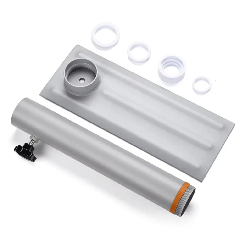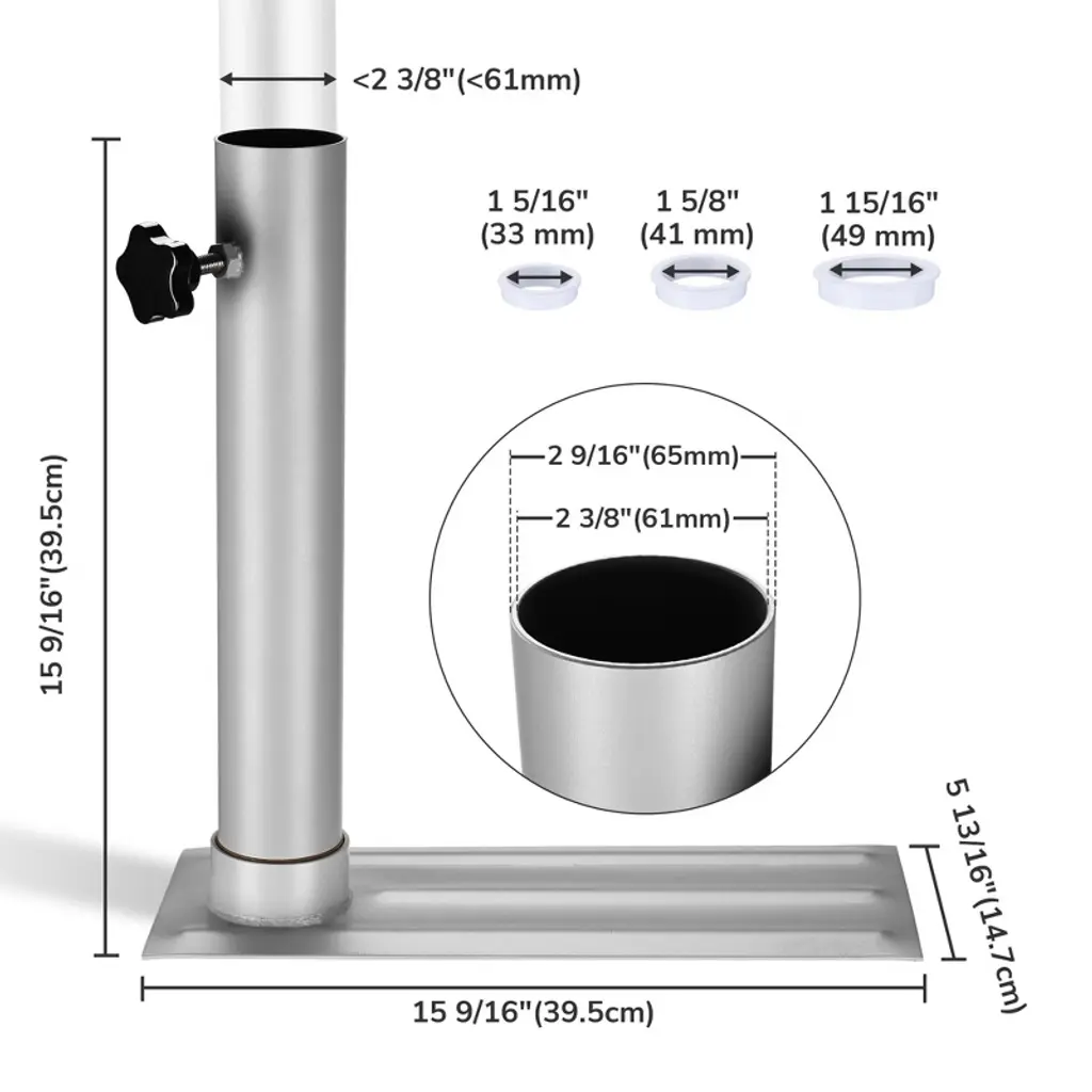 Features:- Convenient & Flexible to Place - Universal Tire Mount Flagpole Base, fits flag pole with diameter less than 2 3/8" (61 mm), simply putting it under your car wheel to stabilize, no fixated installation needed, movable design for holding flagpole at anywhere you park; Includes 1 set of plastic sleeves for making it fit for thinner poles of 1 5/16", 1 5/8" to 1 15/16" in diameter- Durable in Use - Heavy duty metal body for long life span, sprayed exterior for anti-rust & anti-corrosion; Rubber ring on the joint prevents water permeating inside screw thread for rust-resistance; Tightening screw knob provides a smooth, wobble-free adjustment for better stability- Classic Appearance - Smooth metallic surface matches with metal poles, provides a harmonious performance with flag pole- Easy to Carry - 2-piece design for excellent portability, no complicated assembly required, great for putting in the trunk to take around- Wide Application - Great for tailgate party, picnic, company trip or other group outings; Expressing your patriotism with national flag wherever you are, showing your favorite team flag when you watch the game, also for holding campsite flag to sign the campSpecifications:- Overall Dimension(LxWxH): 15 9/16" x 5 13/16" x 15 9/16" (39.5 x 14.7 x 39.5 cm)- Sleeve Inner Diameter: 1 5/16", 1 5/8", 1 15/16" (33, 41, 49 mm)- Inner Diameter: 2 3/8" (61 mm)- Outer Diameter: 2 9/16" (65 mm)- Fits Flagpole Outer Diameter: <2 3/8" (<61 mm)- Net Weight: 6.6 Lbs (3 kg)Package Contents:- 1x Stand- 1x Holder- 1x Rubber Ring- 1x Carry Bag- 1 Set of SleevesNotice: - This flag pole base is suitable for pole with diameter of 2 3/8" (61 mm), which might be unsteady for pole less than 2 3/8" (61 mm) in diameter.