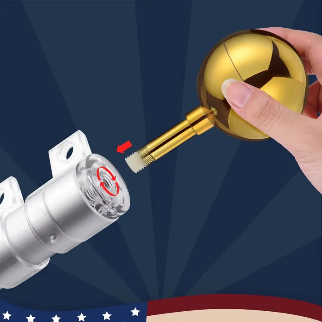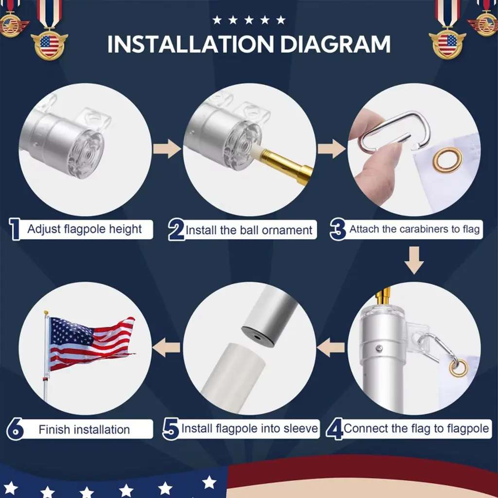 Features:- Telescoping Flagpole Kit - Includes a 25 ft aluminum telescopic flagpole, a golden and a silver top finial, a US flag, 4 carabiners and a PVC sleeve- Fly Your American Pride - Show your independence, democracy and strong patriotic spirit and be proud of the Great American- Tangle Free & Flying 2 Flags - The 1st & 2nd sections of the flagpole can hold up to 3x5 ft flag individually, and easy to fly your national flag & state flag at the same time or fly a team flag as you like, along with a top rotating shaft to prevent the flag from tangling in windy days- Easy Adjustment & Secure Locking - Features telescopic design to enable effortless extension and adjustment from 5 3/4 ft to 23 7/12 ft in length, along with Quick flip lock for ensuring a tight seal for better stability- Sturdy Construction - Heavy duty Lightweight aluminum tube is durable, rustproof and strong enough for outdoor using; Recommended to dismantle the flagpole in heavy wind and severe weather conditions in case any damage happensSpecifications:- Overall Dimension(Dia.xH): 2 3/4" x 23 11/12 ft (7 x 729 cm)- Flag Size(LxW): 4 11/12 ft x 2 11/12 ft (150 x 90 cm)- PVC Sleeve Size(Dia.xL): 2 5/16" x 19 11/16" (5.9 x 50 cm)- Net Weight: 7.7 Lbs (3.5 kg)Package Contents:- 1x Flag Pole- 1x Gold Ball Finial- 1x Silver Ball Finial- 1x American National Flag- 1x PVC Sleeve- 4x Carabiners- 1x Allen Key- 1x ManualNotice: - We suggest a hole deeper than 20" for the pole to secure it more firmly.