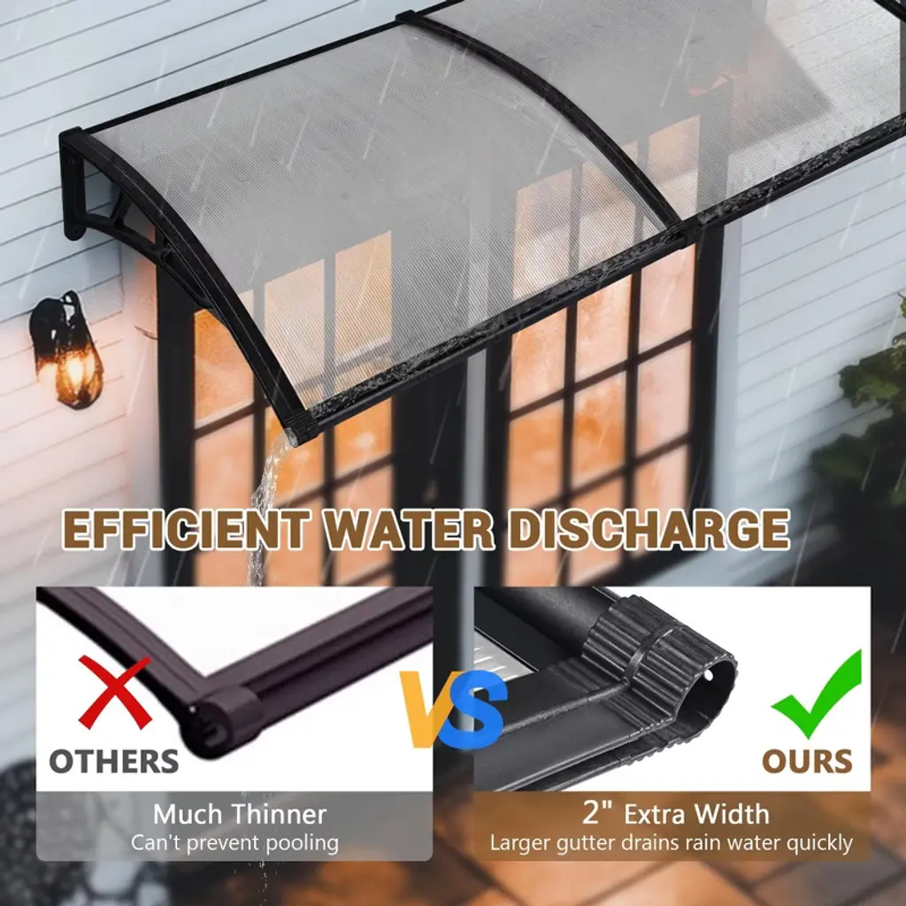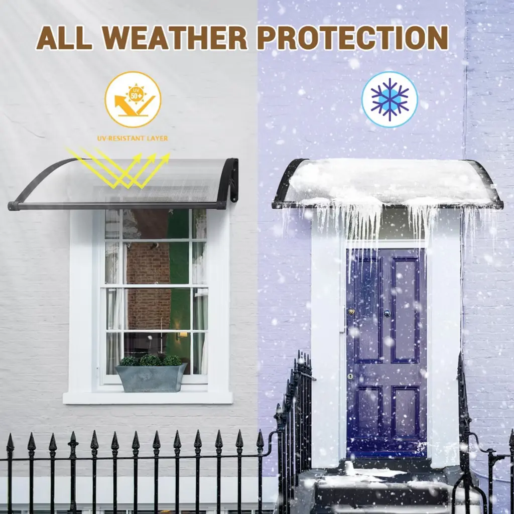 Features:- Versatile Shelter Green Pro - awning features green color for filtering out bright glare of sun but leave cozy & soft light for you to read or take a rest beside window or door, and effectively protects door, window, furniture & floor from UV rays, rain or light snow; Ideal to use in patio, forecourt, garden or balcony- Compact One-piece Design & Water Gutter - One-piece awning features waterproofing, seamless surface & rubber stripe on the edge against wall for ensuring no water leaking, much better than junctional pieces construction; Water gutter on the other edge drains rainwater from two sides for preventing uncontrolled water dripping and making it convenient to catch drips- UV Resistance & Heat Dissipation - Features two-side anti-UV layers up to 50+ for effectively protect from harmful UV rays & hollow design for dissipating heat & lowering temperature in hot summer, saving your electric cost on cooling down- Solid & Durable - 5mm thick PC sheet with sturdy brackets & aluminum alloy stripes forms strong protection even under light snow and supports weight capacity up to 22 Lbs/sqm, and is resistant to corrosion, rust, impact, heat & cold; UV-resistant & Anti-aging function lasts long time for several years.- Easy to Install & DIY - Complete package includes all wall-mounting accessories for 3 different walls, cement, wood or brick; Wider coverage & fuller protection could be easily achieved by connecting multiple awnings together, inquiries are welcomeSpecifications:- Overall Dimension(LxWxH): 40 9/16" x 38 9/16" x 10 1/4" (103 x 98 x 26 cm)- PC Sheet Size(LxWxD): 38 3/4 x 37 13/16" x 3/16" (98.5 x 96 x 0.5 cm)- Max Load: 22 Lbs/sqm (10 kg/sqm)- Net Weight: 7.1 Lbs (3.2 kg)Package Contents:- 1x PC Sheet- 2x ABS Brackets- 4x Corner Protectors- 1x Aluminum Strip with Water Gutter- 1x Aluminum Strip with Rubber- 1 Set of Screws and Bolts- 1x ManualNotice: - Please clean snow in time for avoiding excessive pressure on awning caused by overweight snow- The bottom of the awning bracket should be at least 4" (10 cm) above any door opening or window frame.- Please make sure that there is enough space to install awning and the wall surface is flat before purchase.