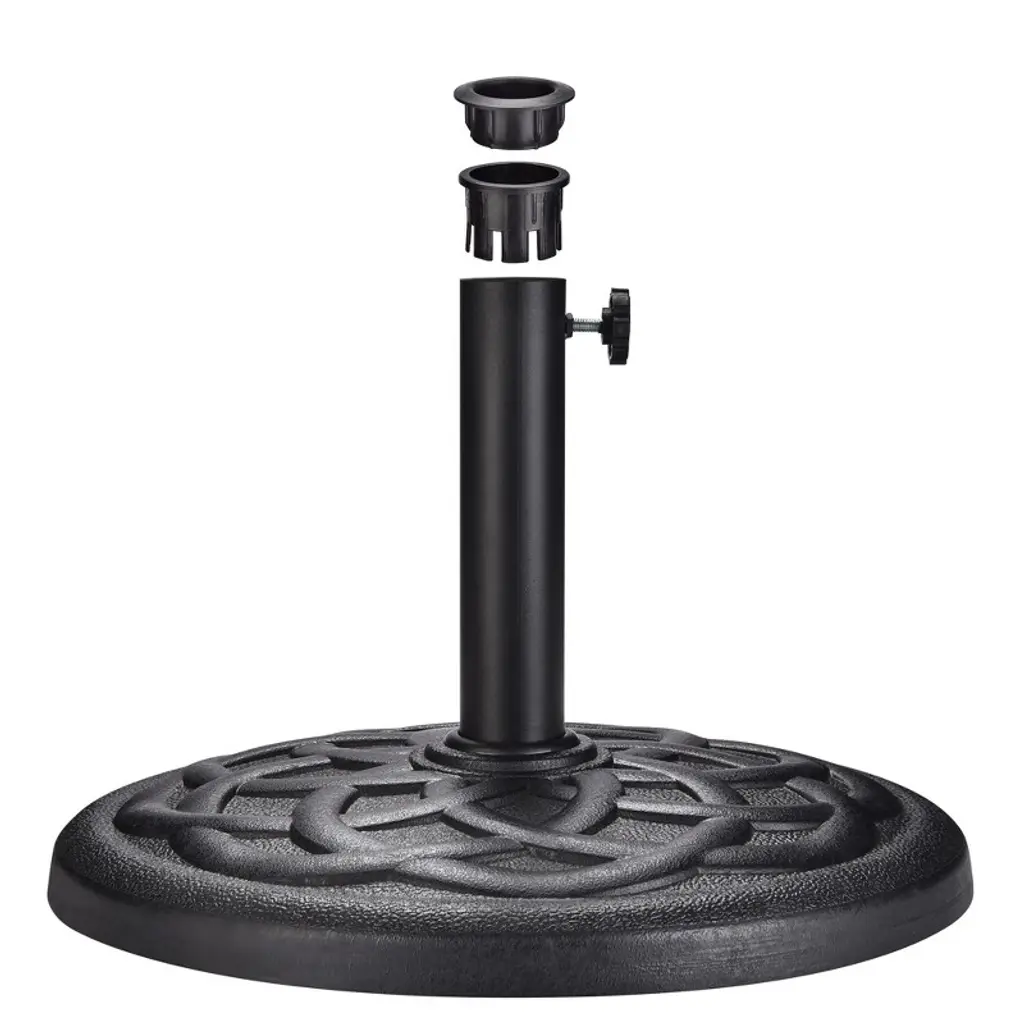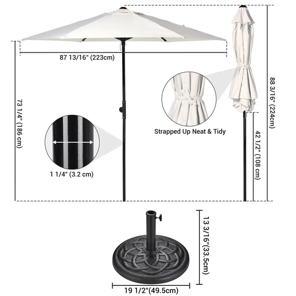 Features:- Patio Umbrella- Scale Design Tilt Mechanism - 7.5 ft Outdoor Patio Umbrella with Patented Easy Tilt Button provides 4-position angle adjustment, allowing you to block the sun from various positions throughout the day for maximum shade- Rust-free Steel Frame - Constructed with heavy-duty powder-coated steel for rust resistance, this patio umbrella ensures premium strength and stability for long-lasting use; Air vent design on the top for air ventilation prevents umbrella from inversion- Durable & Weather-Resistant - Water-repellent PFAS-free polyester fabric offers great durability and resistance to wear for outdoor use, keeping you cool and protected against sun damage with UV30+ protection- Foldable for Convenient Use - Lightweight and foldable structure makes setup and takedown a breeze, reducing the hassle of disassembly for repeated outdoor use and storage such as candy cart, event, cafe, farm market booth as sign- Umbrella Base- Fit for 8 Ft 9 Ft or 10 Ft Patio Umbrella- Attractive elegant decorative pattern and antique-like finish- Heavy base holds umbrella stable and safe- Made of Resin and beton, strong and durable- Better rust resistance for long time use- Simple assembly requiredSpecifications:- Patio Umbrella- Overall Dimension(Dia.xH) 87 13/16" x 88 3/16" (223 x 224 cm)- Total Length After Folding 46 1/16" (117 cm)- Bare Umbrella Pole Length After Closing 42 1/2" (108 cm)- Pole Diameter 1 1/4" (3.2 cm)- Material 180G PFAS-free Polyester- Net Weight 8.1 Lbs (3.65 kg)- Umbrella Base- Overall Dimension(Dia.xH) 19 1/2" x 13 3/16" (49.5 x 33.5 cm)- Upright Tube Dia. 2 3/16" (55 mm)- Net Weight 31.4 Lbs (14.26 kg)Package Contents:- 1x Patio Umbrella- 1x Umbrella Base- 1 Set of Screws- 2x Manuals
