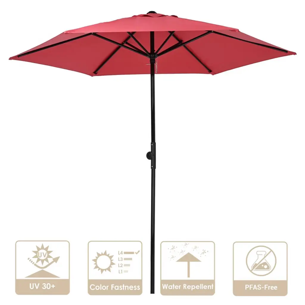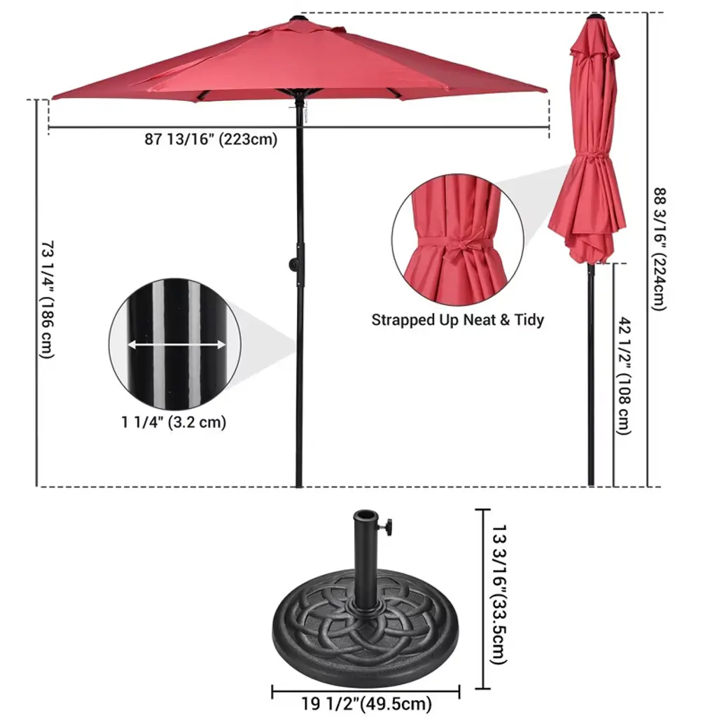 Features:- Patio Umbrella- Scale Design Tilt Mechanism - 7.5 ft Outdoor Patio Umbrella with Patented Easy Tilt Button provides 4-position angle adjustment, allowing you to block the sun from various positions throughout the day for maximum shade- Rust-free Steel Frame - Constructed with heavy-duty powder-coated steel for rust resistance, this patio umbrella ensures premium strength and stability for long-lasting use; Air vent design on the top for air ventilation prevents umbrella from inversion- Durable & Weather-Resistant - Water-repellent PFAS-free polyester fabric offers great durability and resistance to wear for outdoor use, keeping you cool and protected against sun damage with UV30+ protection- Foldable for Convenient Use - Lightweight and foldable structure makes setup and takedown a breeze, reducing the hassle of disassembly for repeated outdoor use and storage such as candy cart, event, cafe, farm market booth as sign- Umbrella Base- Fit for 8 Ft 9 Ft or 10 Ft Patio Umbrella- Attractive elegant decorative pattern and antique-like finish- Heavy base holds umbrella stable and safe- Made of Resin and beton, strong and durable- Better rust resistance for long time use- Simple assembly requiredSpecifications:- Patio Umbrella- Overall Dimension(Dia.xH) 87 13/16" x 88 3/16" (223 x 224 cm)- Total Length After Folding 46 1/16" (117 cm)- Bare Umbrella Pole Length After Closing 42 1/2" (108 cm)- Pole Diameter 1 1/4" (3.2 cm)- Material 180G PFAS-free Polyester- Net Weight 8.1 Lbs (3.65 kg)- Umbrella Base- Overall Dimension(Dia.xH) 19 1/2" x 13 3/16" (49.5 x 33.5 cm)- Upright Tube Dia. 2 3/16" (55 mm)- Net Weight 31.4 Lbs (14.26 kg)Package Contents:- 1x Patio Umbrella- 1x Umbrella Base- 1 Set of Screws- 2x Manuals