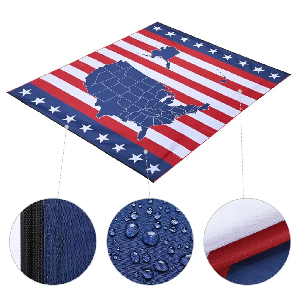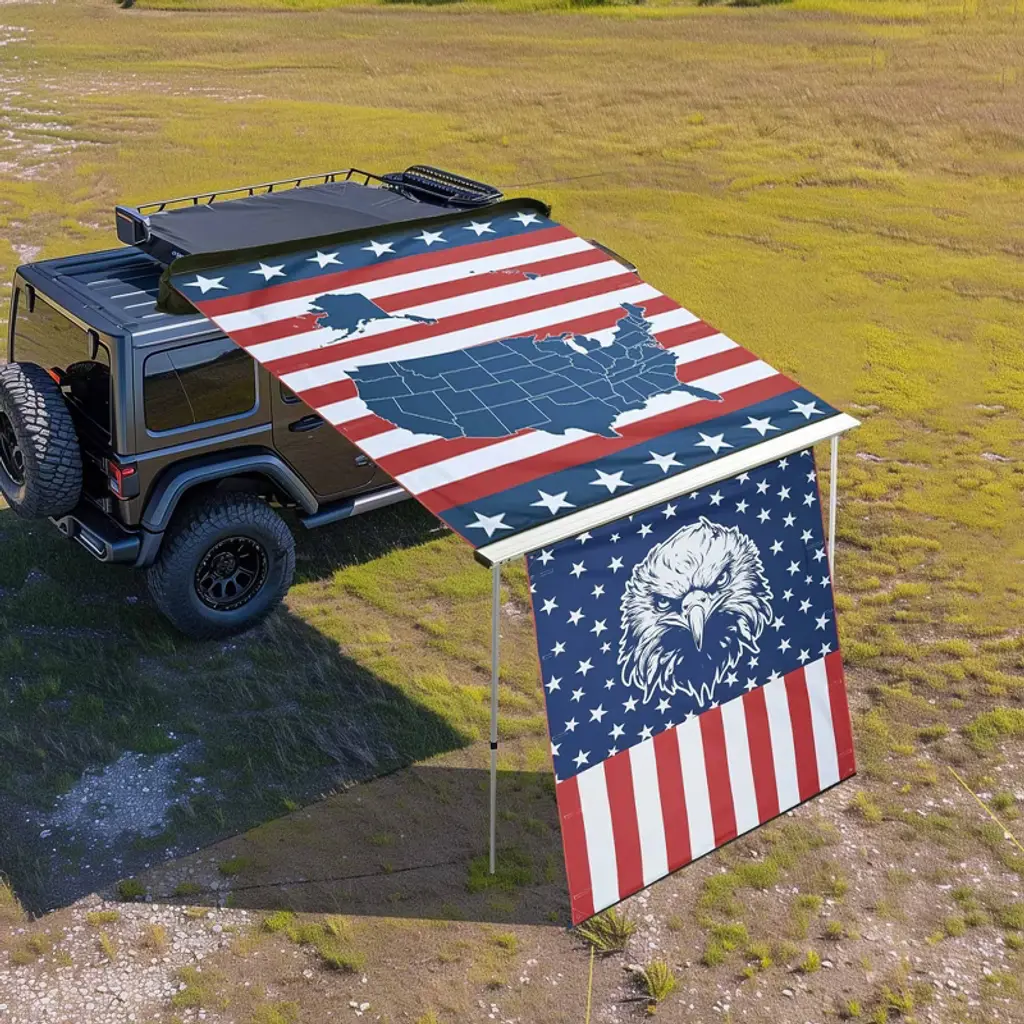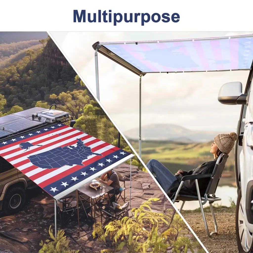 Features:- Replacement Fabric- Show Your American Pride - 8 1/6 x 7 3/4 ft Replacement Canopy for Car Side Awning presents a vividly printed US map with patriotic stars & stripes on the background, perfect decoration to upgrade the look of camper van and proudly show your patriotism and respect for this country, making your trip more memorable when celebrating holidays like the Patriots' Day, Fourth of July, Memorial Day, Veterans Day, Emancipation Day- High Compatibility - This replacement fabric is appliable to all brands of car side awnings in the same size and fits our awning model: YES0433, YES0434, YES0439, YES0440, please confirm the size of your awning before purchase- UV30+ Protection - Made of Oxford fabric for wear-and-tear resistance, the canopy features UV30+ protection to block out harmful sunray and prevent you from getting sunburned while enjoying camping or tailgate party for leisure moments- Sidewall- Show Your American Pride - 6 3/4 x 6 1/3 ft Extension Canopy for Car Side Awning features a vivid bald eagle with patriotic stars and stripes on the background, perfect decoration to demonstrate your patriotism for this country and boost the festive atmosphere for Independence Day, Memorial Day, Veterans Day, Patriots' Day, Emancipation Day- Durable & Anti-UV - Made of Oxford fabric with tear resistance and UV30+ protection, this extension canopy effectively keeps out of the hot sun from the side for protecting your delicate skin while enjoying outdoor campingSpecifications:- Replacement Fabric- Overall Size(LxW) 8 1/6 ft x 7 3/4 ft (250 x 236 cm)- Net Weight 2.8 Lbs (1.25 kg)- Sidewall- Overall Size(LxW) 6 3/4 ft x 6 1/3 ft (205.5 x 194 cm)- Net Weight 2.9 Lbs (1.3 kg)Package Contents:- 1x Replacement Canopy for Car Side Awning- 1x Extension Canopy for Car Side Awning- 2x Ground Stakes- 2x Guy Ropes- 2x Manuals