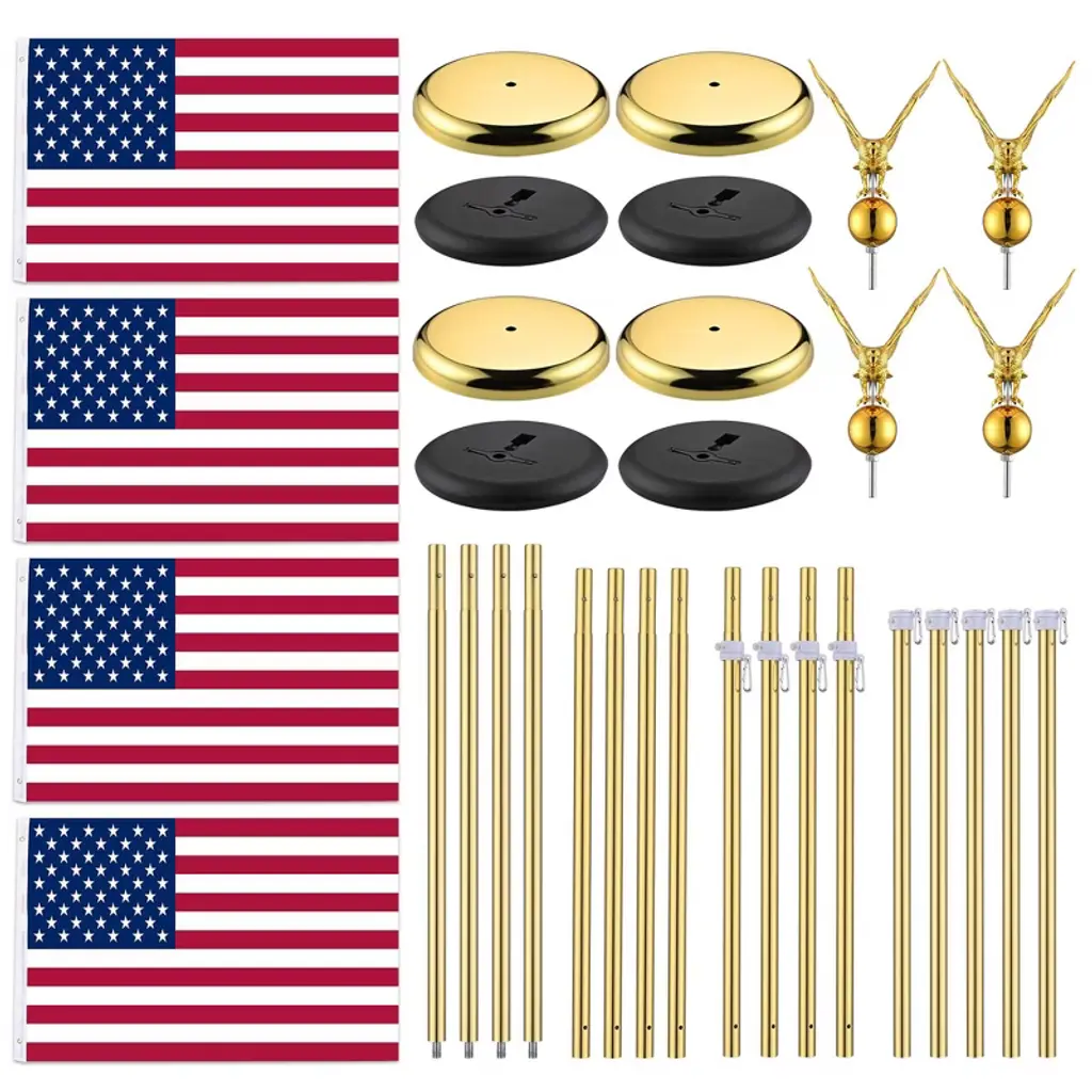 Features:- 4 Pack Flagpole Kits - Consists of 4 pcs 8 ft indoor sectional flagpoles, 4 pcs eagle toppers, 4 pcs US flags, and 4 pcs gold bases, unpack to display the national flag indoors and elevate your space with a touch of reverence for office, government agencies, city hall, or military ceremonies- Gleaming Golden Look - boasts a flying eagle finial with a gold ball underneath as the emblem of the US, embodying the honor and pride of this great country to show your patriotism, and the glossy gold color decorates the national flag for a more particular and exquisite look- Strong Construction - Flagpole features heavy-duty aluminum construction for premium resistance to rust and erosion to ensure a longer lifespan, and a strong base stand can be filled with water to keep the flagpole stable- Tool-free Installation - Easy to assemble without using any tool, just connect sectional poles, attach the flag to the flagpole, pour water into the base, and finally rotate the flagpole into the base firmly; Detachable design for space-saving storage when not in use- Tangle-Free Design - Built-in rotatable rings on the pole prevent the flag from being tangled or furled for a neat display, while the bottom ring can be easily adjusted to any position & fastened by a knobSpecifications:- Overall Dimension(Dia.xH) 9 13/16" x 9 1/12 ft (25 x 276 cm)- Base Dimension(Dia.xH) 9 13/16" x 1 5/16" (25 x 3.1 cm)- Flag Size(LxW) 4 11/12 ft x 2 11/12 ft (151 x 90 cm)- Top Pole Size(Dia.xL) 1" x 25 1/16" (2.5 x 63.7 cm)- Middle Pole Size(Dia.xL) 1" x 27 5/16" (2.5 x 69.3 cm)- Bottom Pole Size(Dia.xL) 1" x 28 3/8" (2.5 x 72 cm)- Net Weight 14.3 Lbs (6.5 kg)Package Contents:- 4x American National Flags- 4x Bases- 4x Base Covers- 4x Eagle Toppers- 4 Sets of Sectional Poles (4 pcs for each set)- 2x Manuals- Package Content:- 4x Flags- 4x Bases