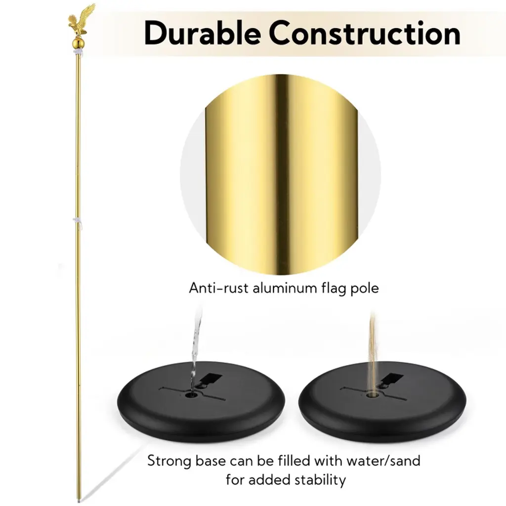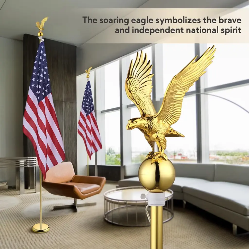 Features:- Gleaming Golden Look - This 8 ft Indoor Flag Pole Kit boasts a flying eagle finial with a gold ball underneath as the emblem of the US, embodies the honor and pride of this great country to show your patriotism, and the glossy gold color decorates the national flag for a more particular and exquisite look- Strong Construction - Flagpole features heavy-duty aluminum construction for premium resistance to rust and erosion to ensure a longer lifespan, and a strong base stand can be filled with water to keep the flagpole stable- Tool-free Installation - Easy to assemble without using any tool, just connect sectional poles, attach the flag to the flagpole, pour water into the base, and finally rotate the flagpole into the base firmly; Detachable design for space-saving storage when not in use- Tangle-Free Design - Built-in rotatable rings on the pole prevent the flag from being tangled or furled for a neat display, while adjustable bottom ring with a fastening knob for fixing in any position- All-Inclusive Flagpole Set - This kit consists of 2 pcs 8 ft indoor sectional flagpoles, 2 pcs eagle toppers, 2 pcs US flags, and 2 pcs gold base stands, one combo for everything you need to display the national flag indoors and elevate your space with a touch of reverence for office, government agencies, city hall, or military ceremonySpecifications:- Base Dimension(Dia.xH) 9 13/16" x 1 5/16" (25 x 3.1 cm)- Flag Size(LxW) 4 11/12 ft x 2 11/12 ft (151 x 90 cm)- Top Pole Size(Dia.xL) 1" x 25 1/16" (2.5 x 63.7 cm)- Middle Pole Size(Dia.xL) 1" x 27 5/16" (2.5 x 69.3 cm)- Bottom Pole Size(Dia.xL) 1" x 28 3/8" (2.5 x 72 cm)- Net Weight 7.2 Lbs (3.25 kg)Package Contents:- 2x American National Flags- 2x Bases- 2x Base Covers- 2x Eagle Toppers- 8x Sectional Poles- 1x Manual