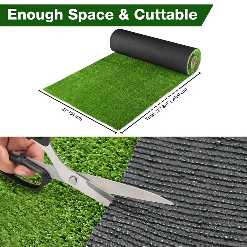 Features:- Realistic Synthetic Grass Mat - 65x3 Ft Artificial Grass Turf with 3/8" grass blades height provides a lush look & soft touch like natural grass, unaffected by the weather; Perfect for indoor or outdoor decoration- Durable Material - Made of wear-resistant PP material which is SGS certificated for ensuring exceptional fire resistance, along with UV-resistant rubber backing, making it not easy to fade and break, providing long lifespan up to 15 years- Fast Draining & Easy Cleaning - Drainage holes which are 5 7/8" to 11 13/16" apart from each other and located on the rubber backing for effective water draining; Easy to clean with water or damp cloth and dry quickly for saving your time- Cuttable & Customizable - Cut the turf in any size as you need to perfectly fit for various areas: small size as a grass pee pad for your pets and large size as a decoration or large lawn for home, garden or balcony- Wide Application - Ideal for using on roofs, balconies, patios, swimming pools, gardens, schools, amusement parks, etc. to add natural vitality, it provides multipurpose applications such as grass backdrop for photographers, home golf simulator for golf enthusiasts, play area for kids, and grass turf for fish tank and turtle basking platformSpecifications:- Overall Dimension(LxW): 787 3/8" x 37" (20 x 0.94 m)- Grass Blades Height: 3/8" (1 cm)- Gauge: 3/16" (0.48 cm)- Grass Density: 60000- Material: PP- Net Weight: 37.48 Lbs (17 kg)Package Contents:- 1x Artificial Grass Mat- 1x ManualNotice: - 1.The color shown on the screen may differ slightly from the actual product.- 2.Please note that the artificial grass mat is fire retardant at a normal degree. However, it is not completely fire retardant, please ensure that you do not expose it to fire or other heating sources.