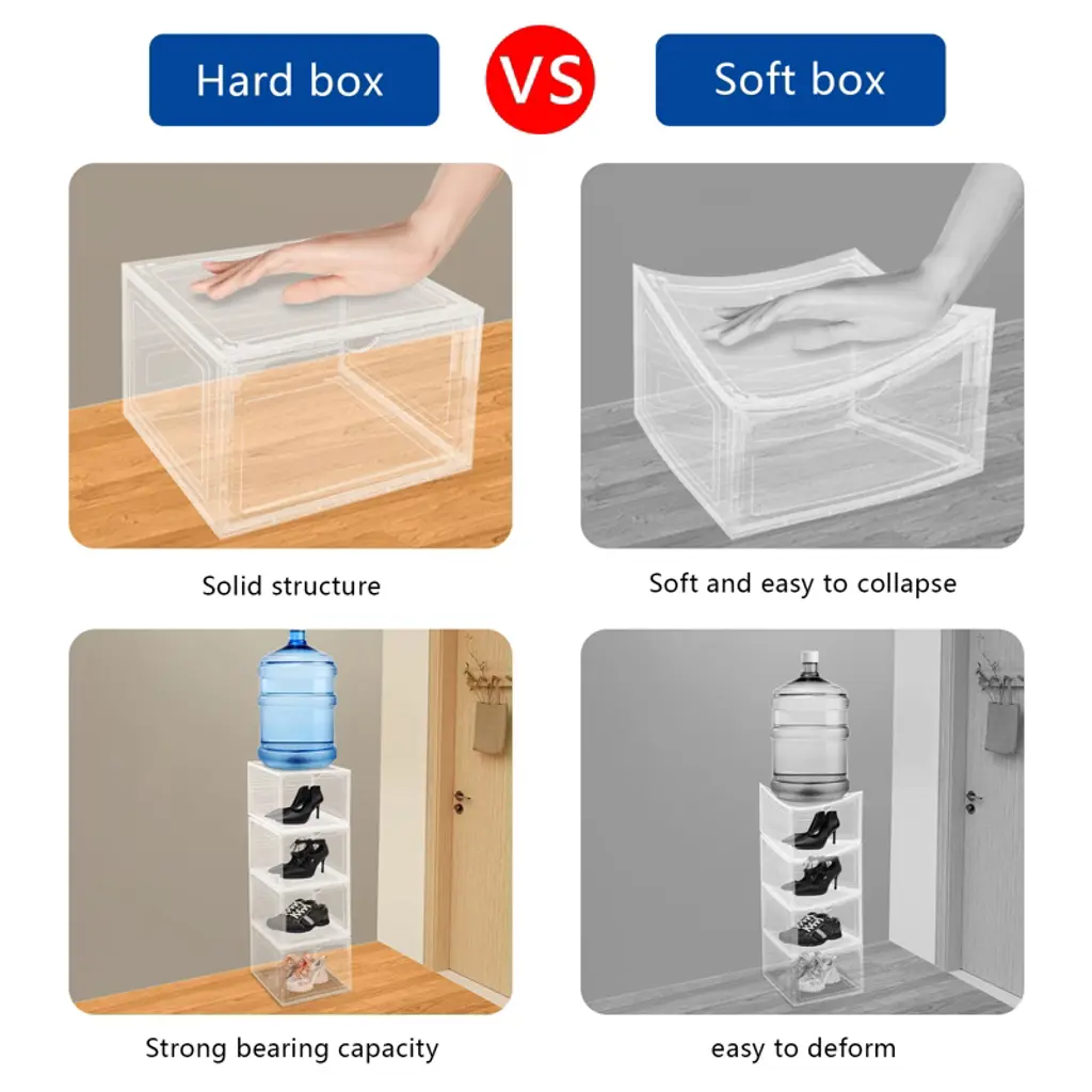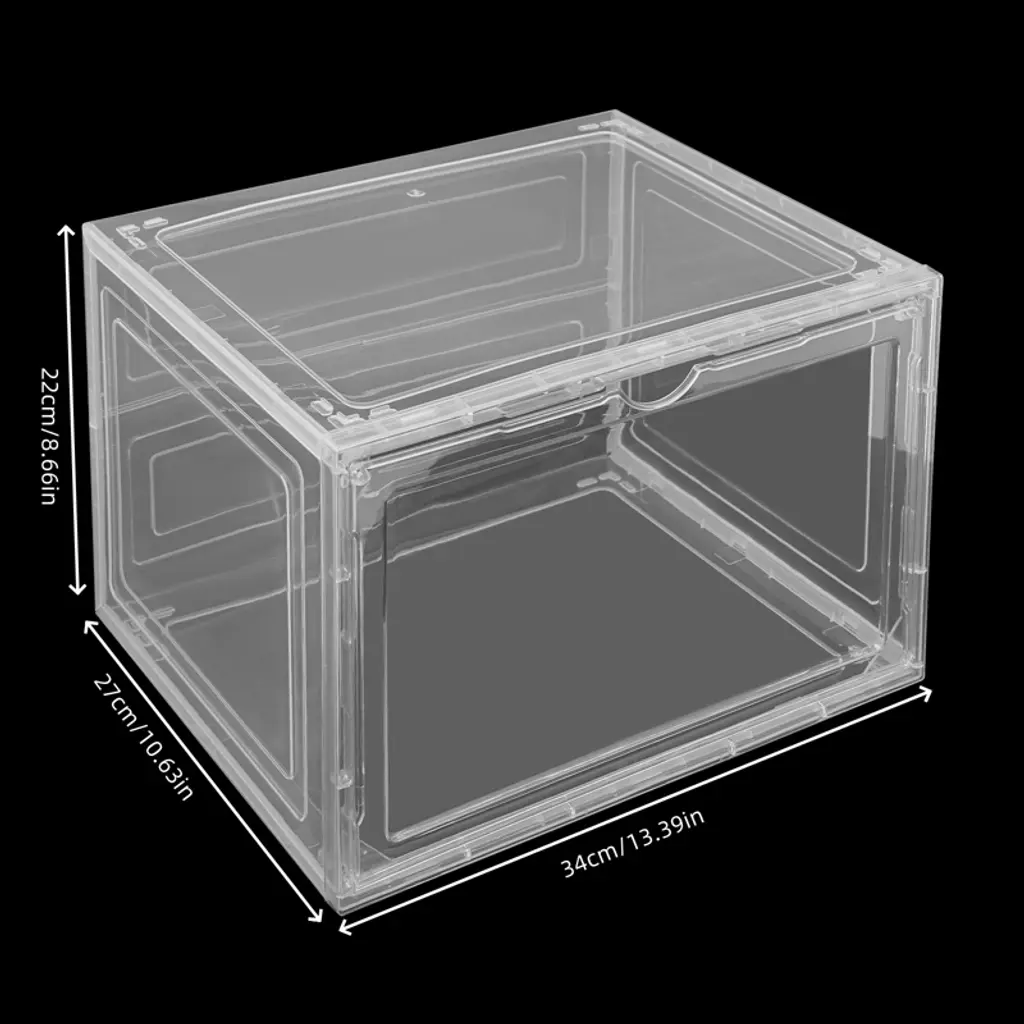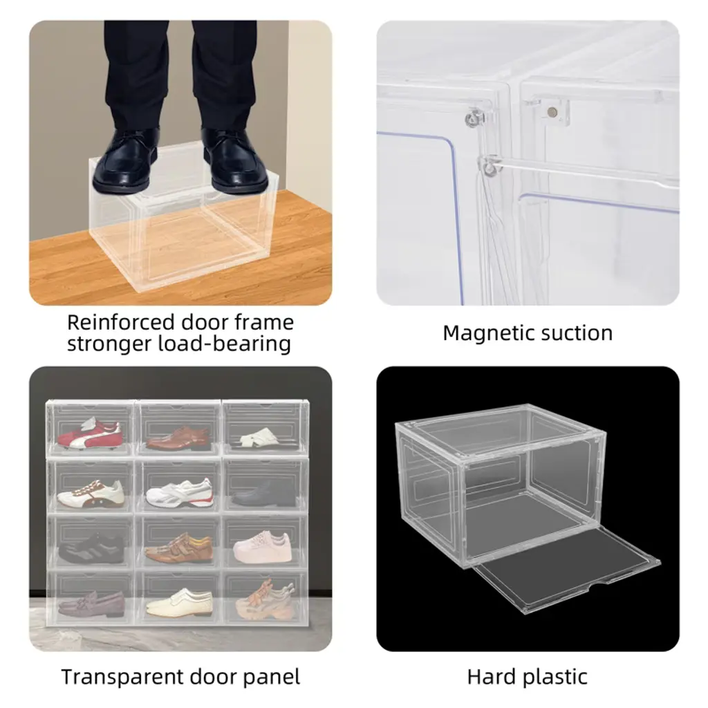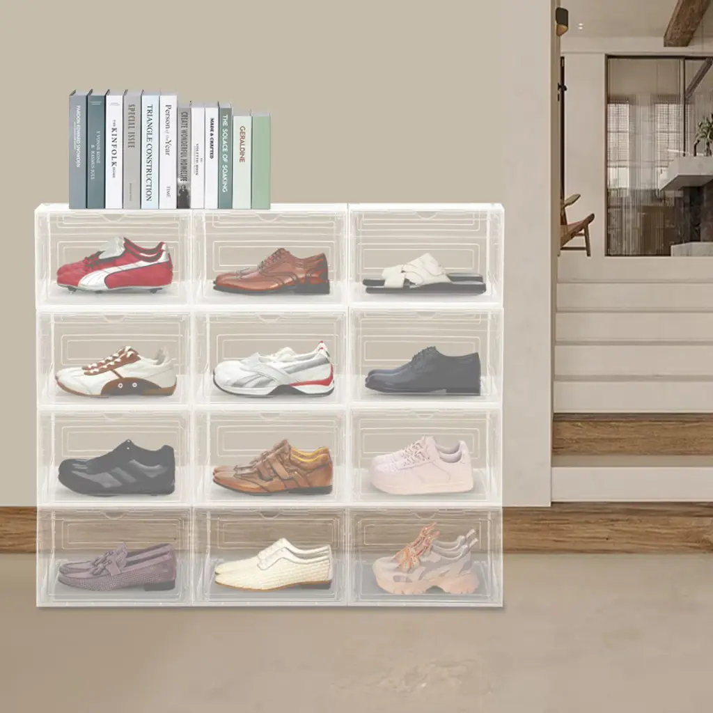 These 12 stackable shoe boxes are a stylish and practical storage solution. Made from durable PP and acrylic, they feature a smooth, glossy finish and strong magnetic closures to protect your shoes. The semi-transparent design and flap doors make it easy to see and access your items, even when stacked. Their versatile size accommodates various shoes or other belongings, and they can be neatly stacked to save space, making them ideal for closets, bedrooms, and more. Lightweight and easy to clean.