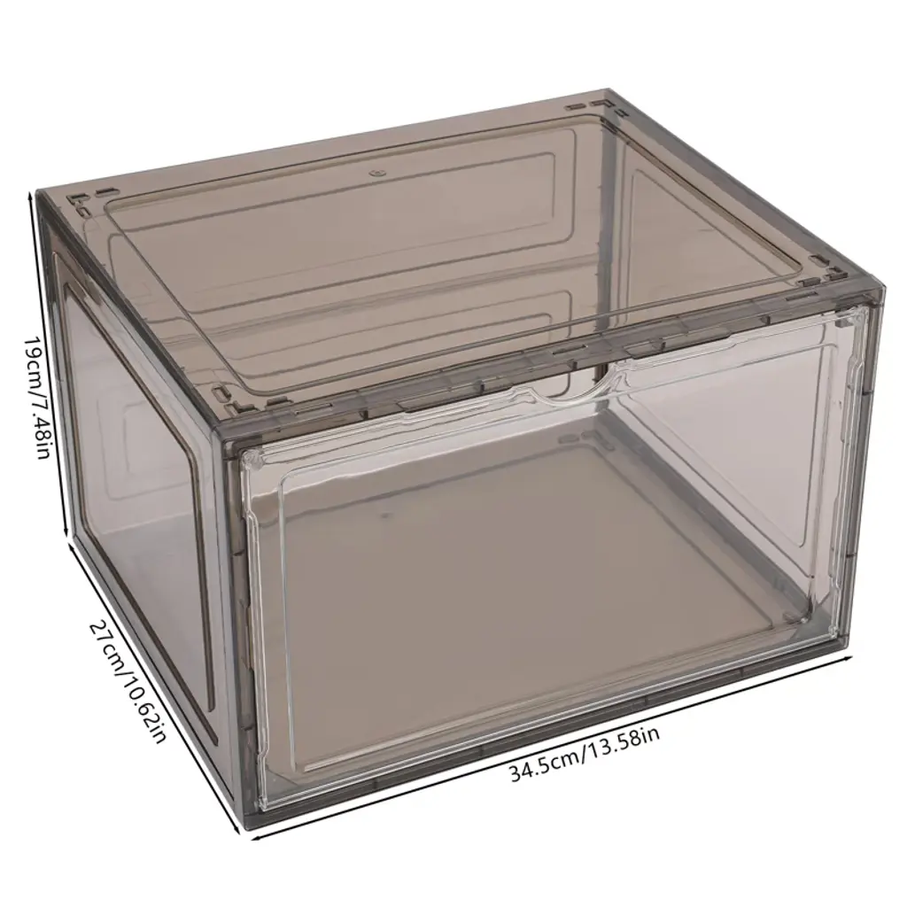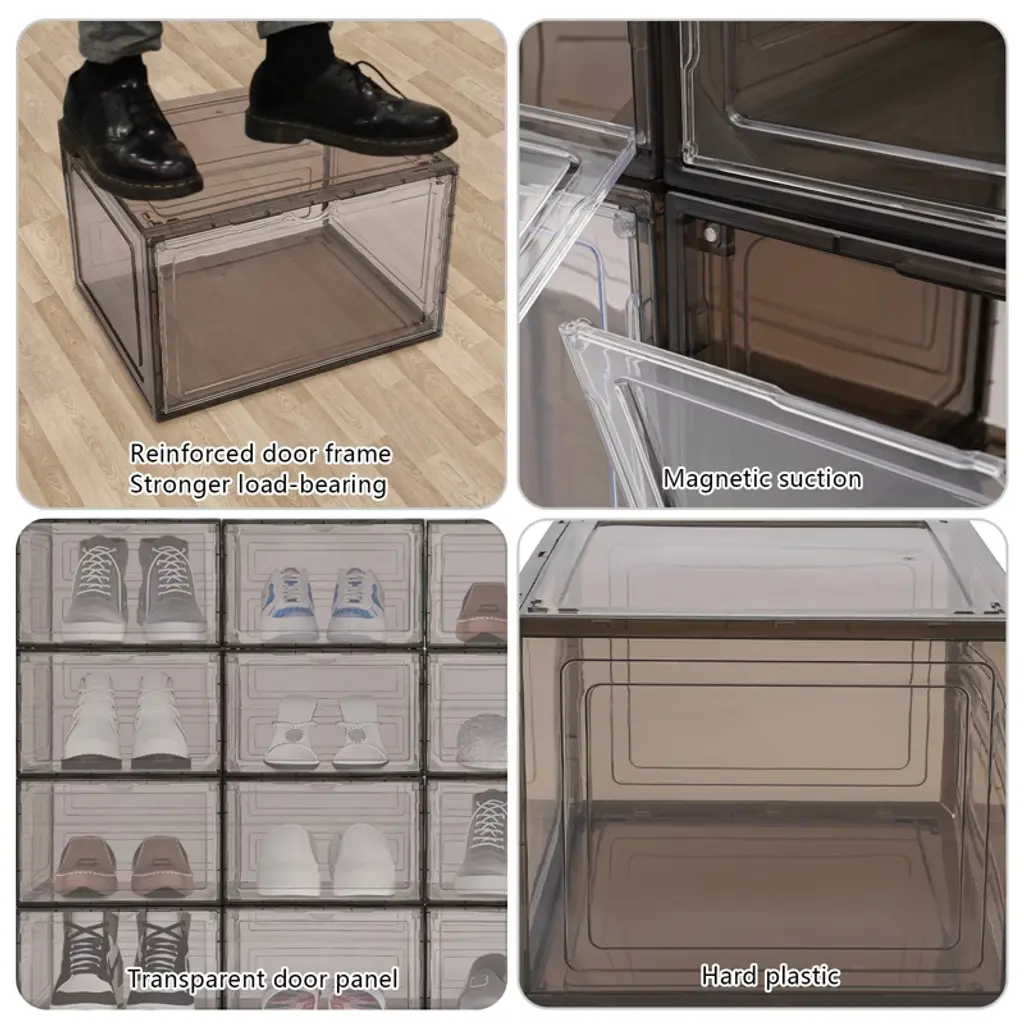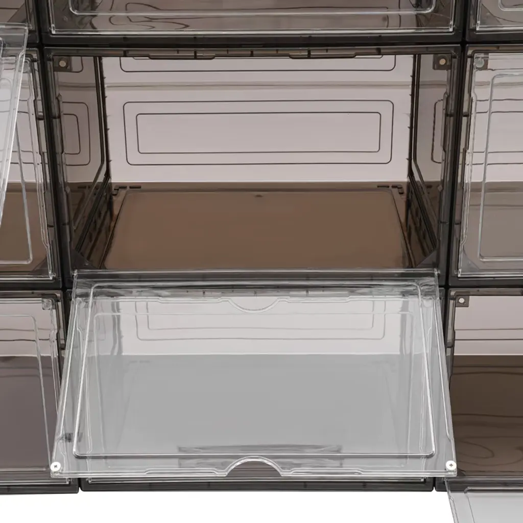 These 12 stackable shoe boxes are a stylish and practical storage solution. Made from durable PP and acrylic, they feature a smooth, glossy finish and strong magnetic closures to protect your shoes. The semi-transparent design and flap doors make it easy to see and access your items, even when stacked. Their versatile size accommodates various shoes or other belongings, and they can be neatly stacked to save space, making them ideal for closets, bedrooms, and more. Lightweight and easy to clean.