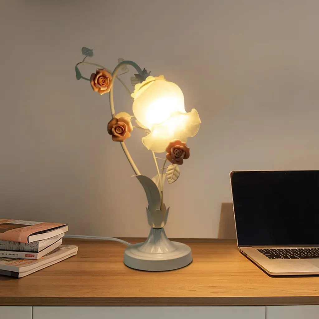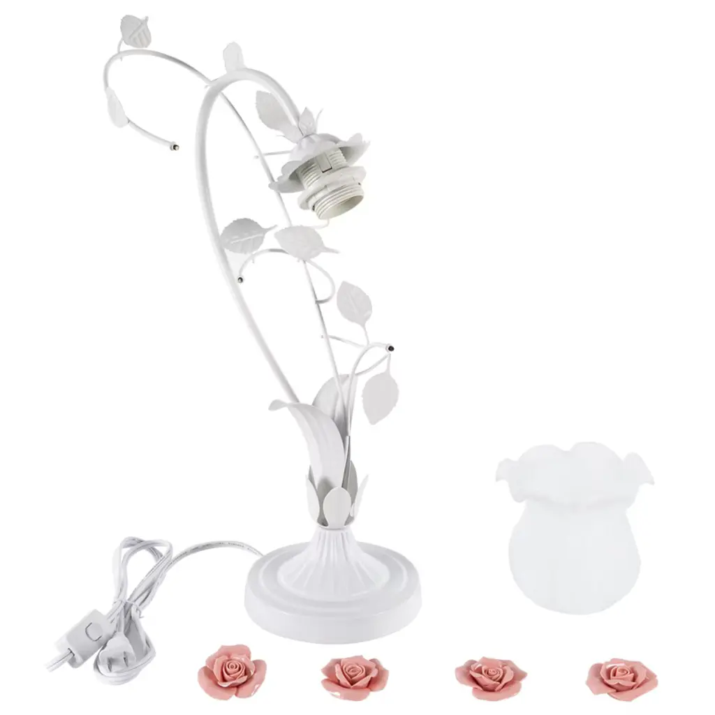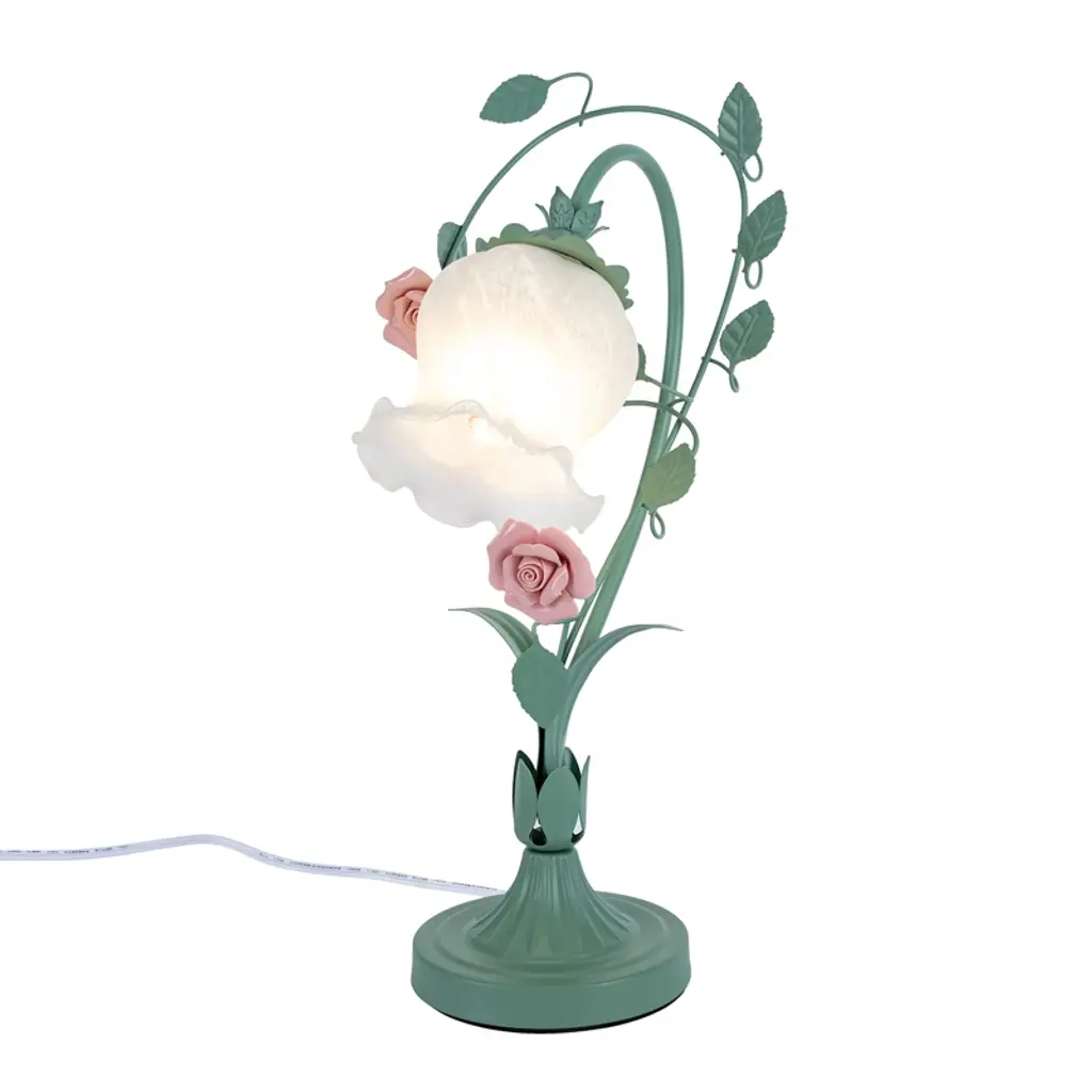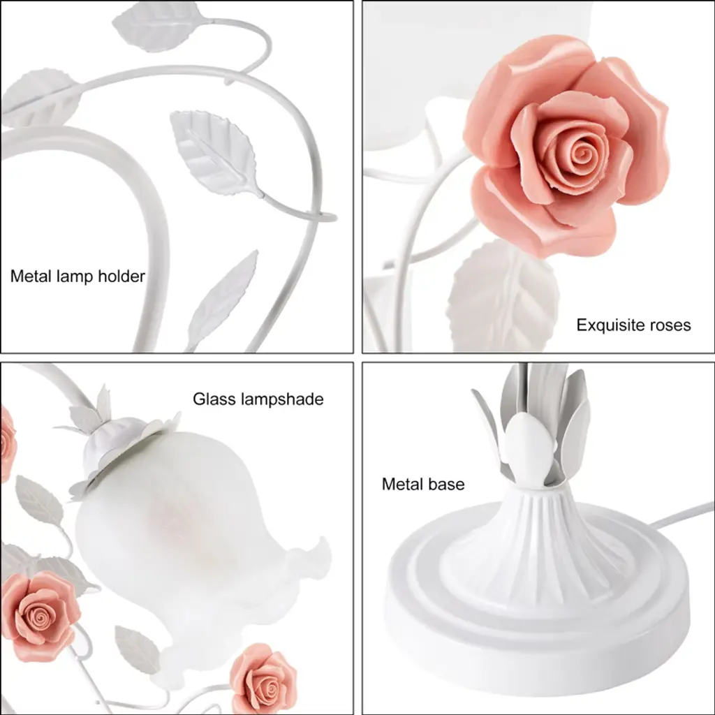 This exquisite flower table lamp features lifelike roses and a hand-blown glass lampshade that casts a soft, romantic glow, adding elegance to any room. Crafted from durable ceramic, glass, and hardware, it combines artistry with stability, thanks to a weighted base and anti-slip design. The lamp is easy to operate with a 5.25 ft corded switch and uses a standard E26 bulb (not included). Ideal for bedrooms, living rooms, or as a thoughtful gift, it blends beauty, function, and lasting craftsmanship in a compact, stylish form. Specification Color: Green, Pink Style: Modern Material: Glass, Hardware, Ceramic Process: Painting, Handmade, Machine Stamping, Hand Blowing, Brushed Light Source:1* E26 Bulb(Not Included) Max. Bulb Power: 60W Assembly Required: Yes Mounting Type: Tabletop Light Direction: Downlight Lamp Type: Table Lamp Power Source: Corded Electric Plug: US Standard Number of Items: 1 Efficiency: E Voltage: 110V Lighting Area: About 3-8m²/32.3-86.11ft² Power Cord Length: About 1.6m/5.25ft Lampshade Size(H*D): 13*13cm/5.12*5.12in Lamp Height: 43cm/16.92in Lamp Base Diameter: 14cm/5.51in