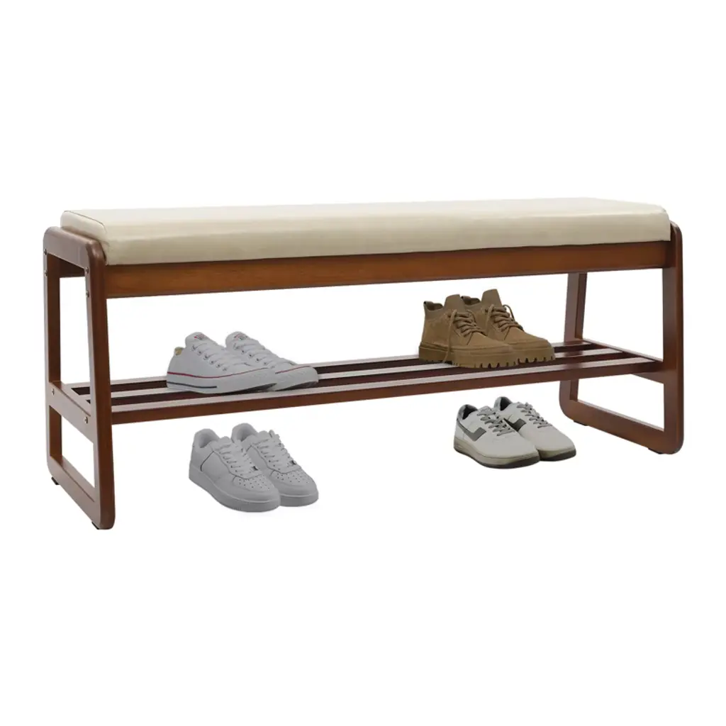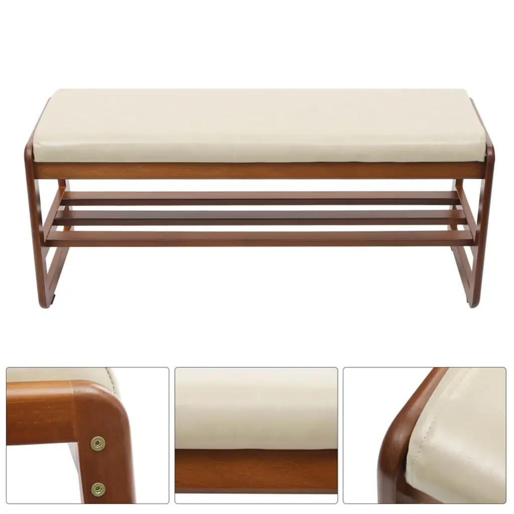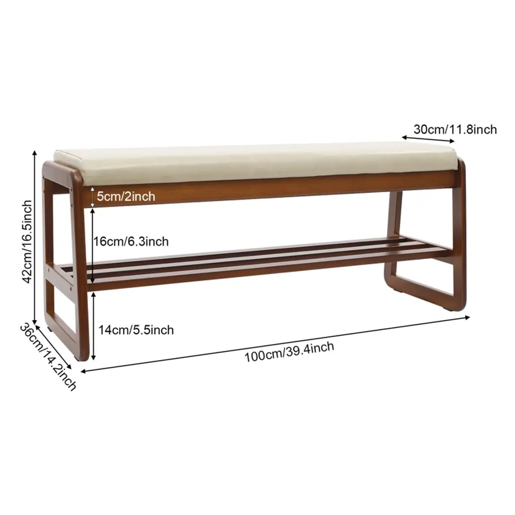 Elevate your entryway with this stylish and functional shoe rack bench, a perfect blend of modern elegance and practical design. It offers a comfortable, cushioned seat for changing shoes, while its two-tier shelving and open bottom space efficiently organize your footwear and promote air circulation to prevent odors. Constructed from premium, eco-friendly materials, this durable bench supports up to 330 lbs and features a sophisticated brown and gray finish that complements any decor. With its easy assembly and thoughtful details like rounded corners for safety, it’s the perfect piece to bring convenience and a touch of refinement to your home. Specifications Color: Gray+ Brown Style: Modern Shape: Rectangular Material: Density Board, Rubber wood, PU, Sponge Mount Type: Freestanding Assembly Required: Yes Load Capacity: About 150kg/330.69lbs Tier Spacing: 14cm/5.51in; 16cm/6.3in Cushion Width: 30cm/11.81in Product Size: 100*36*42cm/39.37*14.17*16.54in