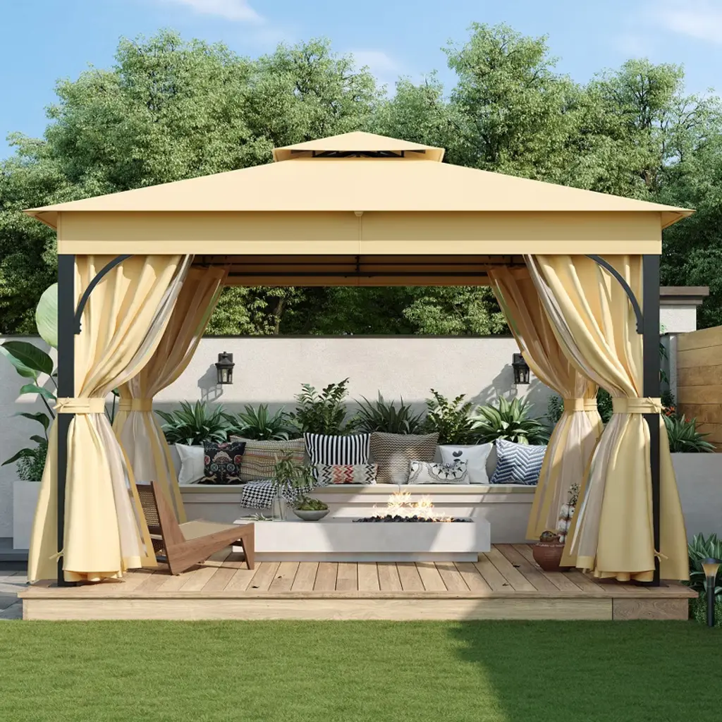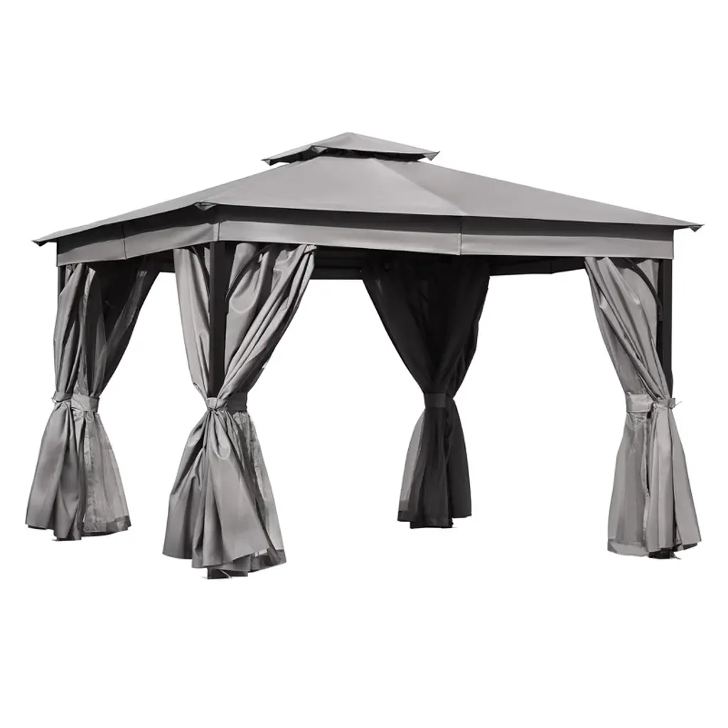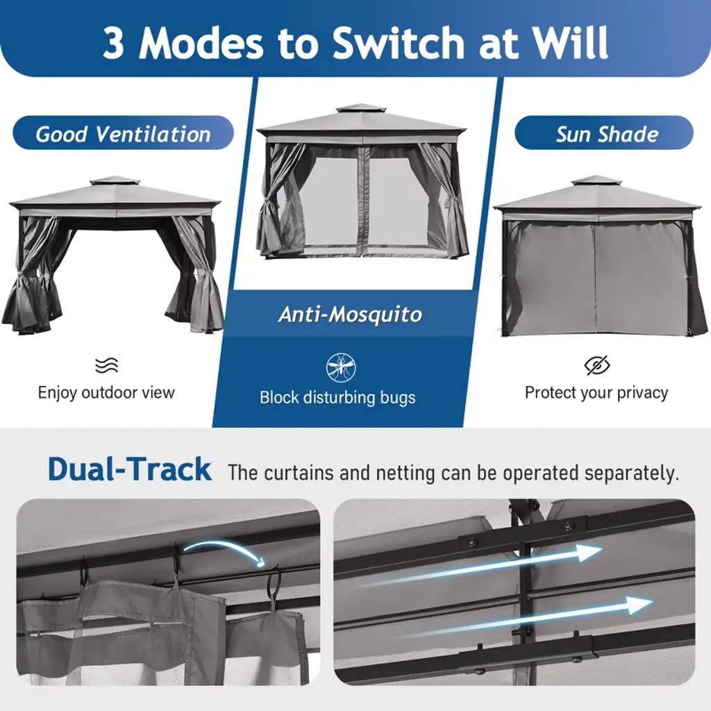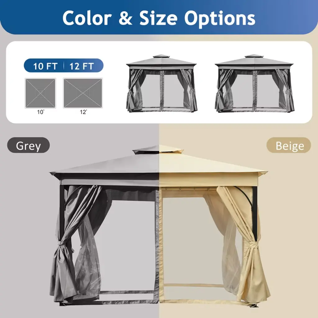 This 10x12 outdoor gazebo tent offers a durable and versatile solution for creating a comfortable outdoor space. With a reinforced steel structure and double-layer canopy roof, it provides exceptional stability and protection against various weather conditions. The gazebo features ventilated dual-roof design to reduce heat buildup, durable curtains and mosquito netting for privacy and protection, and ample space for entertaining. Available in two elegant colors and sizes, this gazebo is perfect for backyards, gardens, lawns, and decks.