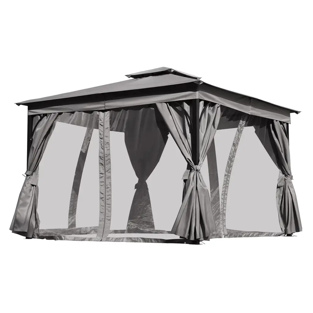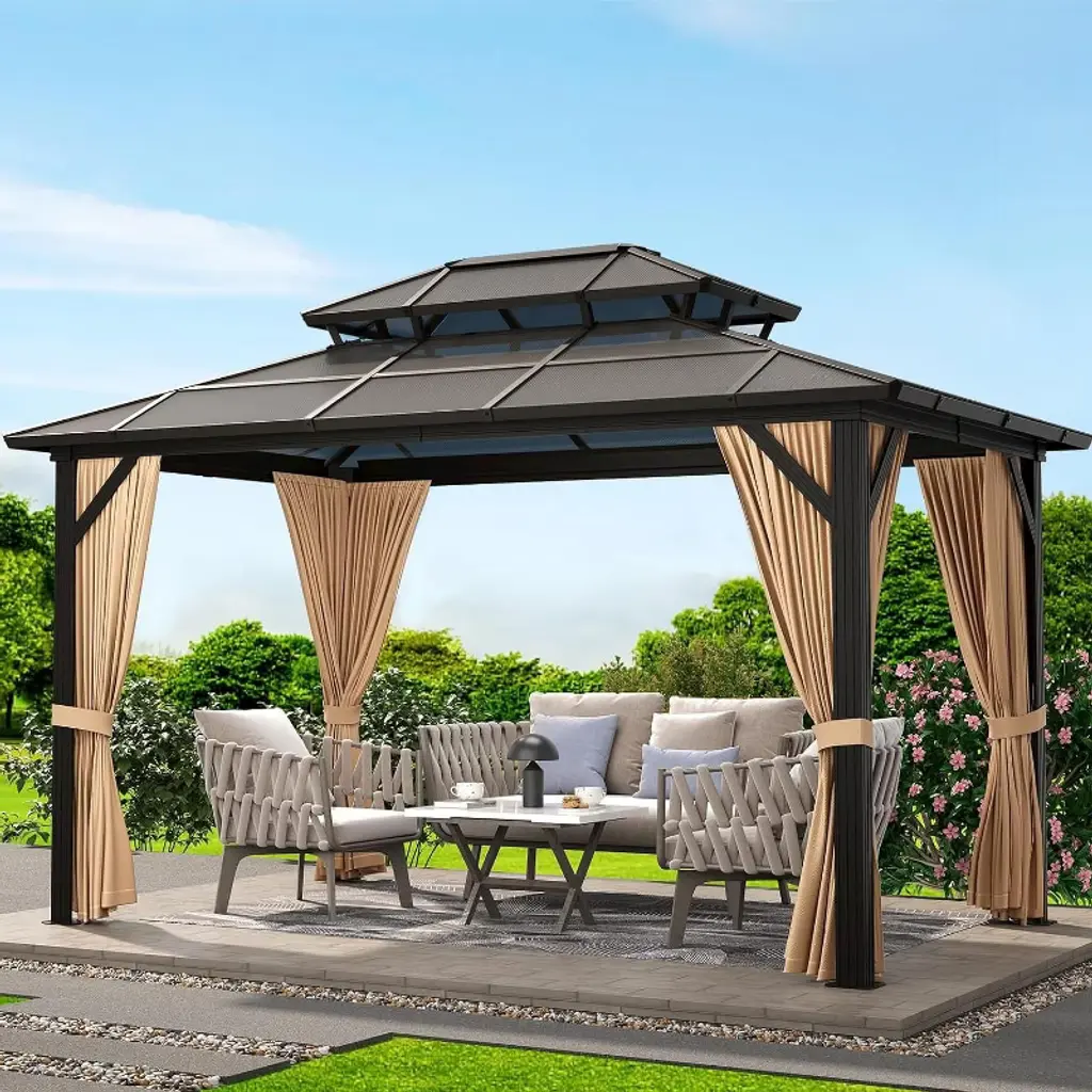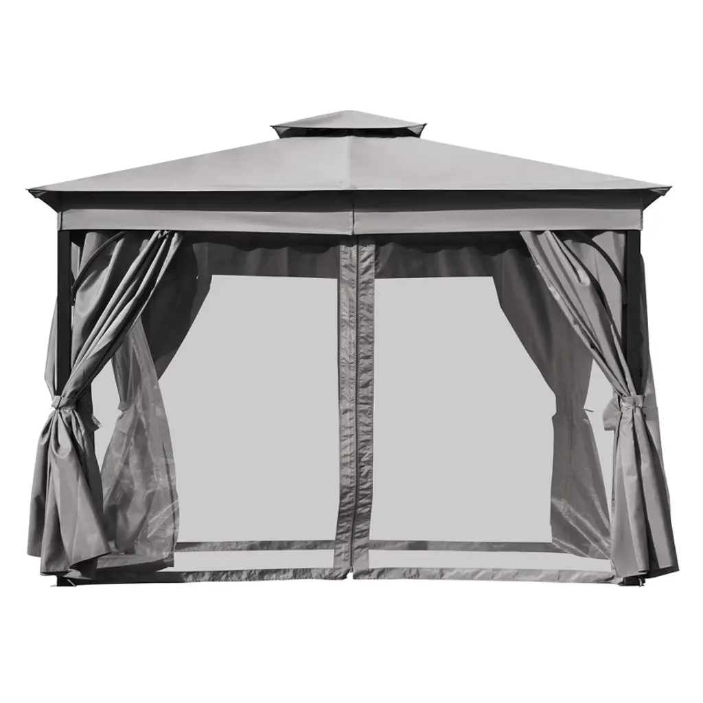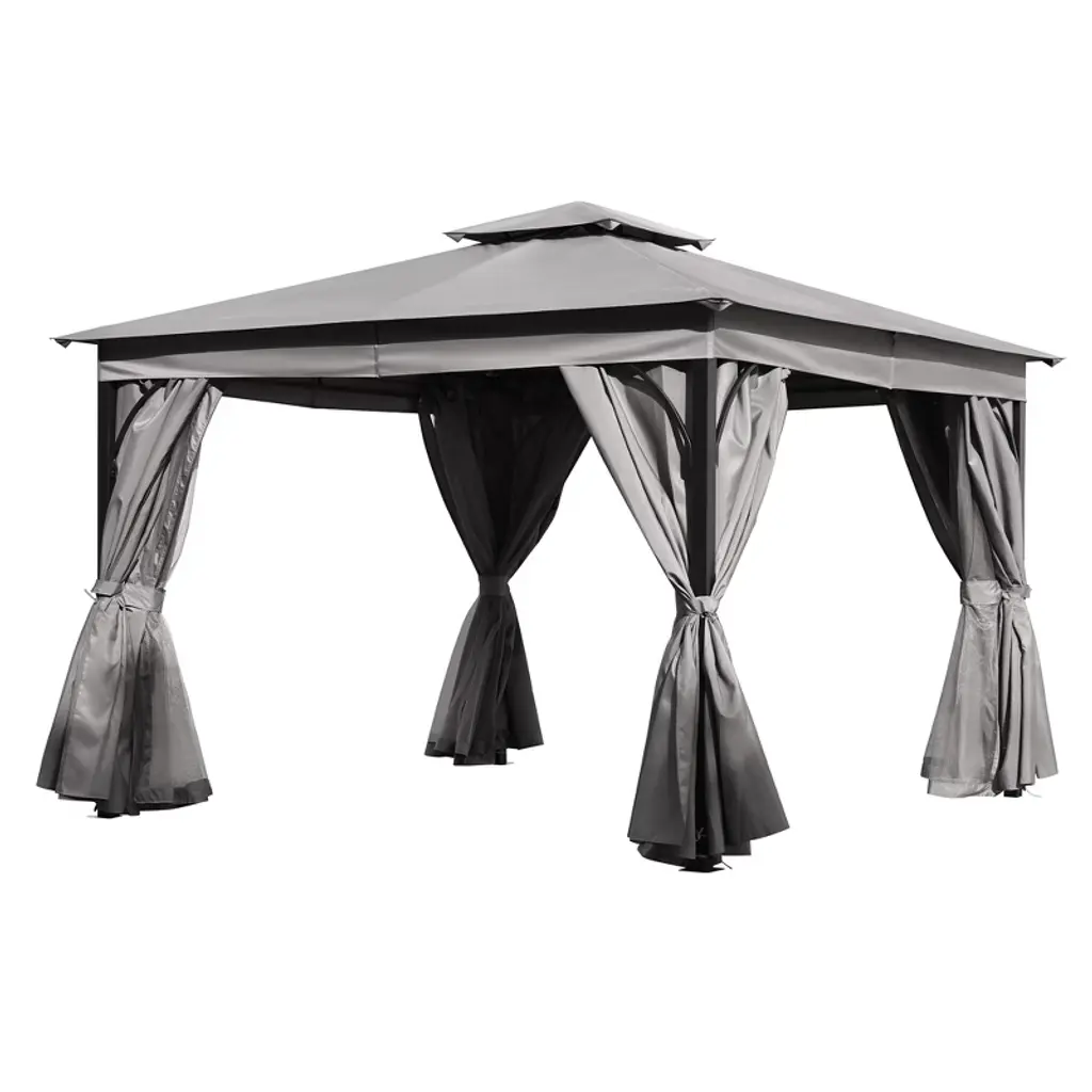 This 10x12 outdoor gazebo tent offers a durable and versatile solution for creating a comfortable outdoor space. With a reinforced steel structure and double-layer canopy roof, it provides exceptional stability and protection against various weather conditions. The gazebo features ventilated dual-roof design to reduce heat buildup, durable curtains and mosquito netting for privacy and protection, and ample space for entertaining. Available in two elegant colors and sizes, this gazebo is perfect for backyards, gardens, lawns, and decks.