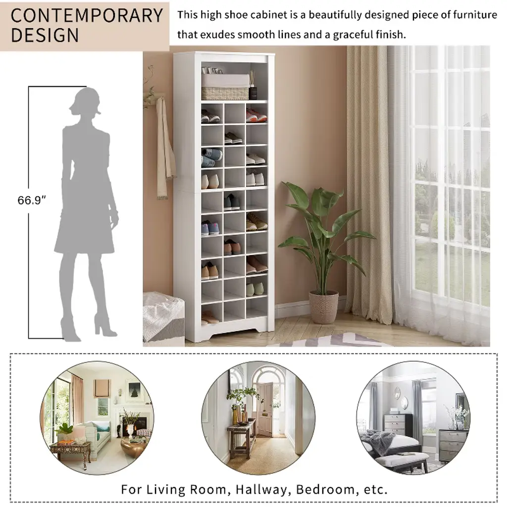 This 30-Cubby Shoe Console with Contemporary Design is a stylish and functional addition to any hallway or bedroom. The high shoe cabinet features smooth lines and a graceful finish, making it a beautifully designed piece of furniture. With 30 small square compartments, each capable of storing a pair of shoes, this cabinet offers ample storage capacity. Crafted from high-quality particle board and MDF, the cabinet is durable and strong, ensuring long-lasting use. Its versatile design allows it to be used as a storage cabinet for various items or as a decorative element to display art or plants.