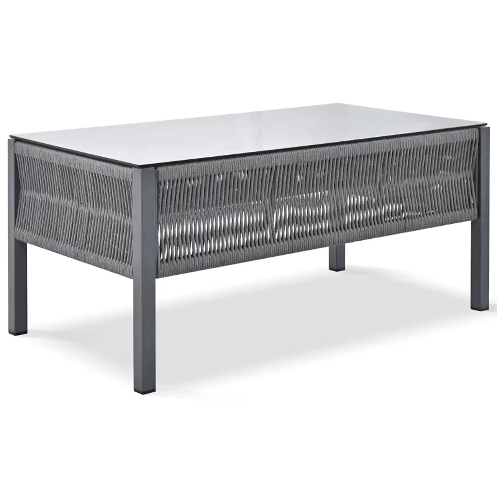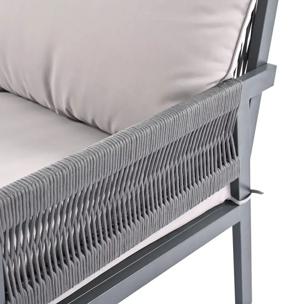 Elevate your outdoor area with this thoughtfully designed 4-piece set that blends contemporary patio aesthetics with timeless coastal farmhouse charm. The set includes a spacious loveseat, two comfortable armchairs, and a sleek rectangular coffee table topped with durable tempered glass. Each piece is crafted from solid metal, ensuring long-lasting resistance to weather and water. The seating showcases open, airy frames with gently curved arms and backs, beautifully accented by hand-woven rope detailing for a natural, inviting appeal. For added convenience, the cushion covers are removable and machine-washable, making maintenance simple after outdoor gatherings. Perfect for relaxing with family or entertaining guests, this set brings both style and functionality to your patio or garden.