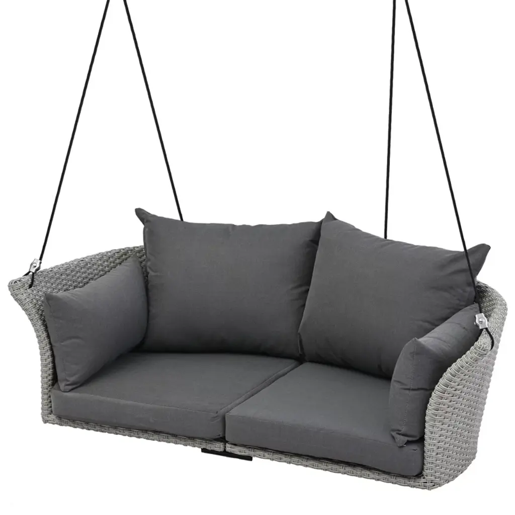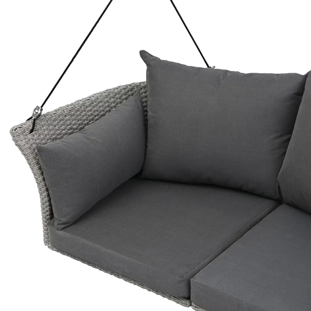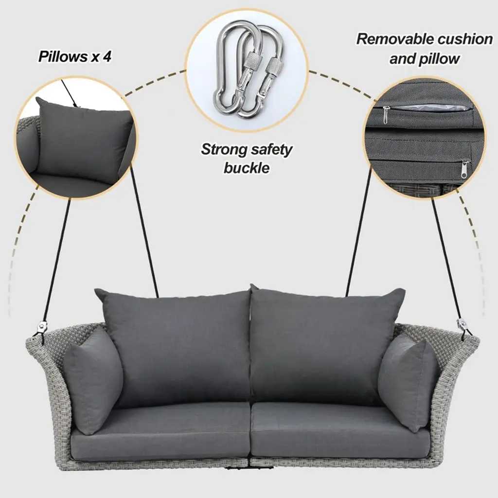 This outdoor swing offers a perfect spot for couples to relax and enjoy nature together. Crafted from durable black woven material, it features a waterproof and sun-resistant design, making it suitable for all weather conditions. The swing includes a thick seat cushion and plump pillows for ultimate comfort, while sturdy hardware and ropes ensure safety and longevity. With adjustable ropes and easy installation, this swing is both practical and stylish.